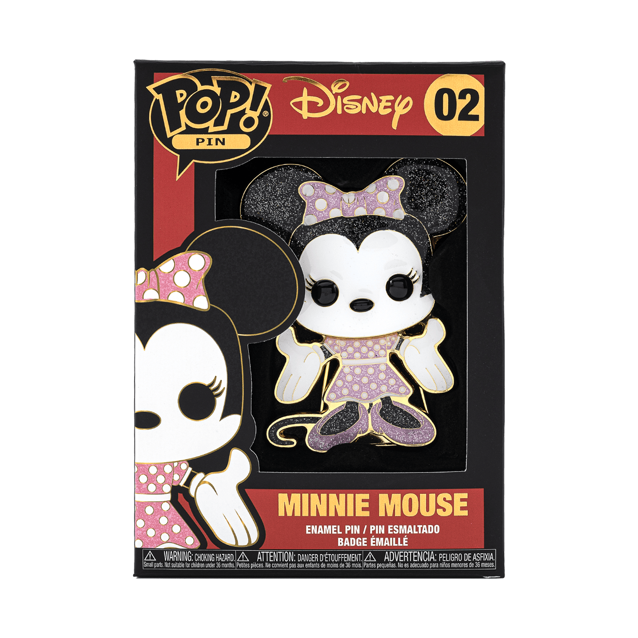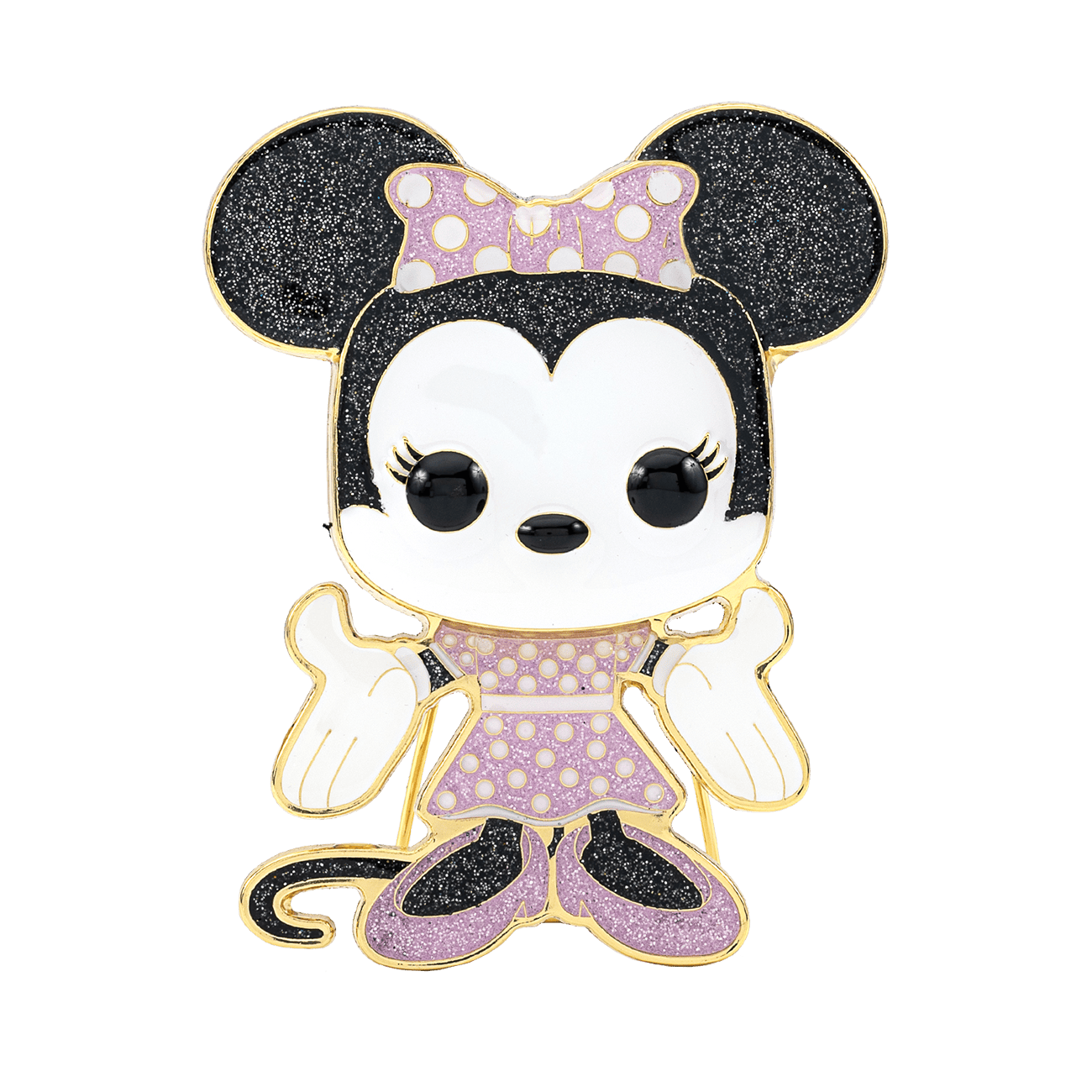 Minnie Mouse has been by Mickey's side since their debut in late 1928. Now you can take Minnie beyond the shelves of your Disney collection as a Pop! pin. Keep the classic and iconic Disney fashionista close, and embark on new shopping adventures together with Pop! pin Minnie. Pin features soft glitter enamel fill on a gold colored base metal. Enamel pin is approximately 3.5-inches tall.
