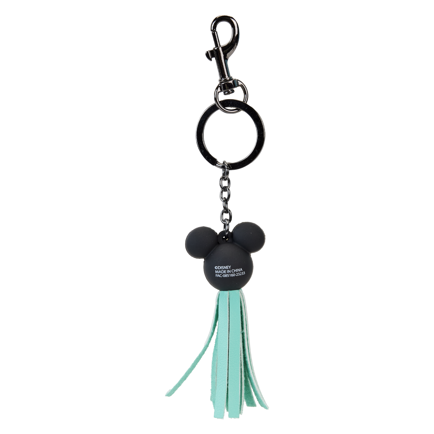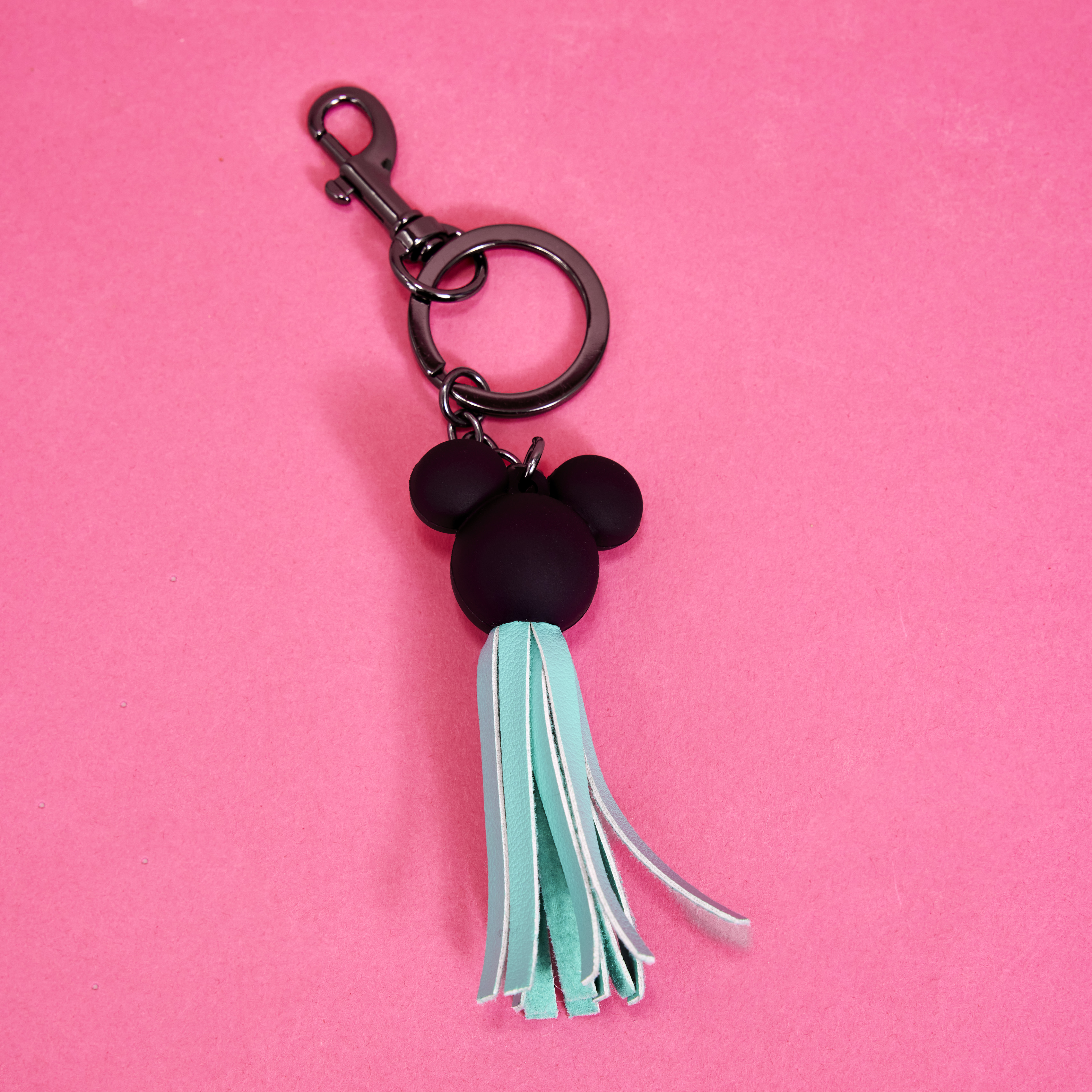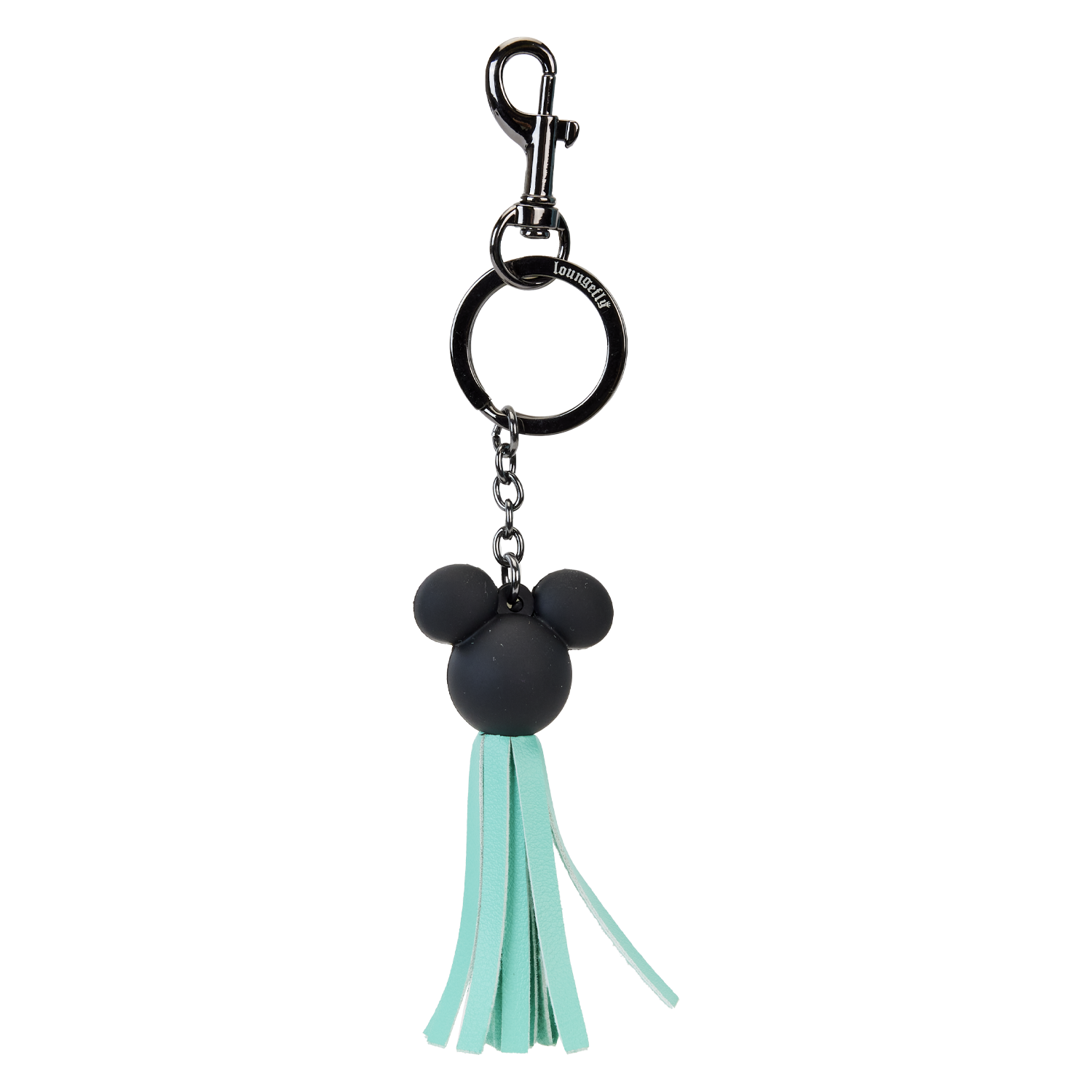 Bring on the charm! Top off your look with our Loungefly Disney100 Mickey Mouse Tassel Bag Charm. This 3D molded rubber charm features Mickey Mouse’s face and ears in black. A teal-blue tassel hangs below. Clip this charm onto any Loungefly bag to change things up a bit and add a pop of character to all your outings.