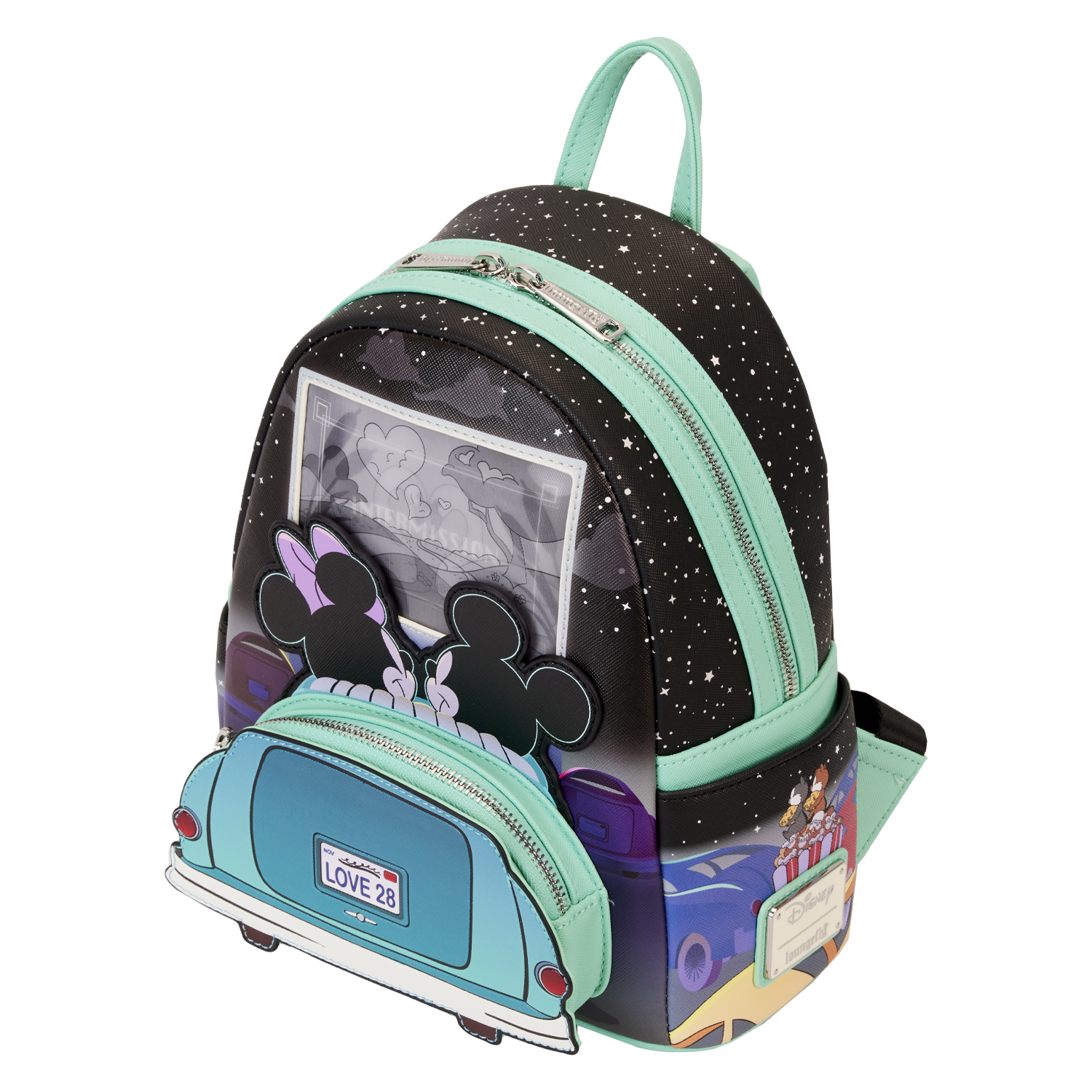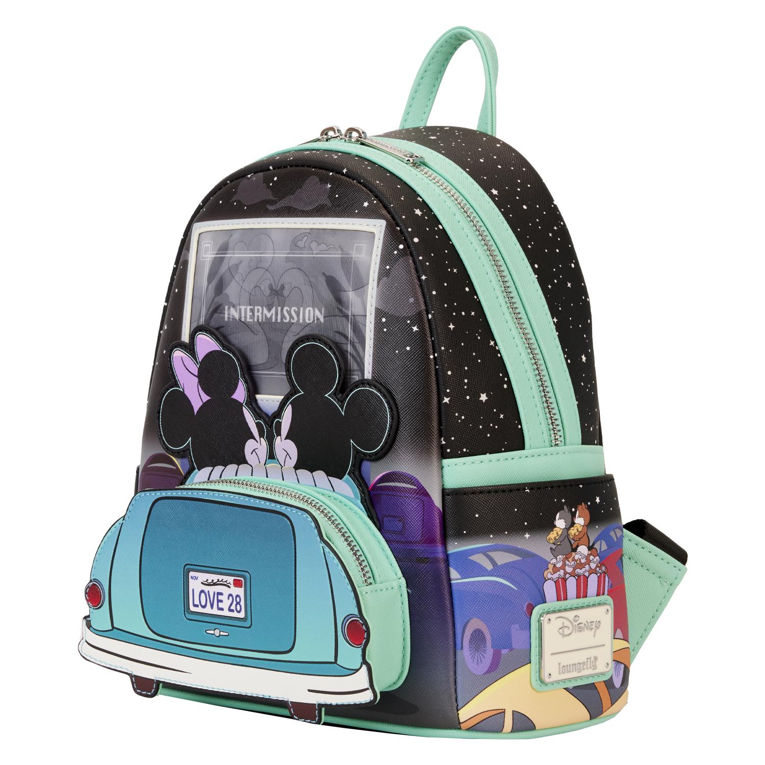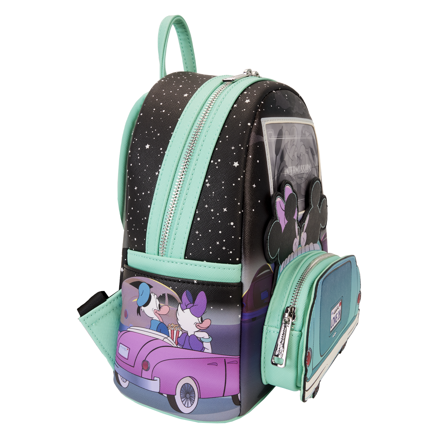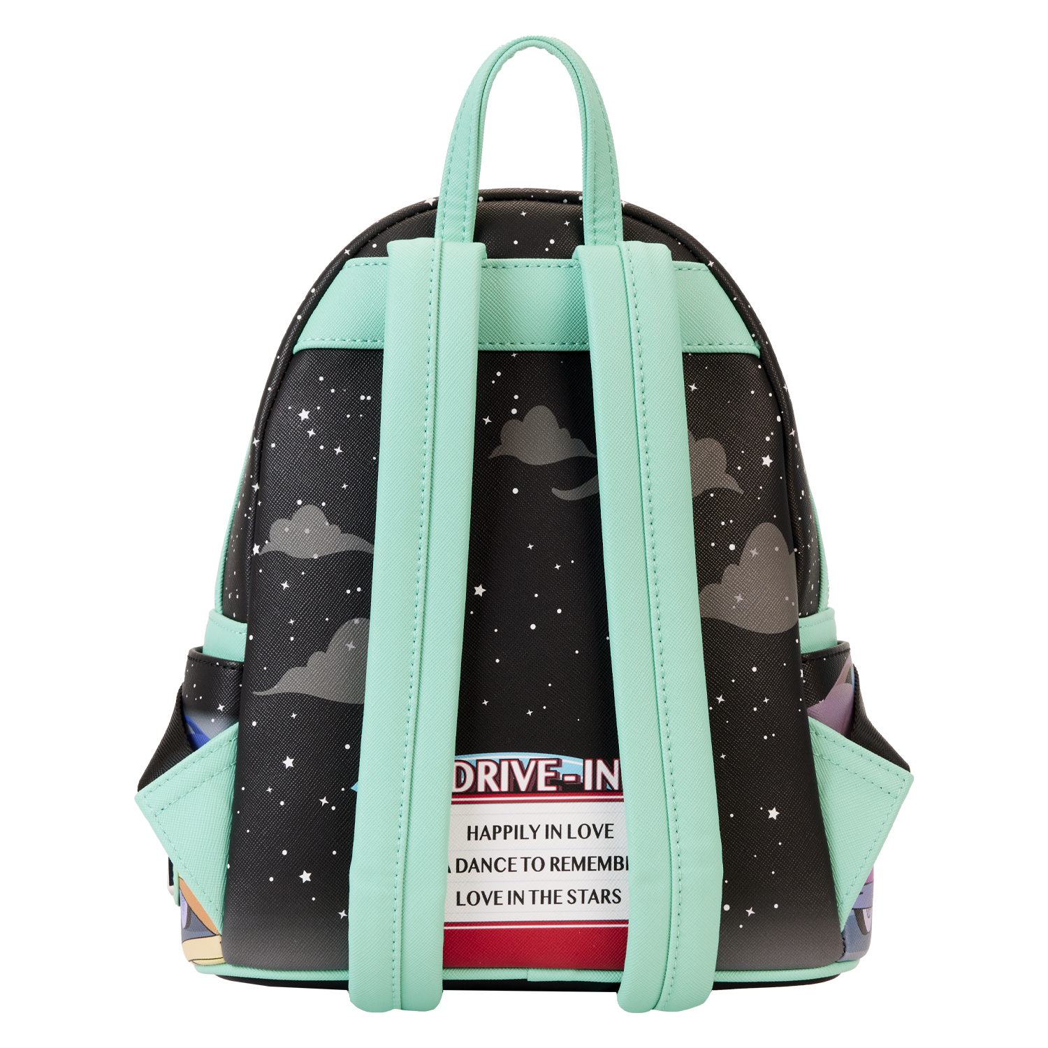 It’s a date! Plan fun outings with our Loungefly Disney Mickey Mouse and Minnie Mouse Date Night Drive-In Movie Mini Backpack. On the front, Disney’s Mickey Mouse and Minnie Mouse enjoy a drive-in movie—and you can look on to see the printed screen ahead of them. Lenticular details reveal various scenes that play out on the screen: a black-and-white road with hearts appearing in clouds and trees, the “Intermission” sign, and a black-and-white scene of two swans whose necks and beaks form a heart. Applique details bring Mickey and Minnie’s faces to life, and the car in which they’re seated is a front pocket. Above them, stars scatter against the night sky. The artwork continues on the side pockets, where you’ll find Disney’s Donald Duck and Daisy Duck on one panel. On the other panel, Disney’s Chip and Dale are perched on a popcorn bucket, and they’re enjoying a snack. The stars and the night sky carry over to the top of the backpack and the back, where a printed retro drive-in sign announces the line-up for the evening: Happily in Love, A Dance to Remember, and Love in the Stars. Straps and accents in teal blue add a pop of brilliant color. Bring your plus one and capture hearts wherever you go with this stylish backpack.