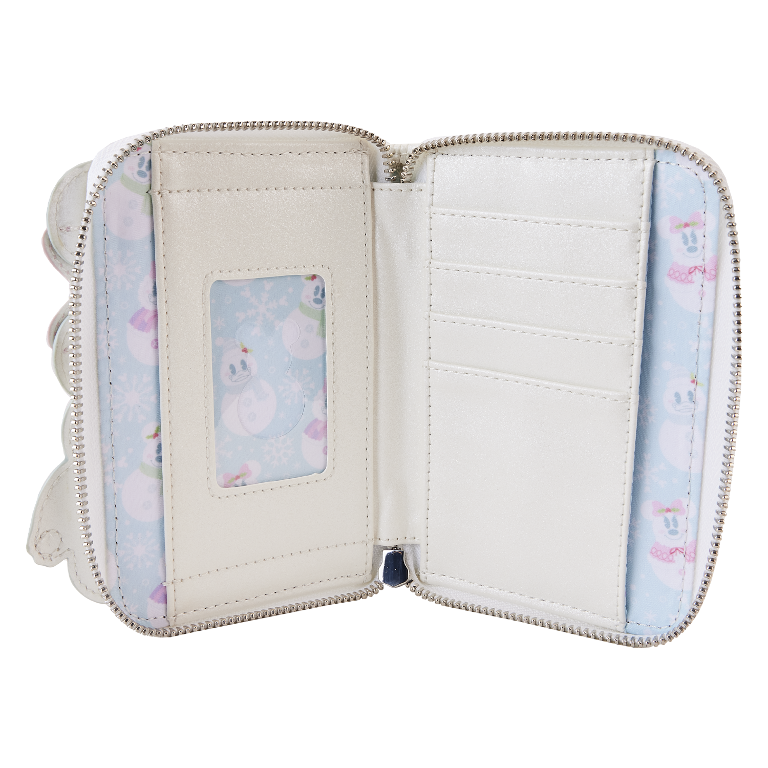 The Loungefly Mickey and Minnie Pastel Snowman Zip Around Wallet is made of vegan leather (polyurethane). Wallet zips closed with shiny silver hardware and features four slots for holding cards with a clear slot for ID. Additional features include applique, embroidered, debossed, ribbon, pom-pom, button, and printed details. Take note of the coordinated inside lining and snowman-shaped die-cut ID window.