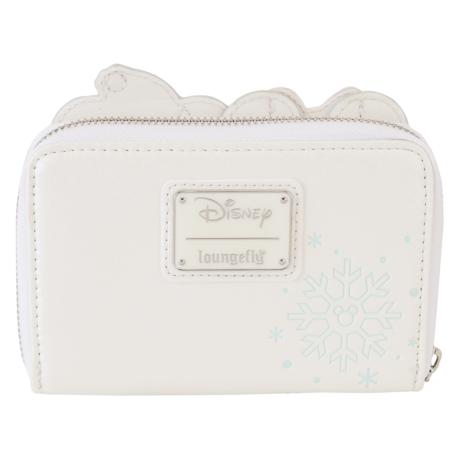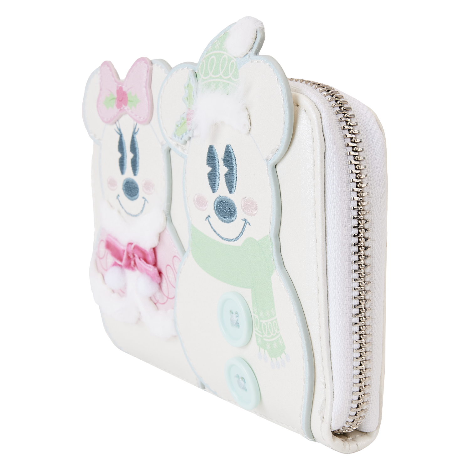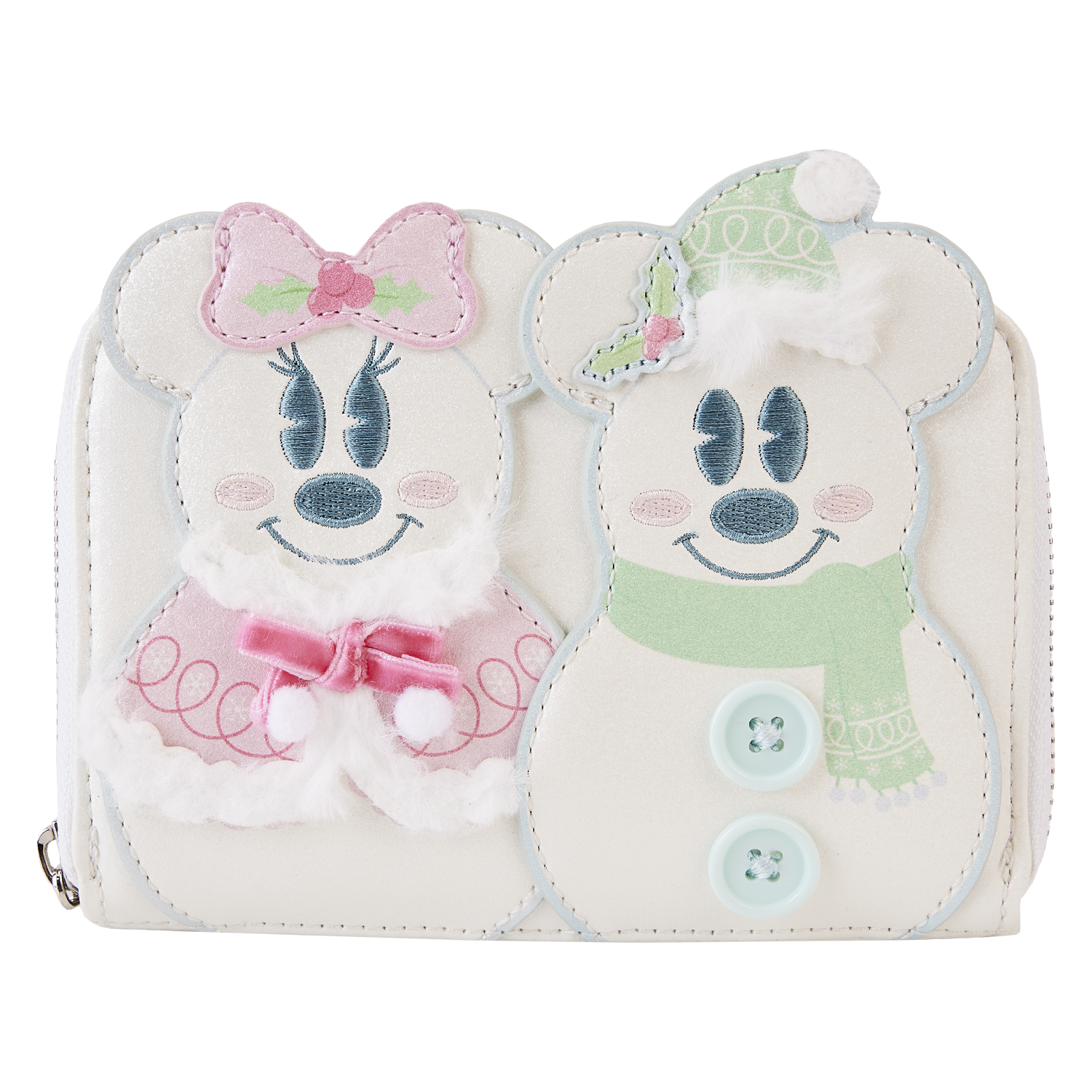 Ready for a look that's fresh as new-fallen snow? The Loungefly Mickey and Minnie Pastel Snowman Zip Around Wallet gives a cool new take to your winter wardrobe. On the front, Mickey and Minnie Mouse take shape as adorable snowmen. Embroidered details highlight their facial features while cute and cozy hats, coats, and scarves drape over them with faux-fur lining. On the back, a debossed snowflake shows Mickey's iconic silhouette in the center. Perfect for adventuring through the snow, this wallet will keep your belongings safe as you skate through the season in style.