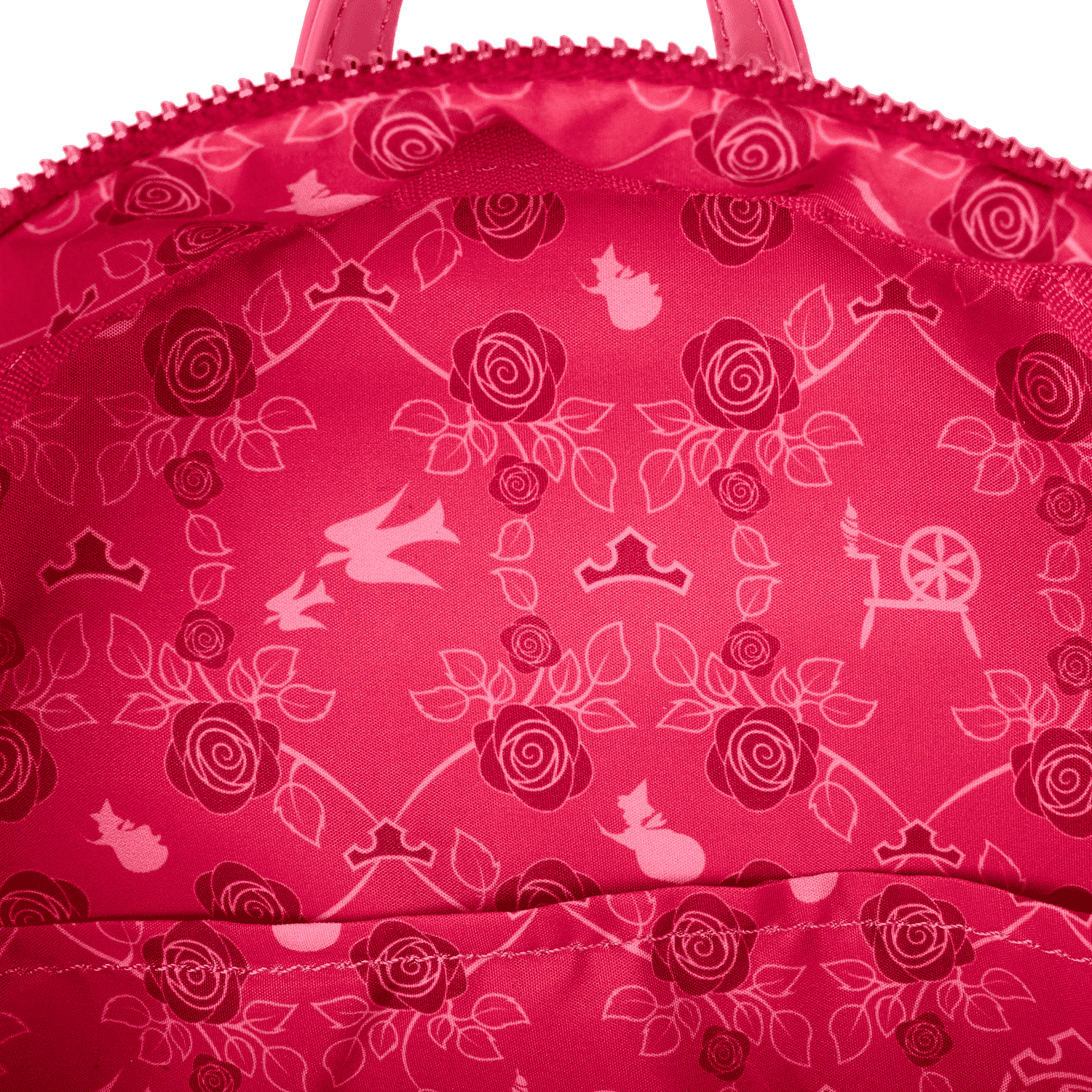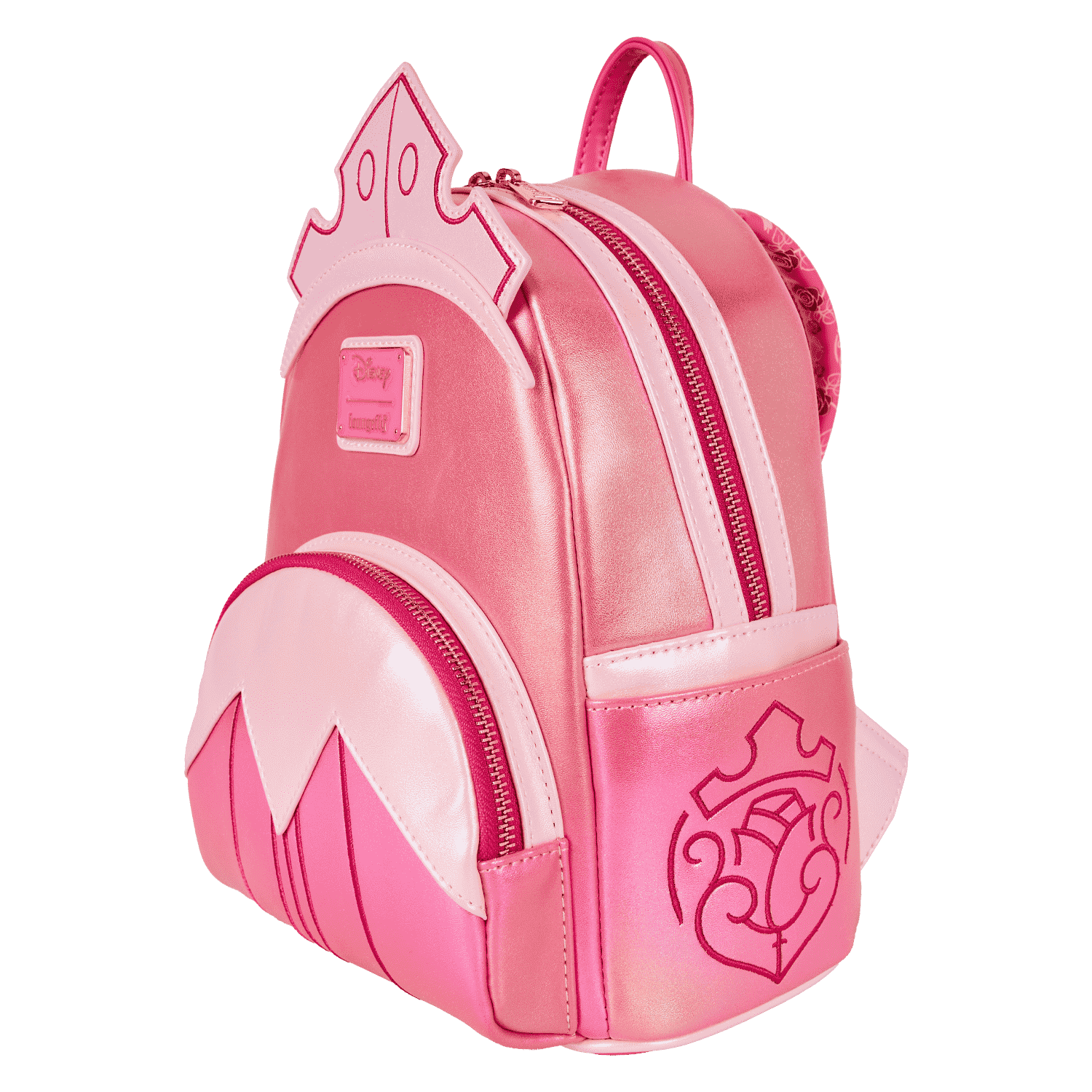 This gorgeous mini backpack gleams in the light with iridescent material. You'll find homages to Princess Aurora's gown on the bag, as well as an applique of her crown on top. More motifs of her story appear on the sides and back of the bag.