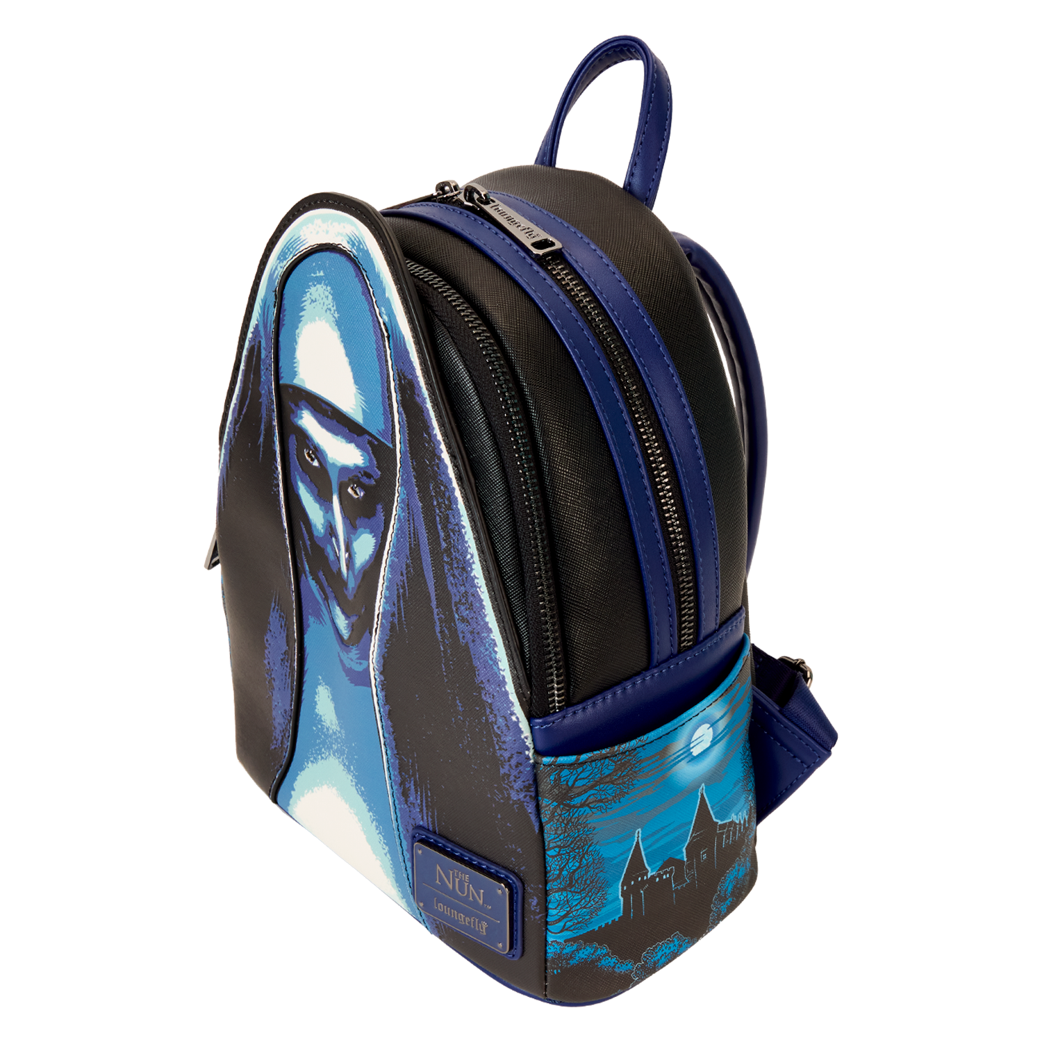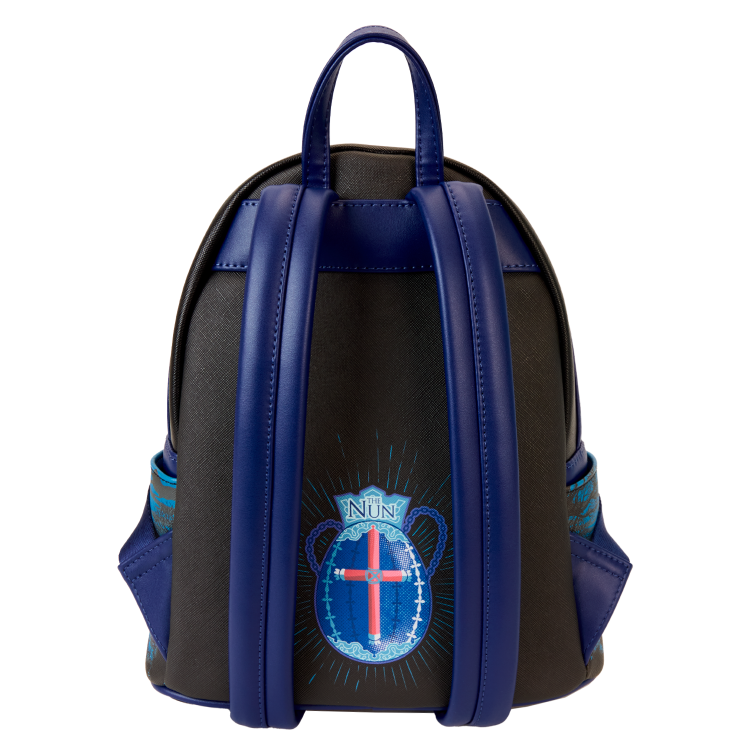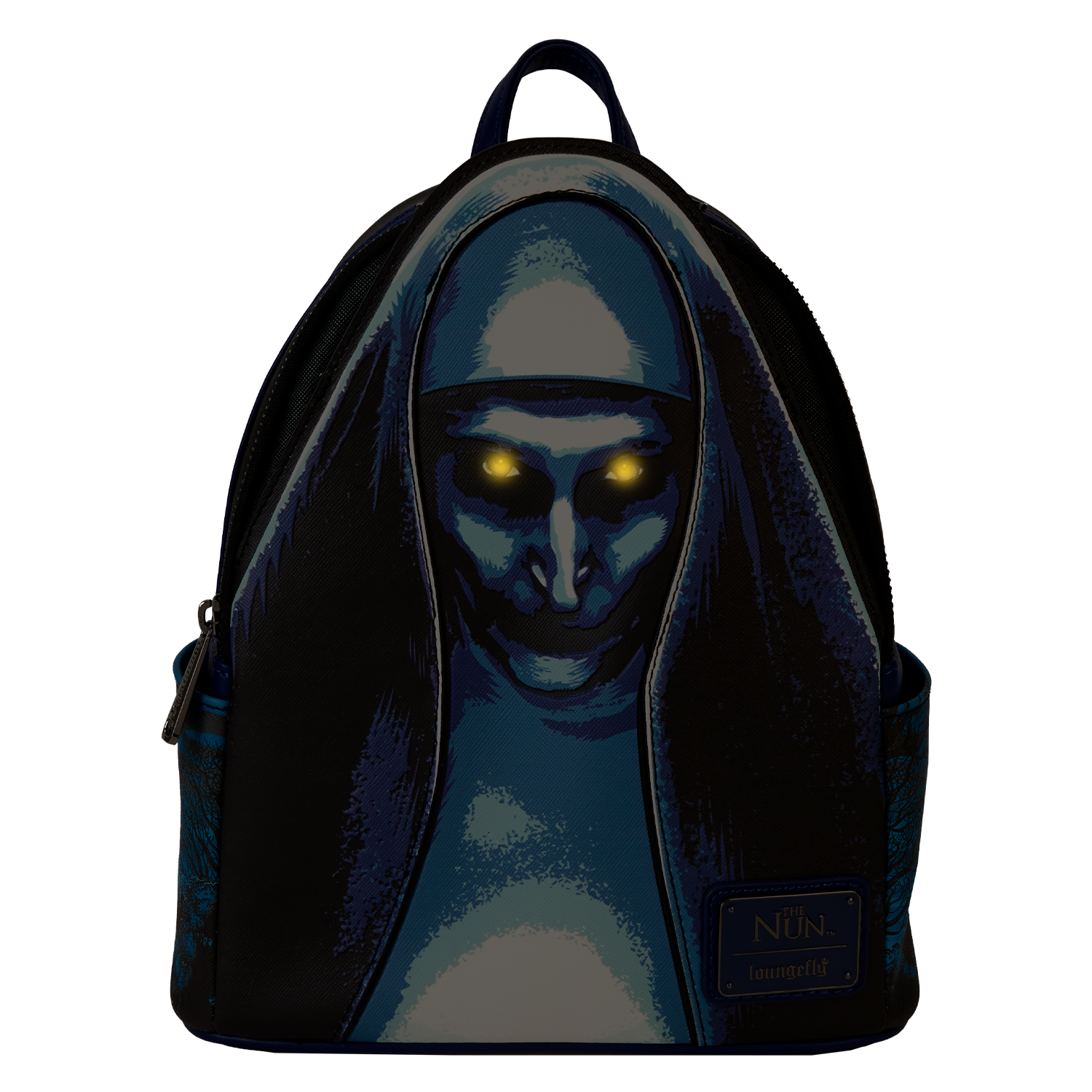 Venture through candlelit stone passageways and fog-covered haunts in style. This backpack, featuring The Nun, is truly a vision. Eerie printed details of an apparition of The Nun materialize on the front. In the dark, parts of her face and habit glow! She also has a piercing gaze, as her eyes light up in the dark. On the side pockets, you’ll find original, detailed artwork of the monastery in moonlight, shrouded by trees. Turn the backpack around, and you’ll spot a print of the ancient relic with the red cross inside. Pack your daily essentials for a fashionably spirited adventure.