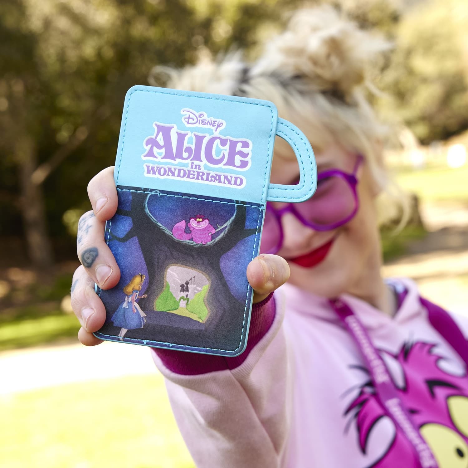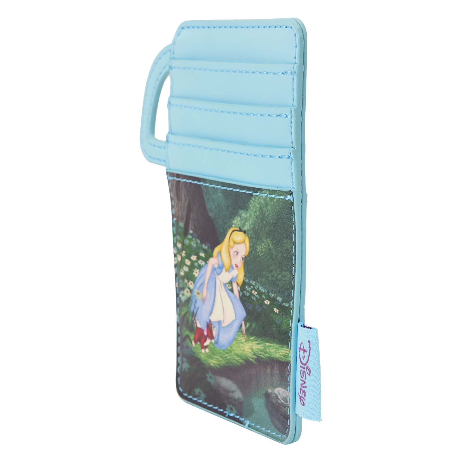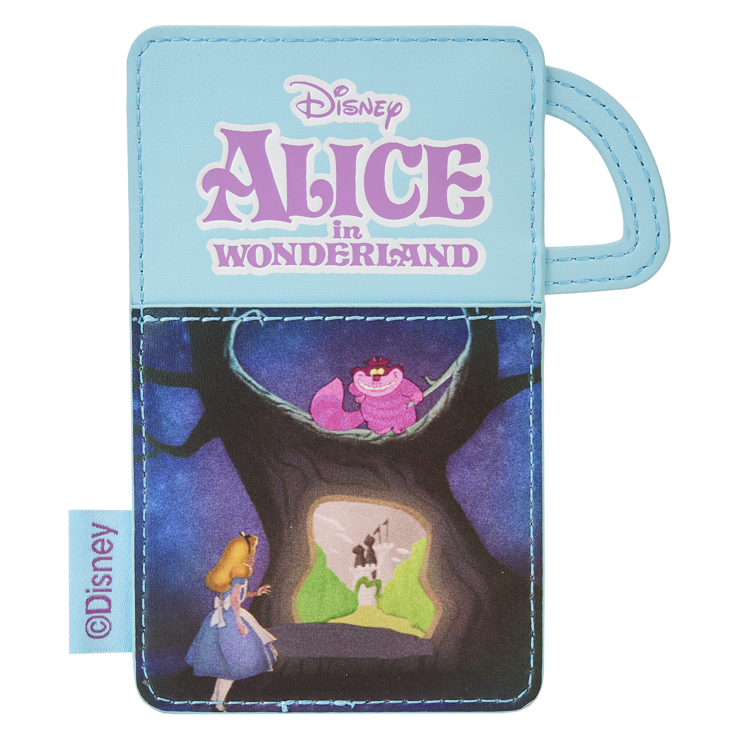 The Loungefly Disney Alice in Wonderland Classic Movie Card Holder is made of vegan leather (polyurethane). Card holder features printed details. Take note of the coordinating inside lining.