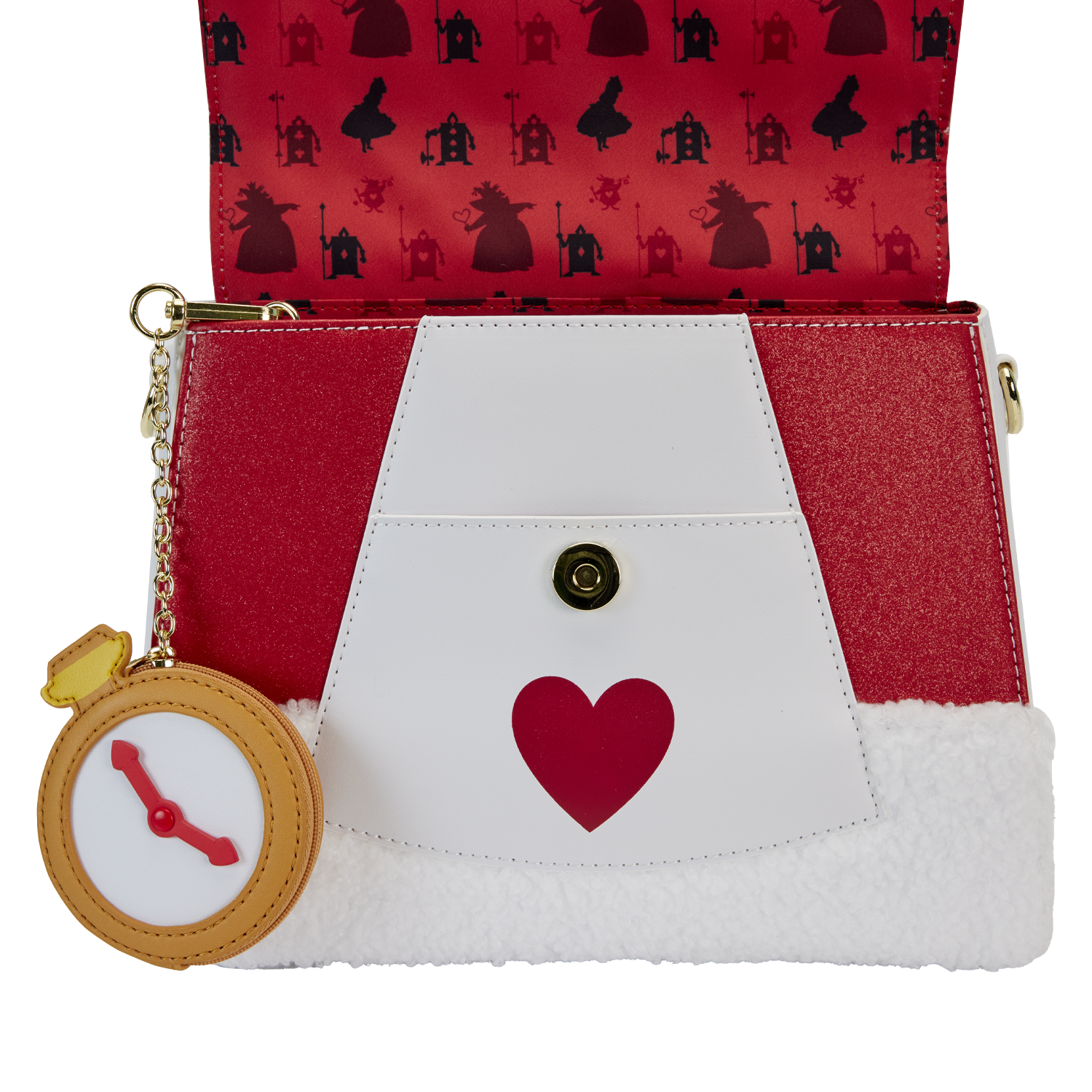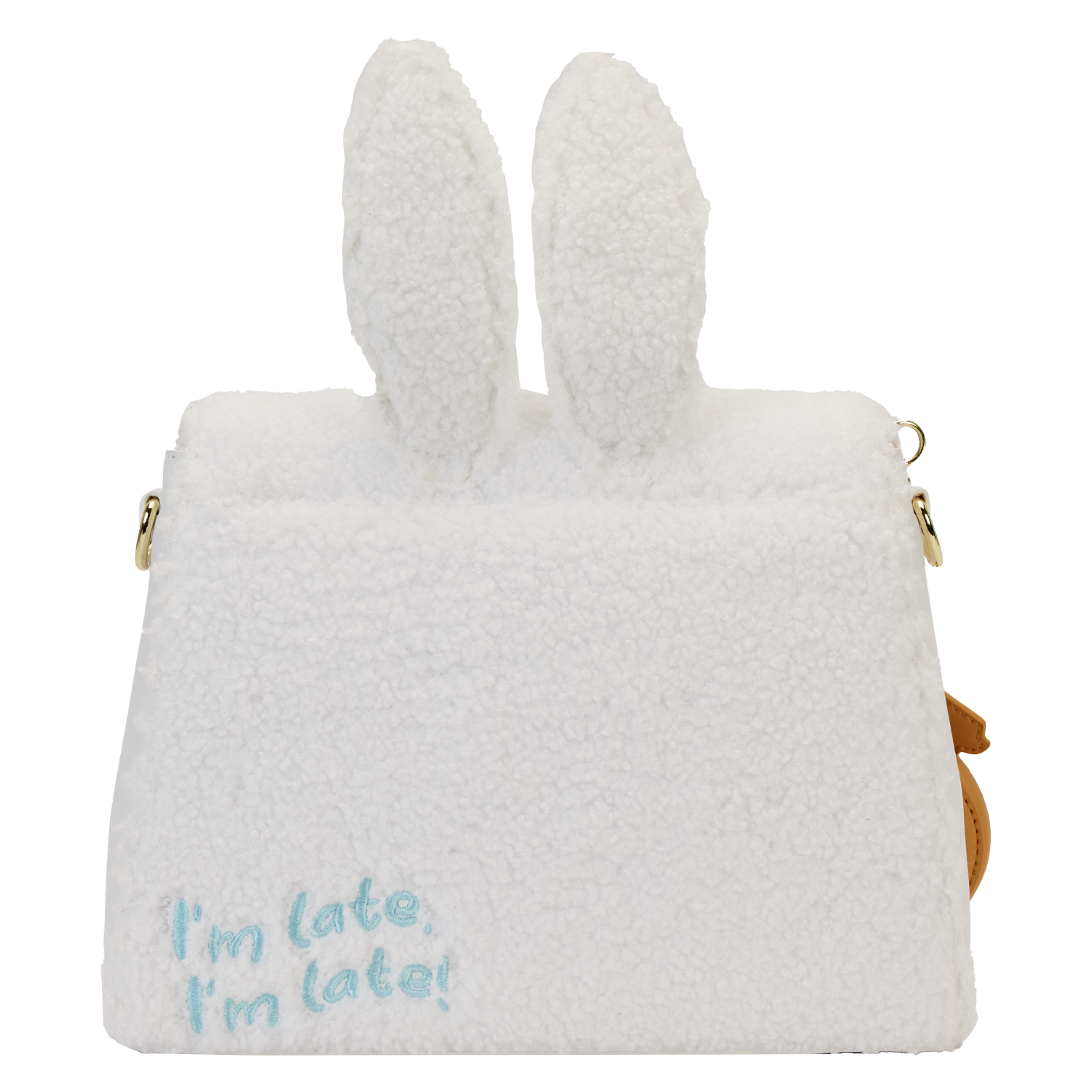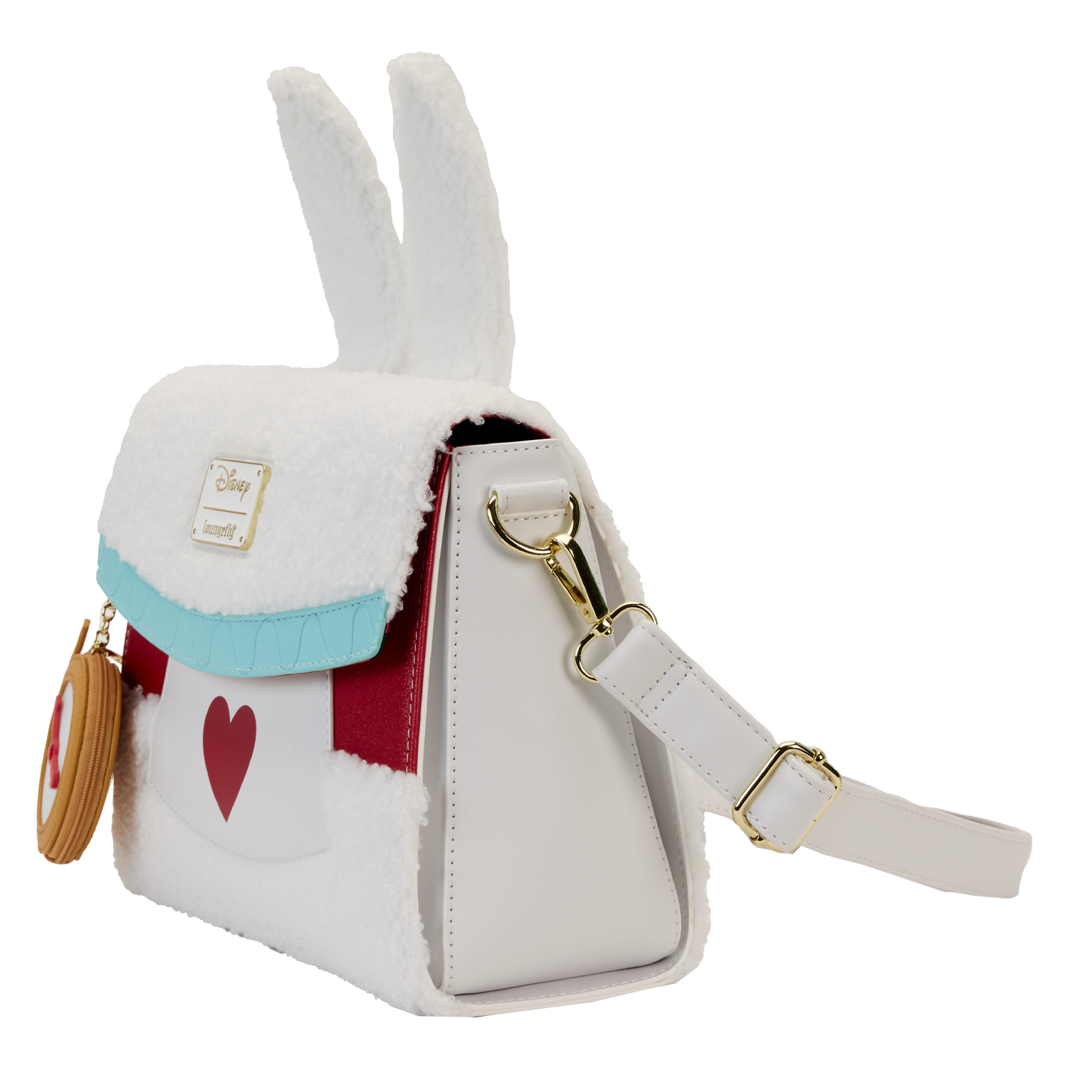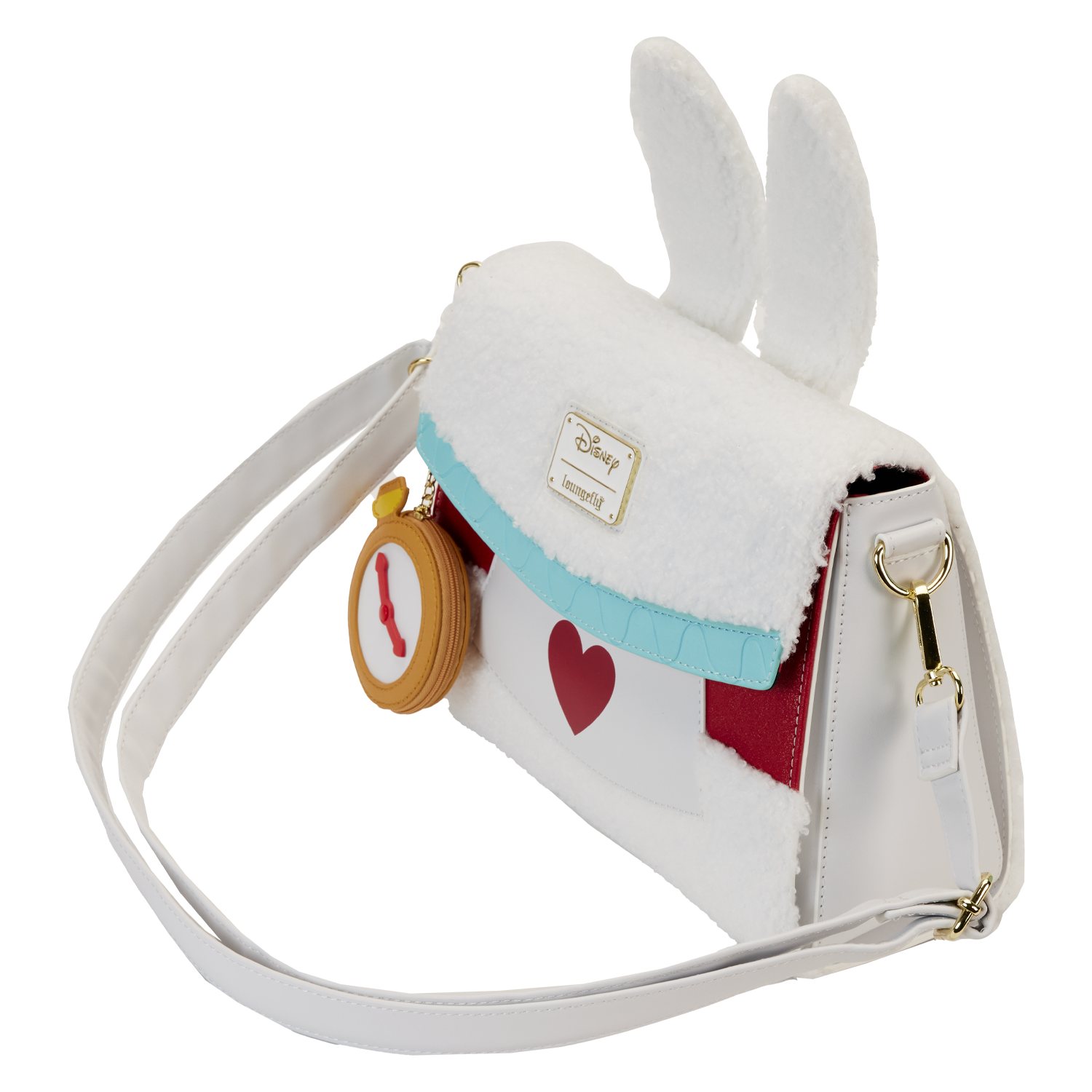 The Loungefly Disney Alice in Wonderland White Rabbit Cosplay Crossbody Bag is made of vegan leather (polyurethane). Bag has adjustable (detachable) shoulder strap, a detachable coin bag, and sturdy gold-colored metal hardware. Additional features include glitter vegan leather, sherpa fabric, a rivet for moving parts, embroidery, and applique and printed details. Take note of the coordinating inside lining.