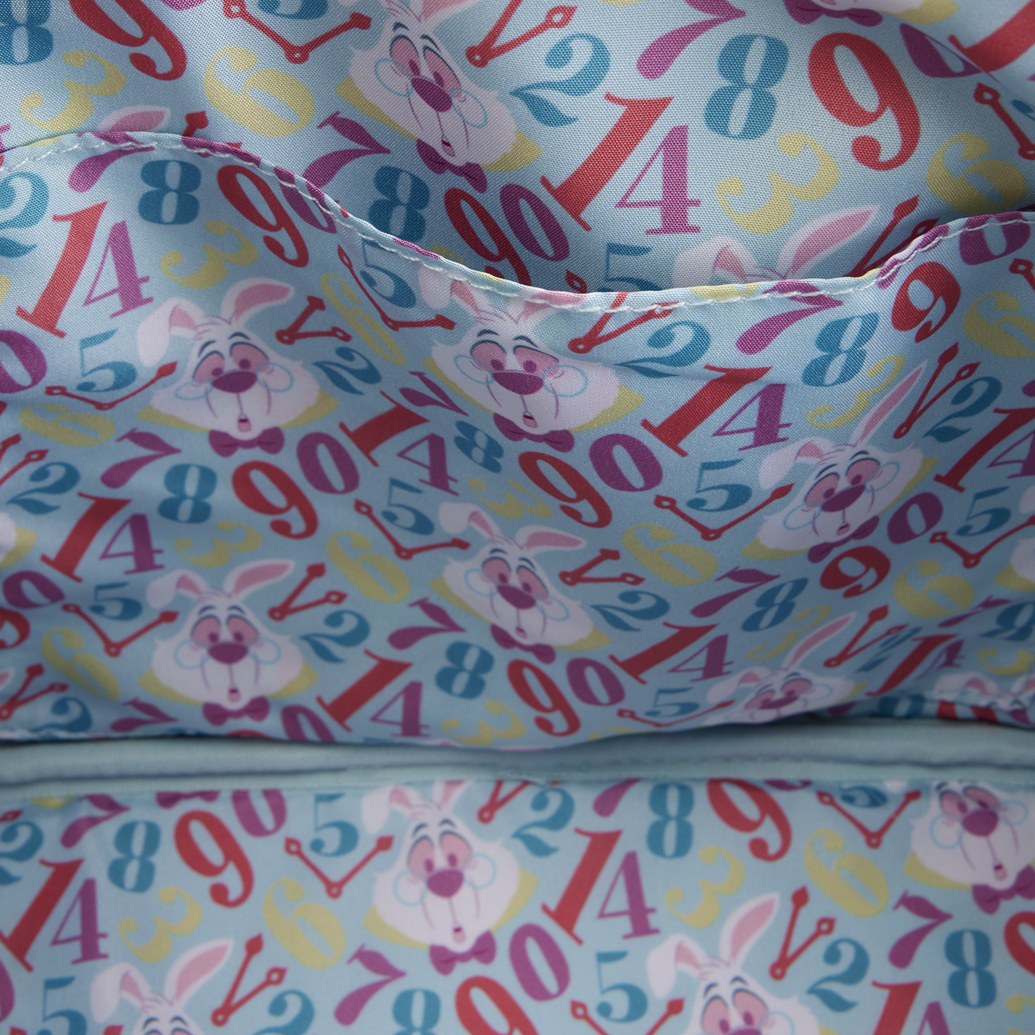 This handbag is inspired by the White Rabbit from Disney's Alice in Wonderland. You'll find a white-and-grey checkerboard pattern all over the bag. A stripe of blue along the base says, "I'm Late." You'll find a 3D molded metal charm of the rabbit on one side, and you'll find a blue applique of him on the back with debossed details. Two sherpa appliques extend down from the top handle that look like rabbit ears! You'll also find a charm of a clock attached!