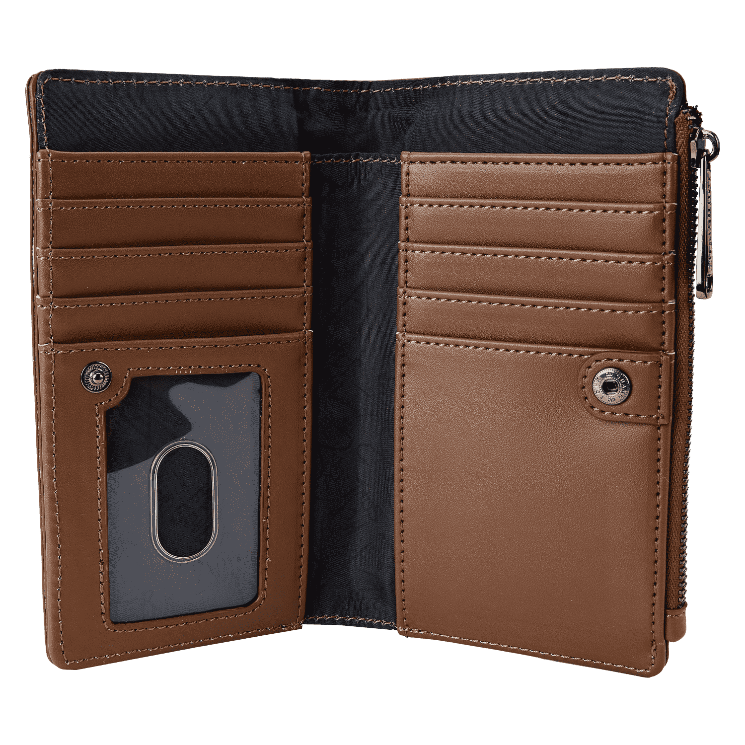 The Loungefly Warner Bros. Annabelle Cosplay Bifold Wallet is made of vegan leather (polyurethane). This flap wallet has sturdy gunmetal-colored snaps and zippers to keep everything in place. Additional features include applique, printed, clear PVC, and debossed details. Take note of the coordinating inside lining.