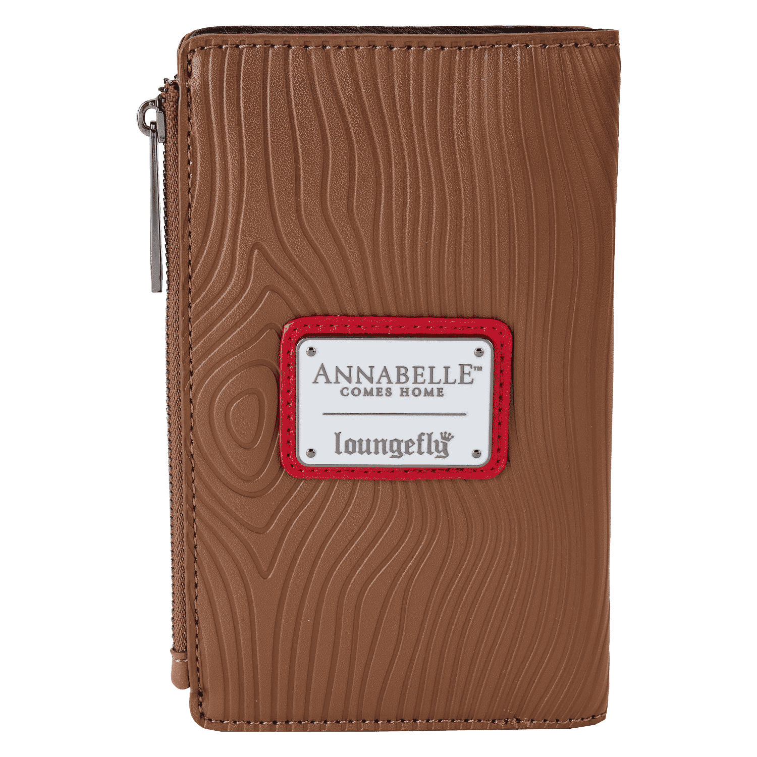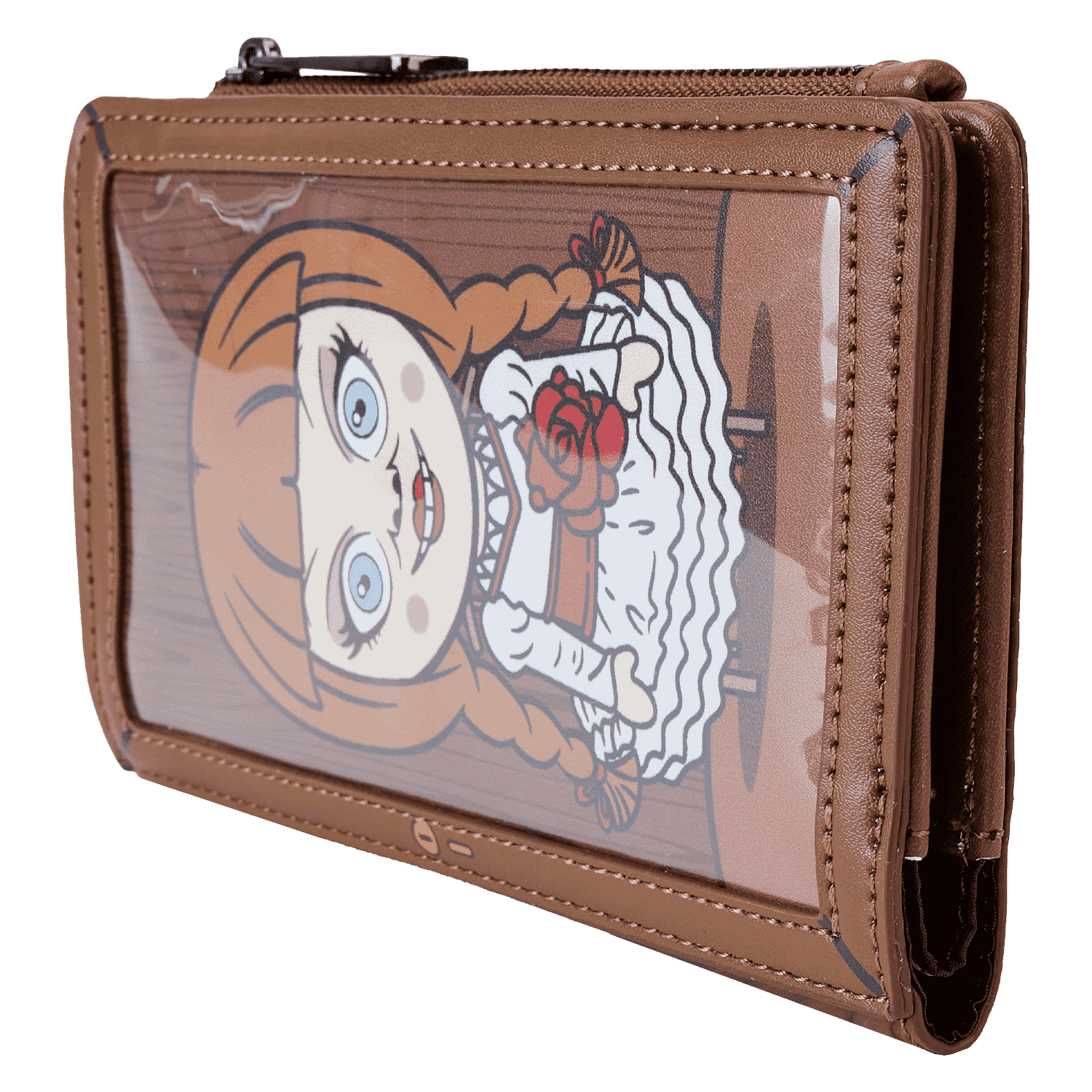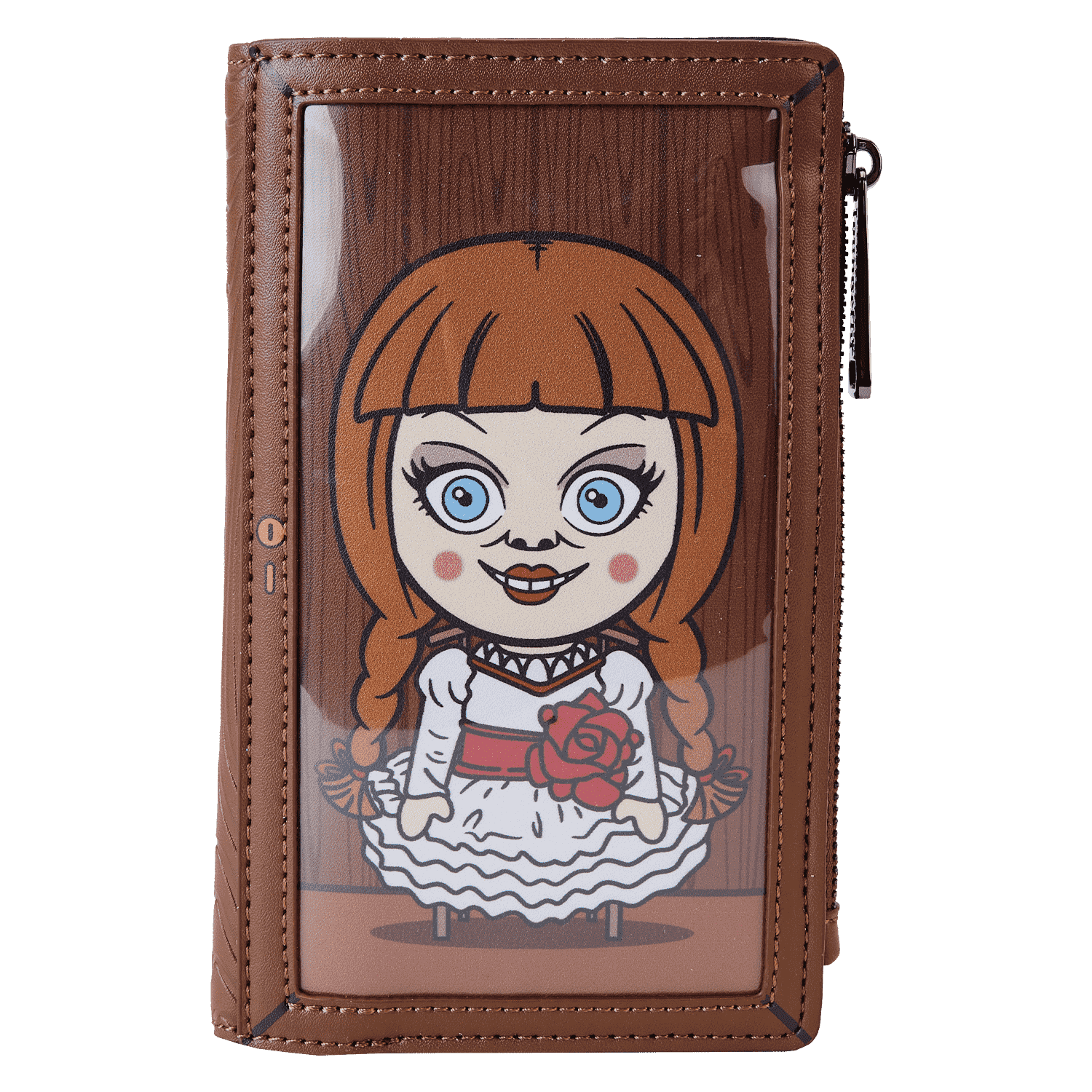 Guess who’s out and about! Doll up your wardrobe with our Loungefly Annabelle Cosplay Bifold Wallet. This hauntingly fashionable accessory features a clear PVC “window case” on the front, through which you can see an applique of Annabelle, as if she were locked inside for safekeeping. Wood grain debossed details carry over onto the back of the wallet. Inside, you’ll find 8 slots for holding cards and 1 clear slot for displaying your ID. Conjure up plenty of adventures with this wickedly fun accessory.