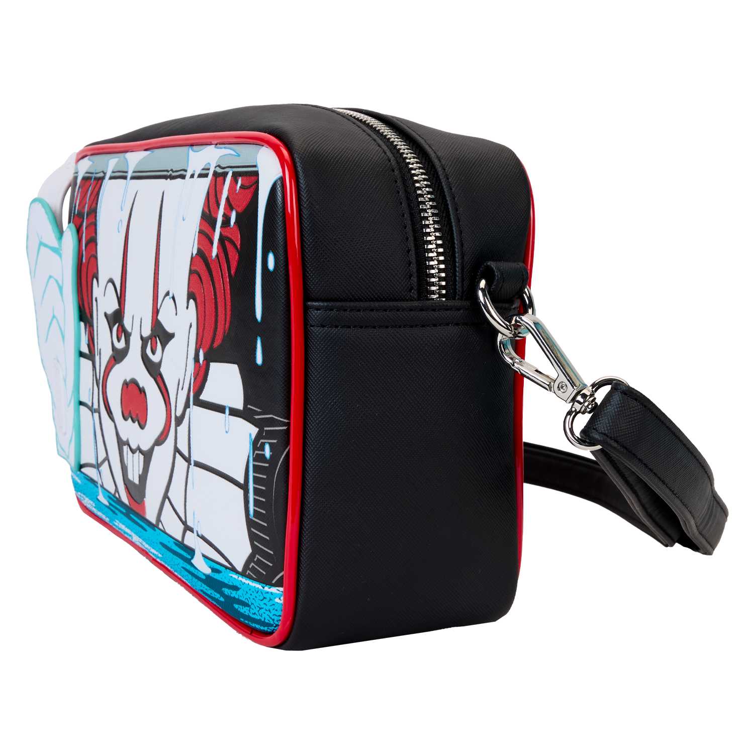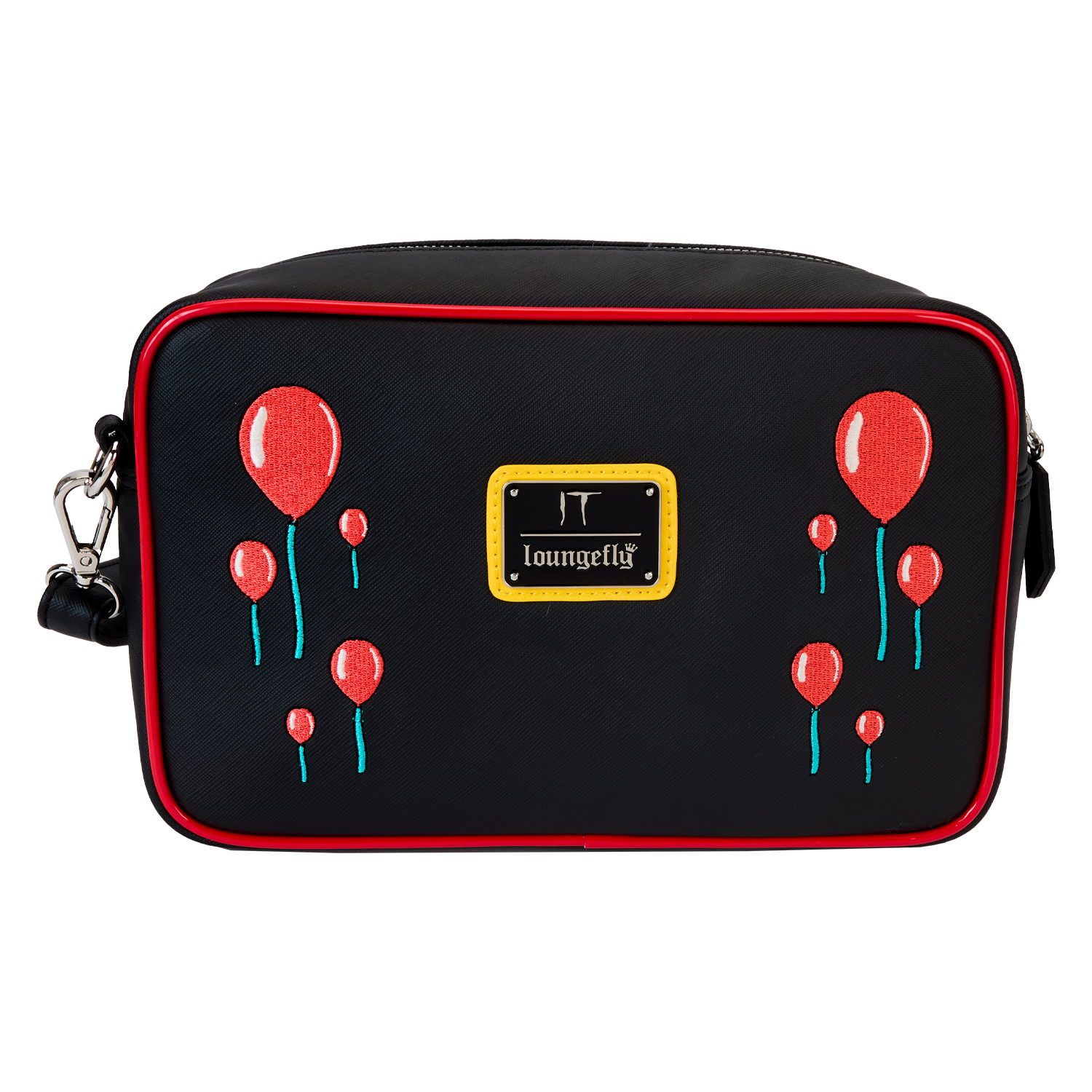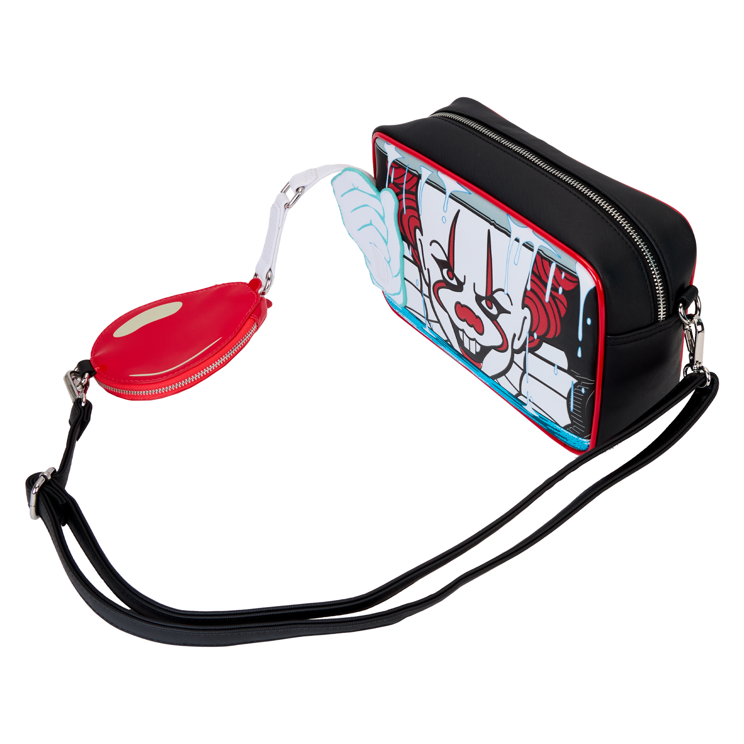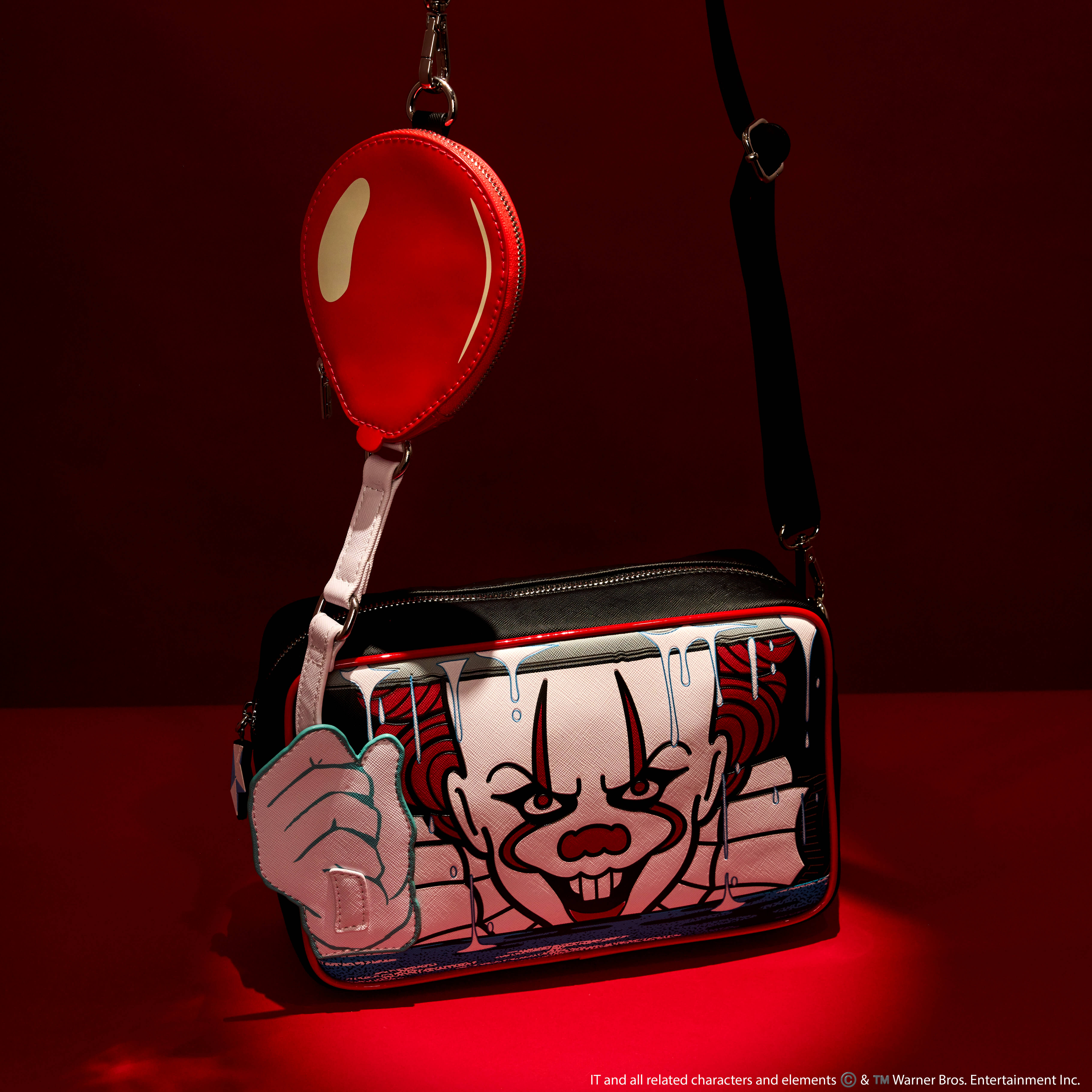 Explore creepy tunnels in style—and in wickedly fun company. Bring along this crossbody bag featuring Pennywise from IT. A hauntingly familiar clown face peers out from the sewer below. Pennywise’s applique hand holds a white strap that leads to a red balloon coin purse. In the dark, his face glows! A silicone zipper charm of Georgie’s paper boat tops off the look. Sail through your day with a monstrously stylish accessory.