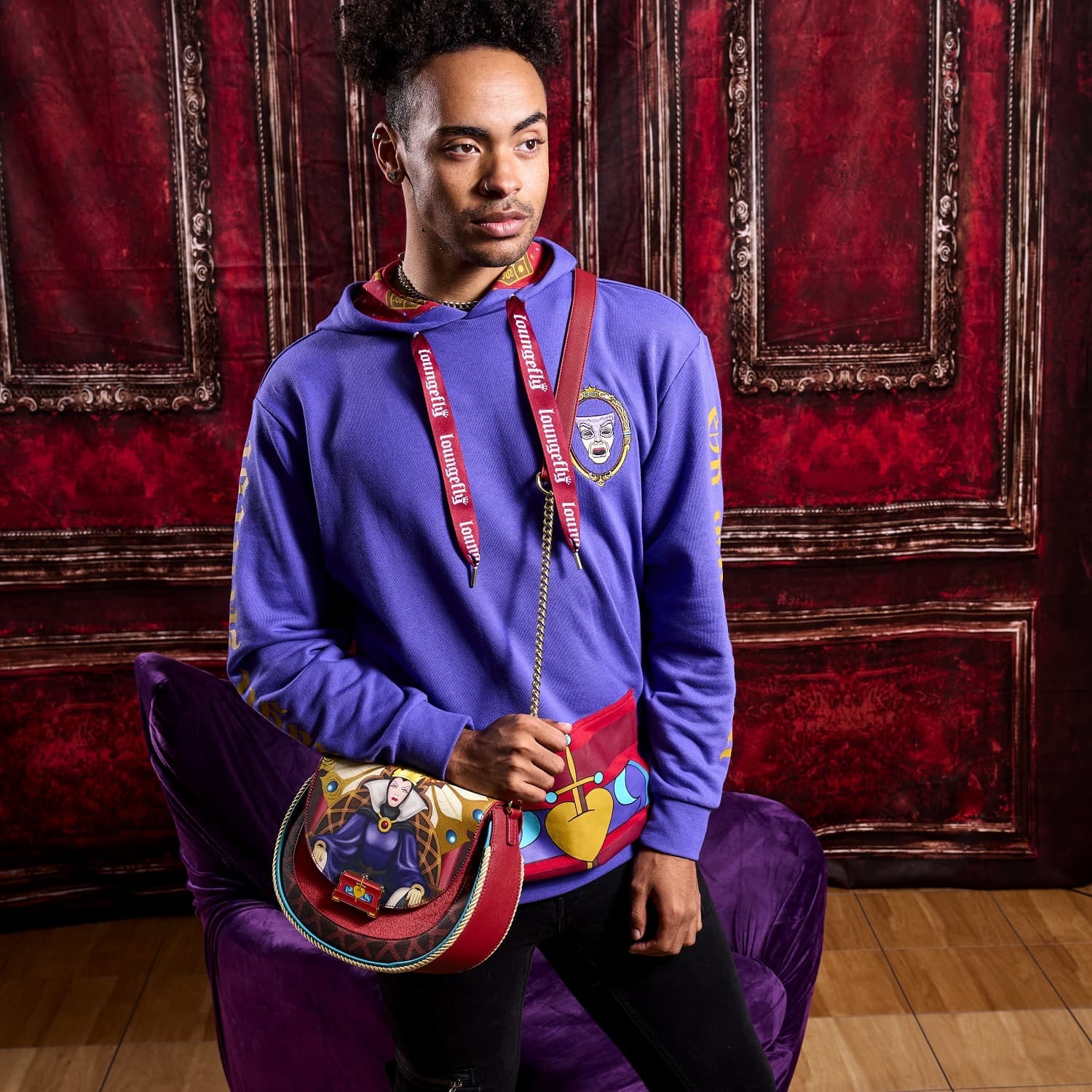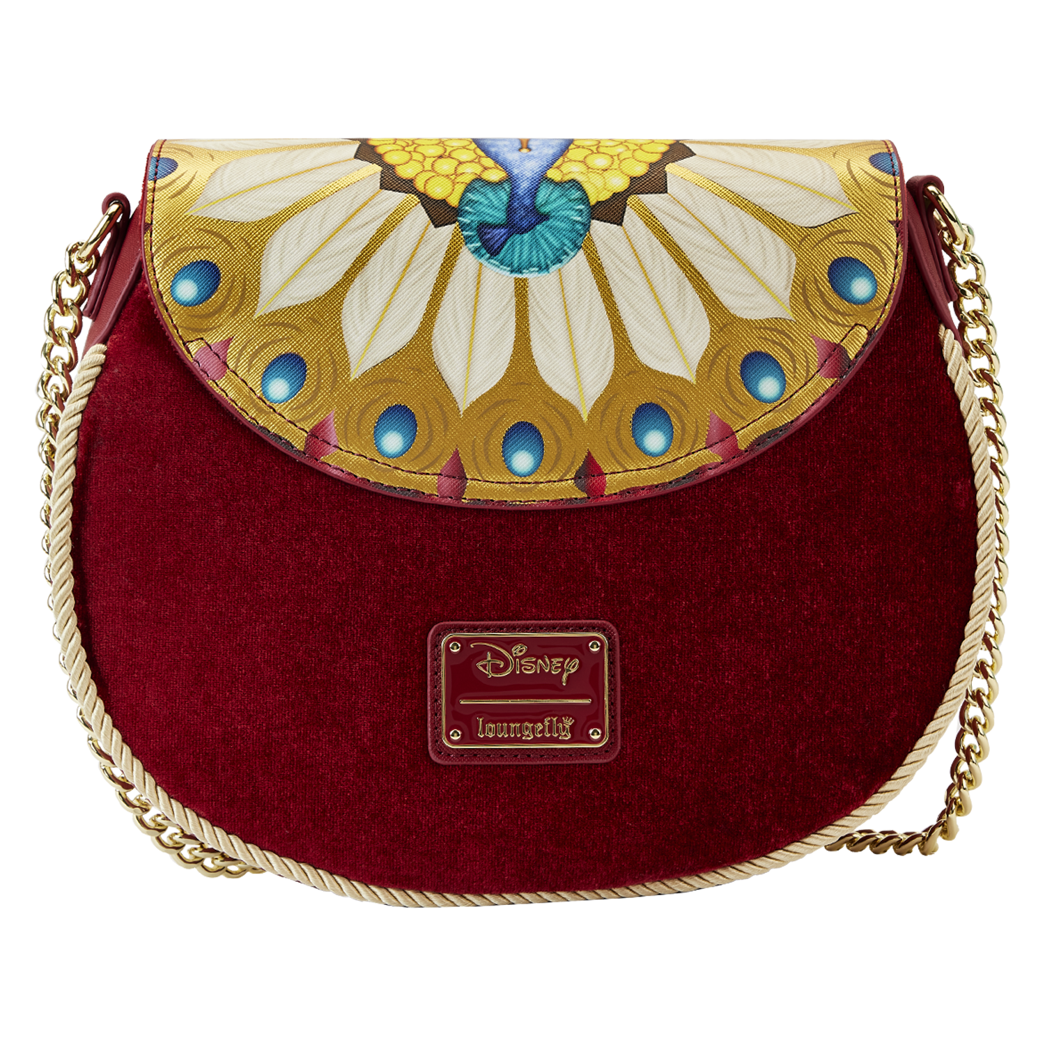 Elegantly evil and ready to rule! Bring on the reign with our Loungefly Disney Snow White Evil Queen Throne Crossbody Bag! The Evil Queen is looking particularly regal in the throne room. The front flap for this bag has applique and gold foil details of an elaborate peacock design that continue over the top of this stunning accessory. The Evil Queen, seated on her throne, holds the box meant to keep Snow White’s heart, and the clasp underneath serves as a closure to keep your valuables secure. When you open the flap, you’ll see the masked face in the Magic Mirror! Velvet details on the bag add a lush texture. Keep your favorite animated moments close while adding wickedly royal fun to your everyday outings, with this exquisite accessory.