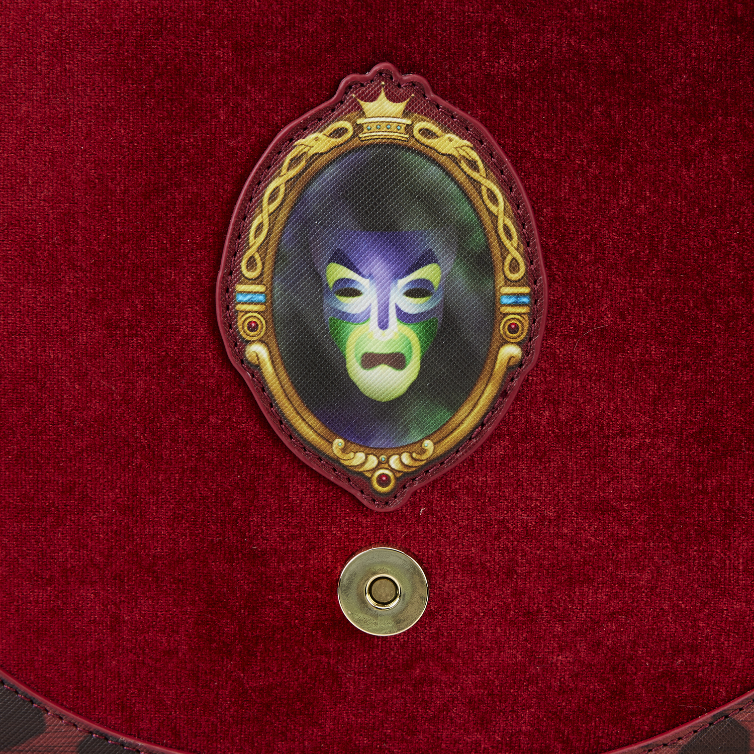 The Loungefly Disney Snow White Evil Queen Throne Crossbody Bag is made of vegan leather (polyurethane). Bag has an adjustable shoulder strap, sturdy gold-colored metal hardware, and features applique, gold-foil, velvet, and printed details. Take note of the coordinating pattern of the inside lining fabric.