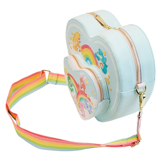The Loungefly Care Bears Heart Cloud Party Rainbow Strap Crossbody Bag is made of vegan leather (polyurethane). Bag has adjustable, removable straps and sturdy gold-colored metal hardware. Additional features include print deboss and glow-in-the-dark details. Take note of the coordinating inside lining.