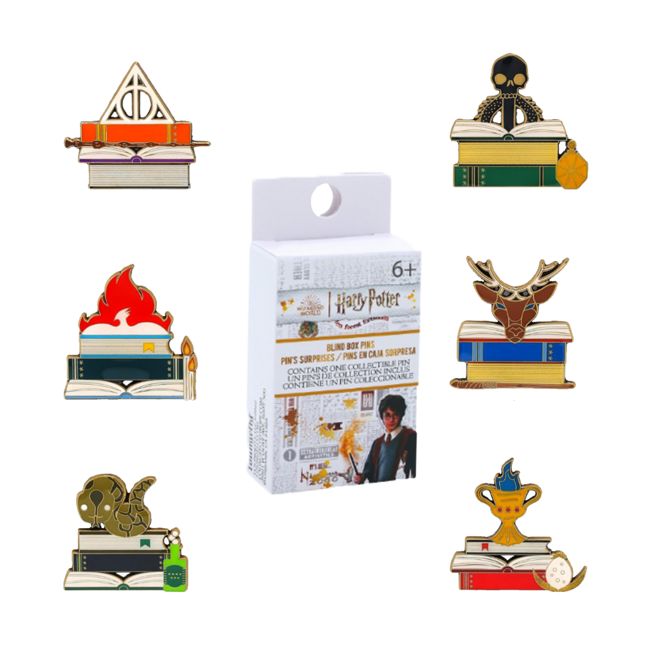 Study up on Harry Potter wherever you go with this set of Loungefly Harry Potter Book blind box pins.Each pin design features a stack of books with icons from the Harry Potter series including the Dark Mark, the Goblet of Fire, and more. These pins are sold individually and blind. Collect all 6 pins! There is a 1 in 12 chance you’ll find a chase variant. The chase in this series is Harry Potter with glow in the dark enamel fill details.Enamel pins are approximately 3.8 cm tall and feature