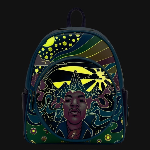 Peace, love, and electric guitar! Capture the sensational sound of Jimi Hendrix’s music with this Loungefly Jimi Hendrix Psychedelic Landscape Glow-in-the-Dark Mini Backpack. You’ll love packing away everything you need to groove through your day in this colorful backpack. Jimi Hendrix’s face rises from grassy fields filled with pops of colorful flowers. A landscape of mountains, wavy rivers, and a brilliant sun blend together on the front zipped pocket. Above, stars and a shining moon watch over. When the lights go out, all the landscape features glow in wavy, groovy lines. On the back, the flowers make another appearance, along with Jimi Hendrix’s signature. It’s the perfect accessory for enjoying an outdoor concert or for bringing harmony to everyday errands.