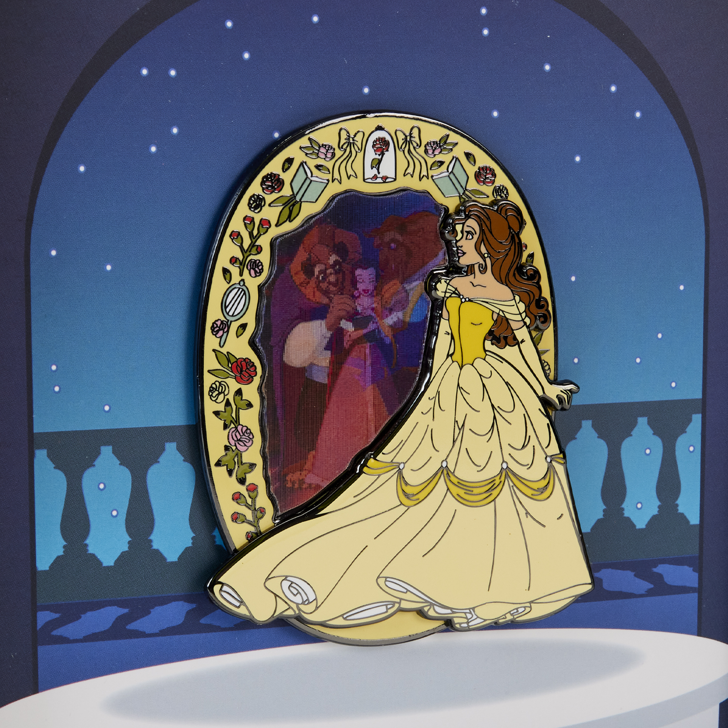 Channel your favorite Disney princess with the Loungefly Beauty and the Beast Belle Lenticular Pin! This design shows Belle as she gazes upon some memories from her past. Tilt the pin back and forth to reveal different scenes of Belle and the Beast embracing. A decorated frame surrounds the pin with motifs from Belle’s story, including roses, books, and a mirror. This accessory makes an enchanting addition to any outfit or bag and is perfect for fans looking to keep their favorite characters close.