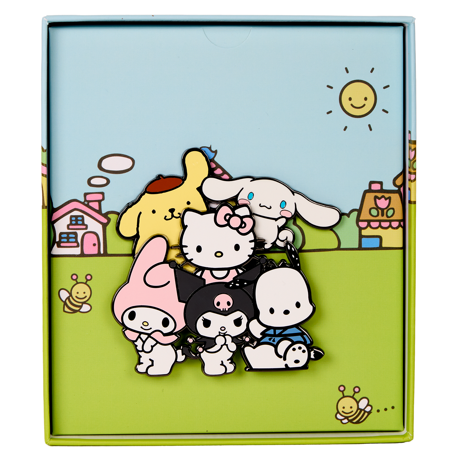 This pin features Hello Kitty surrounded by Pompompurin, Cinnamoroll, My Melody, Kuromi, and Pochacco! Pompompurin and Cinnamoroll slide up and down above the group!