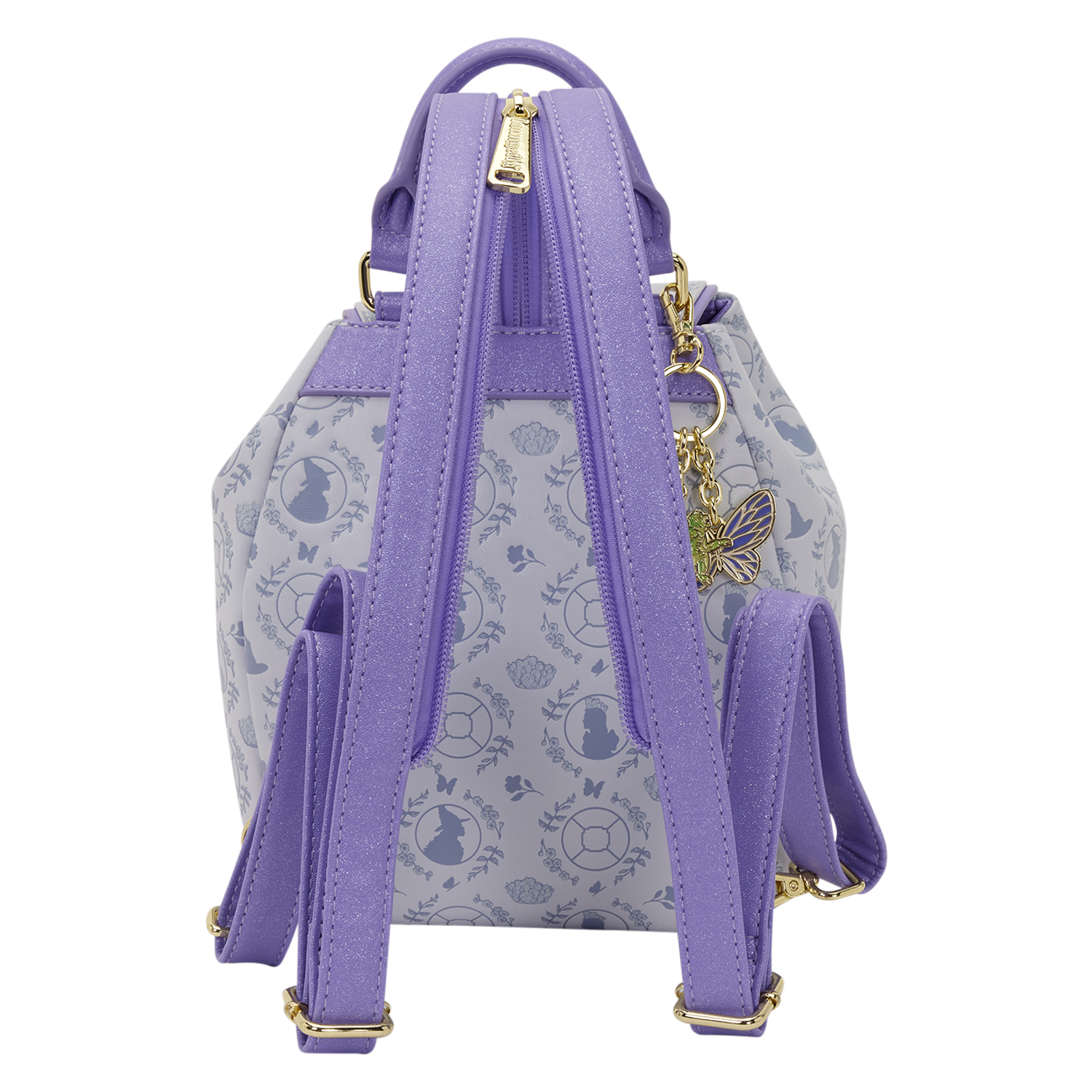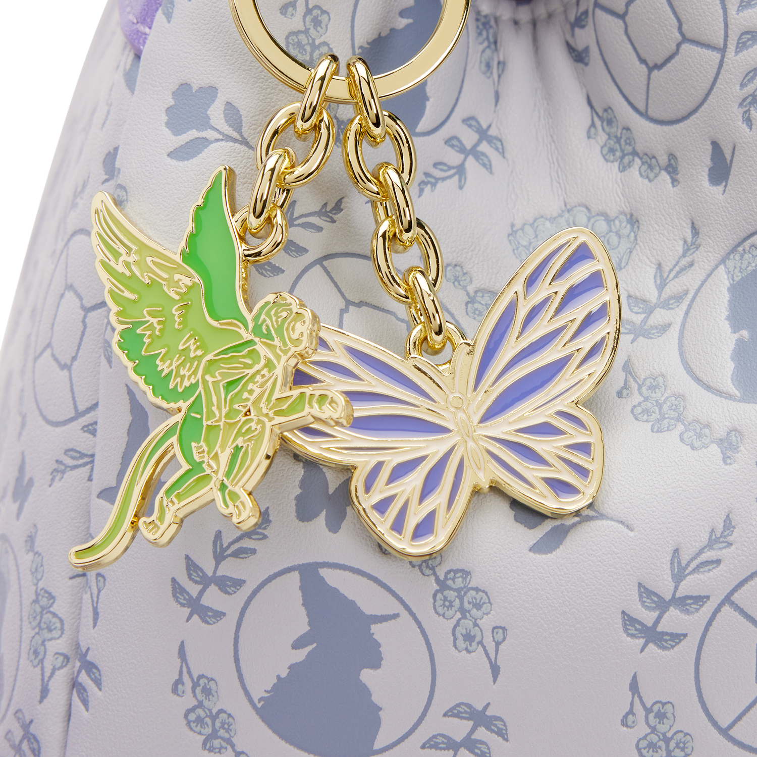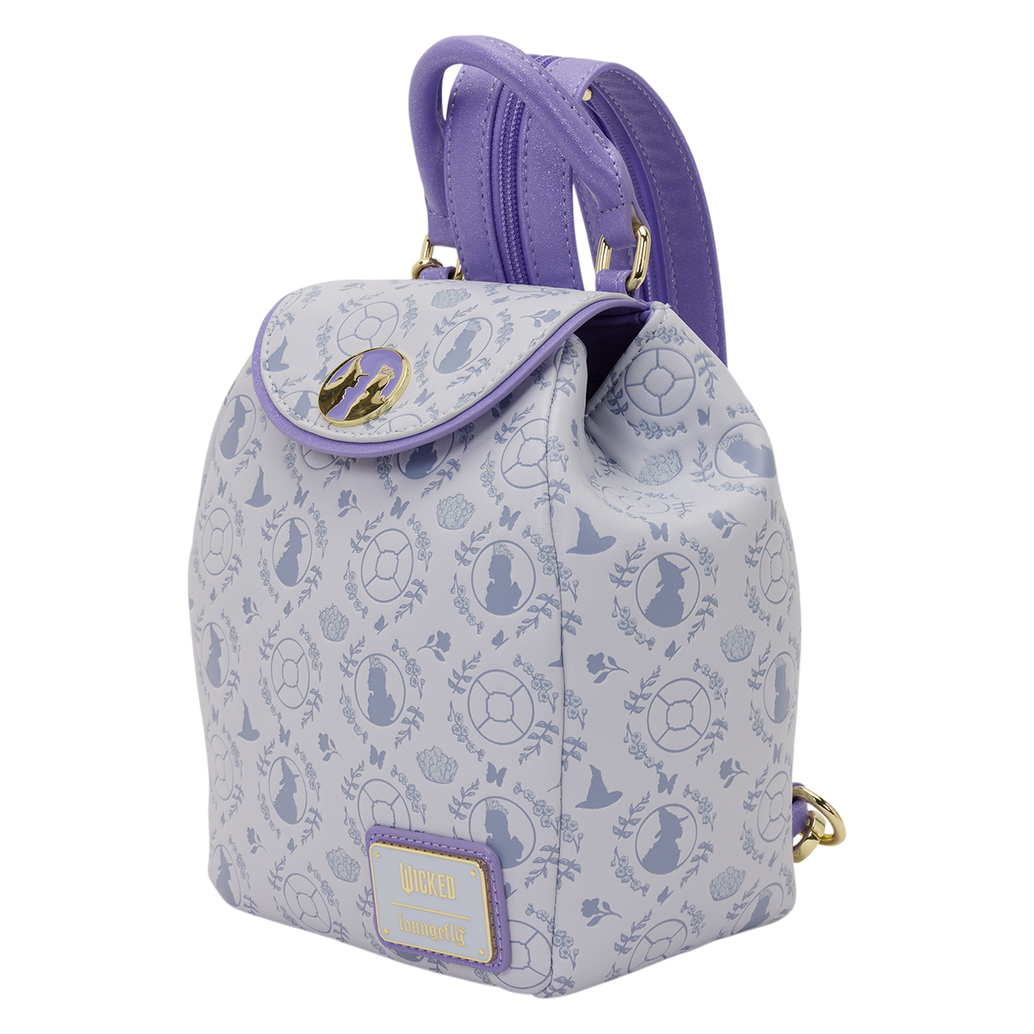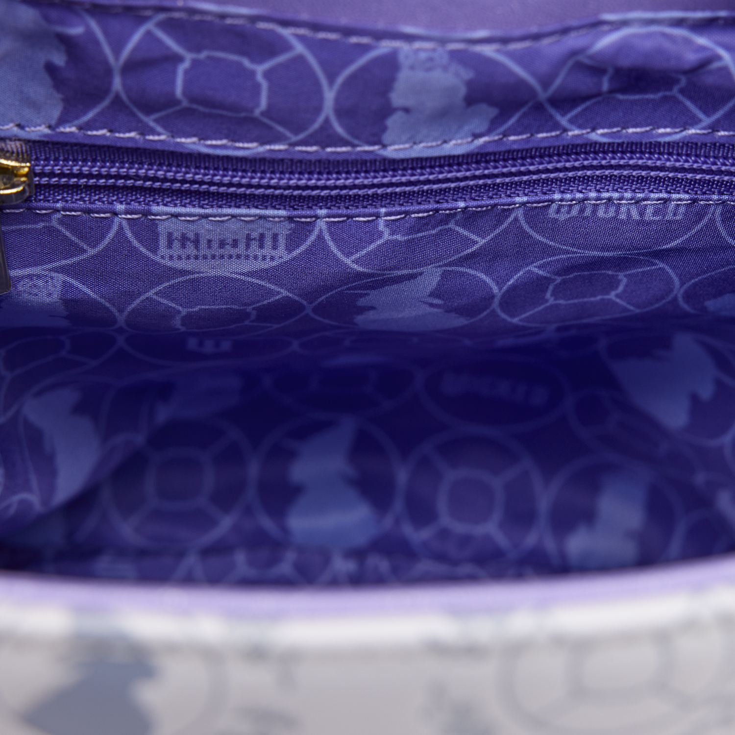 This bag features shimmer material with an embossed pattern showcasing symbols and silhouettes of Elphaba and Glinda. On the top flap, you'll find a magnetic snap closure that features the silhouettes of Glinda and Elphaba. Attached to the bag is a keychain featuring charms inspired by these characters. This bag can convert between a sling or a mini backpack; all you have to do is unzip the strap to make it into two!