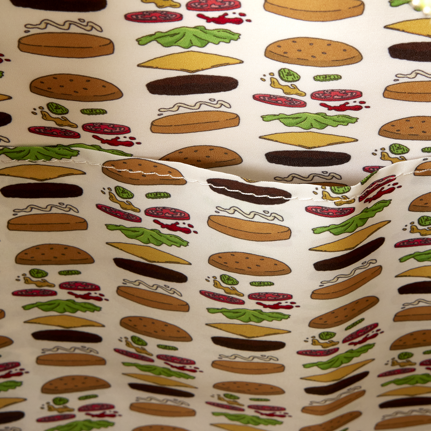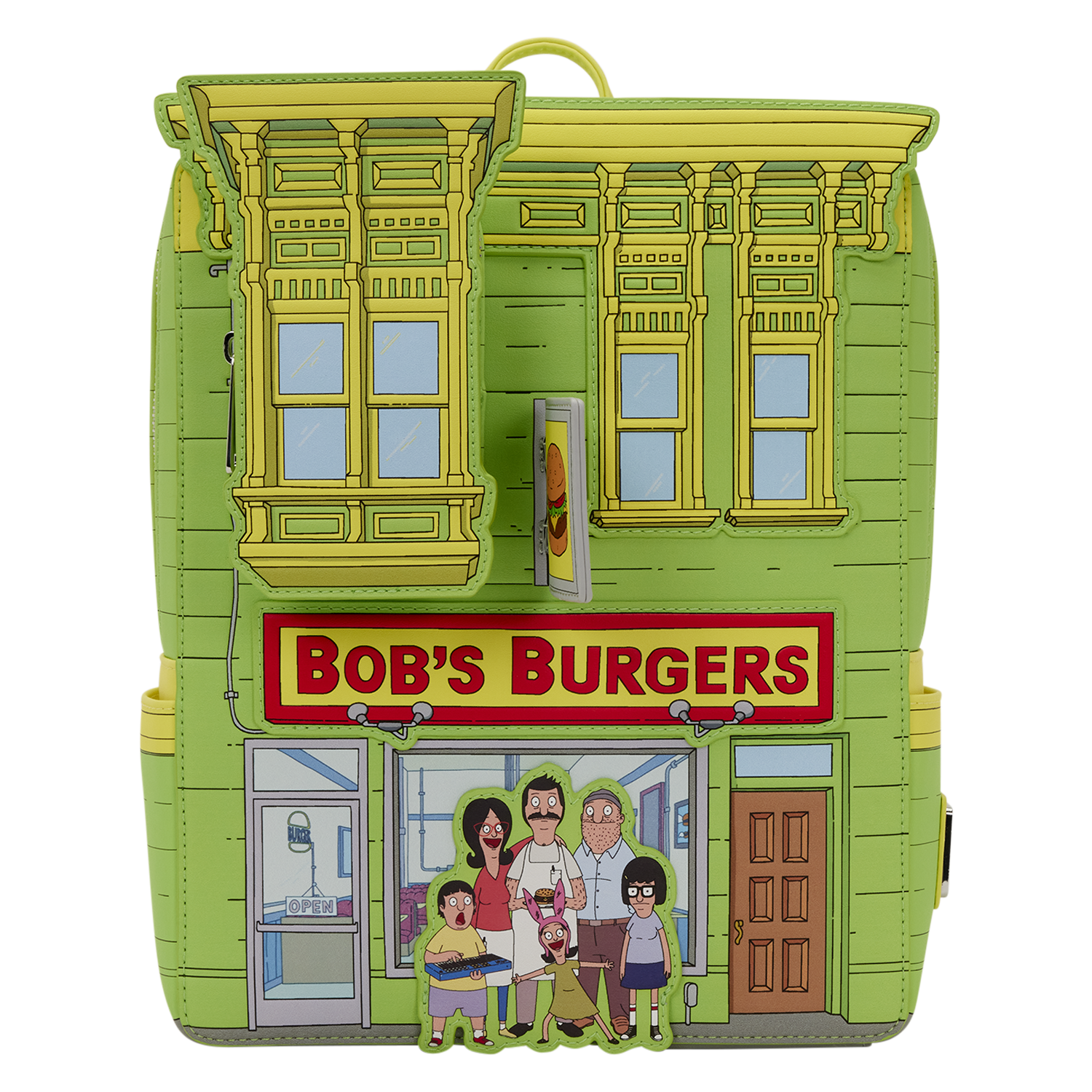 This mini backpack brings the namesake restaurant to life! You'll find the whole family gathered out front of the restaurant with the "Bob's Burgers" sign above them. You'll also find details of the window above. Turn the bag around to find an image of the dumpster plus flying burger appliques on the straps!