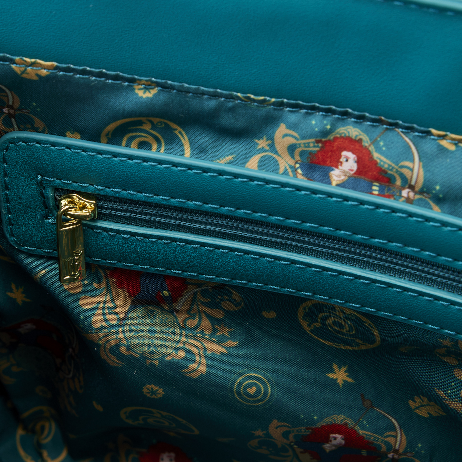 The Loungefly Brave Merida Princess Scene Crossbody Bag is made of vegan leather (polyurethane). Bag has adjustable (detachable) shoulder strap with sturdy metal hardware and features printed details. Take note of the coordinating inside lining.