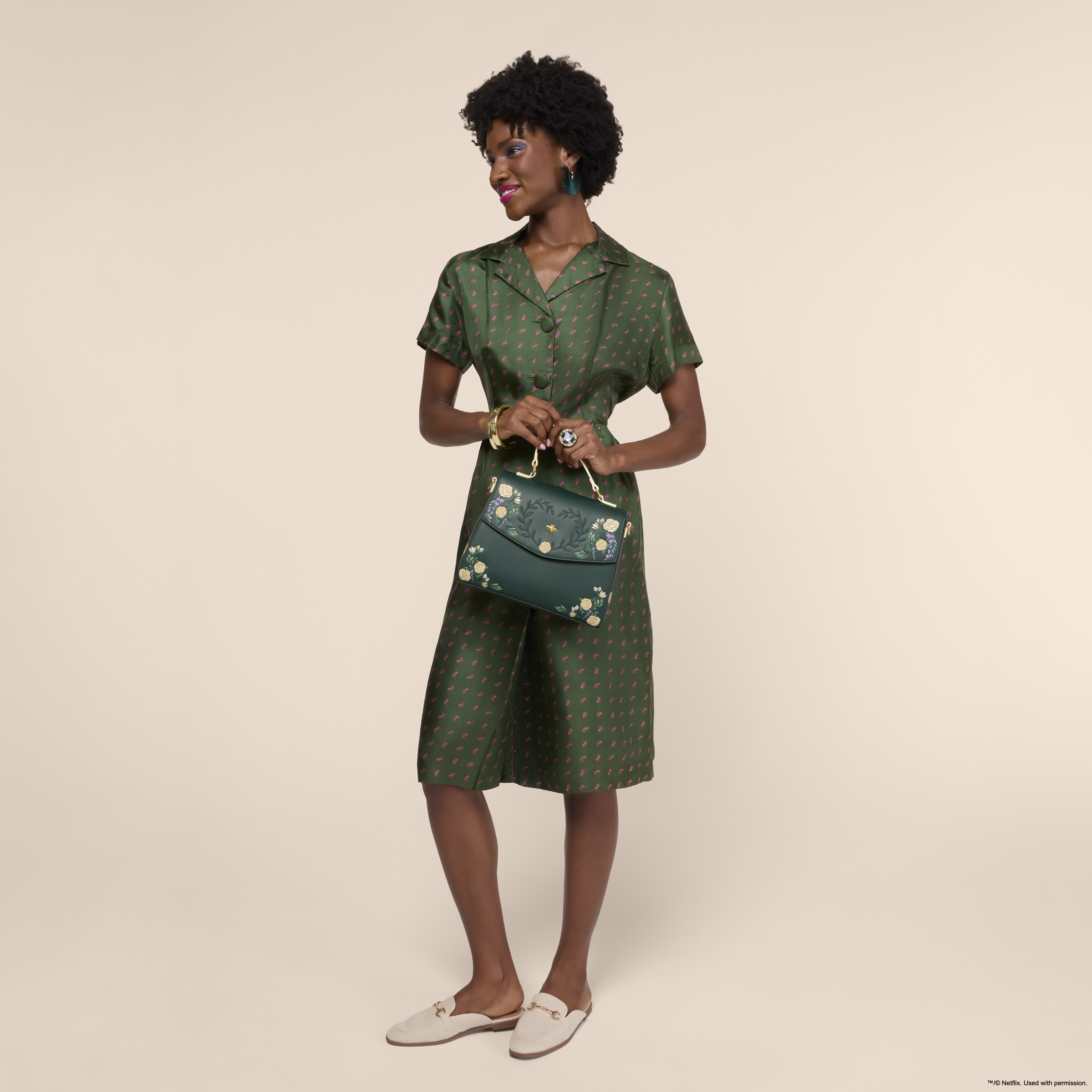 You'll find embroidered florals all over the bag – the top flap, the bottom corners, the sides, and the back! In the center of the top flap, you'll find a 3D molded metal rivet of a bee. This bag gives any outfit an instantly elegant feel! It's perfect for any Bridgerton fan who wants to show off their fav show with their accessories!
