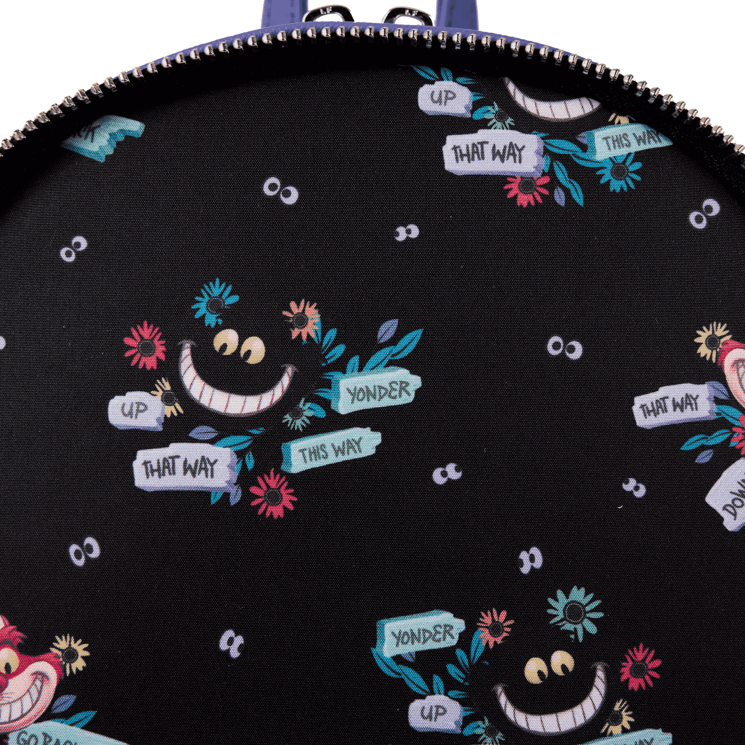 Shift the bag back and forth and the Cheshire Cat appears and disappears in a lenticular feature. Visuals of Wonderland appear around Alice on the front and across the side pockets.