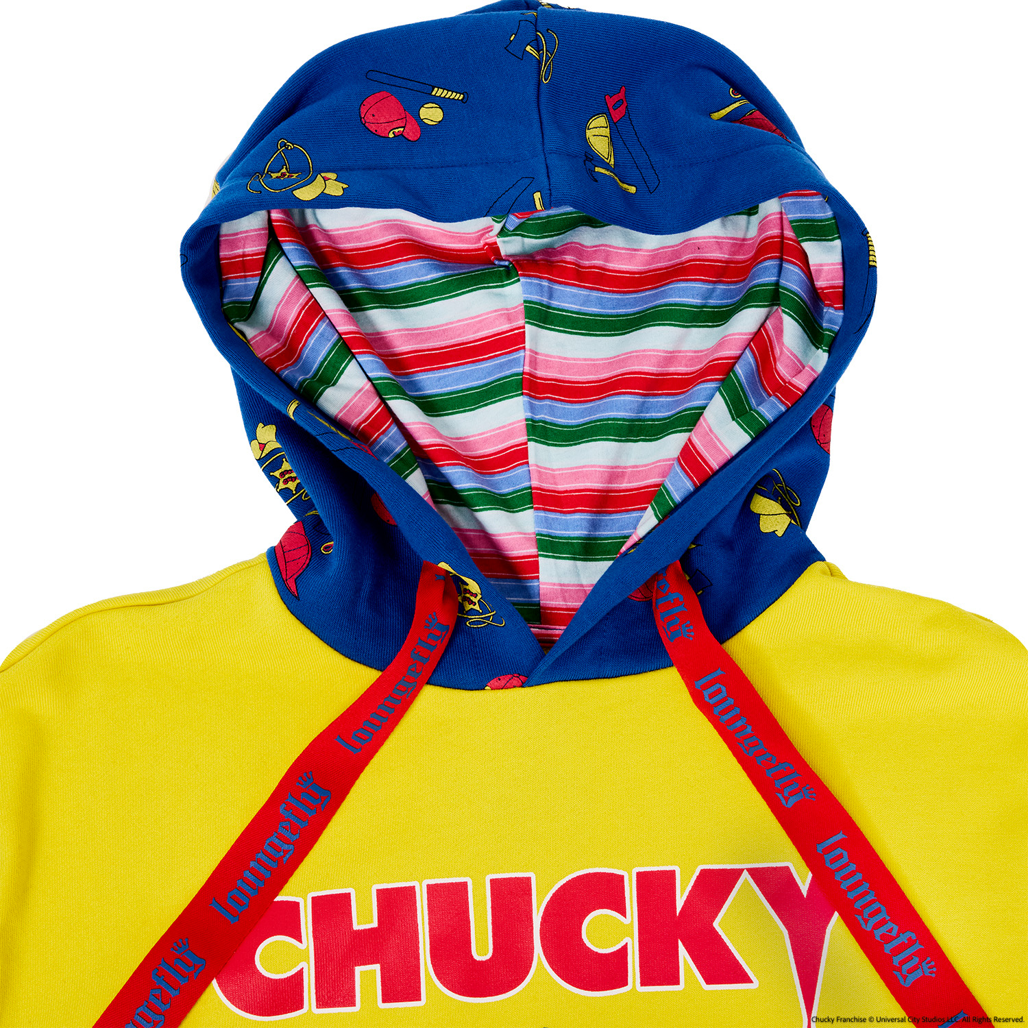 The Good Guy is ready to play up your look. Our Chucky Hooded Jersey, which resembles a Good Guys Chucky doll box, is full of frighteningly fun details. On the bright yellow middle portion, letters in red spell out “Chucky,” and the text below reads, “He wants YOU for a best friend.” It also appears that he’s ready to come out of the box, as he “slashes” a “knife” with a metallic applique blade through the clear “plastic window,” which is really a clear gel print. You’ll also see that the Chucky “box” includes pictures of the Good Guys accessories and a message to collect them all. The sleeves, similar in color to Chucky’s denim overalls, feature a motif of Good Guys accessories, such as cowboy hats, baseballs, and more. Head off to a memorable play date or other adventures in style.