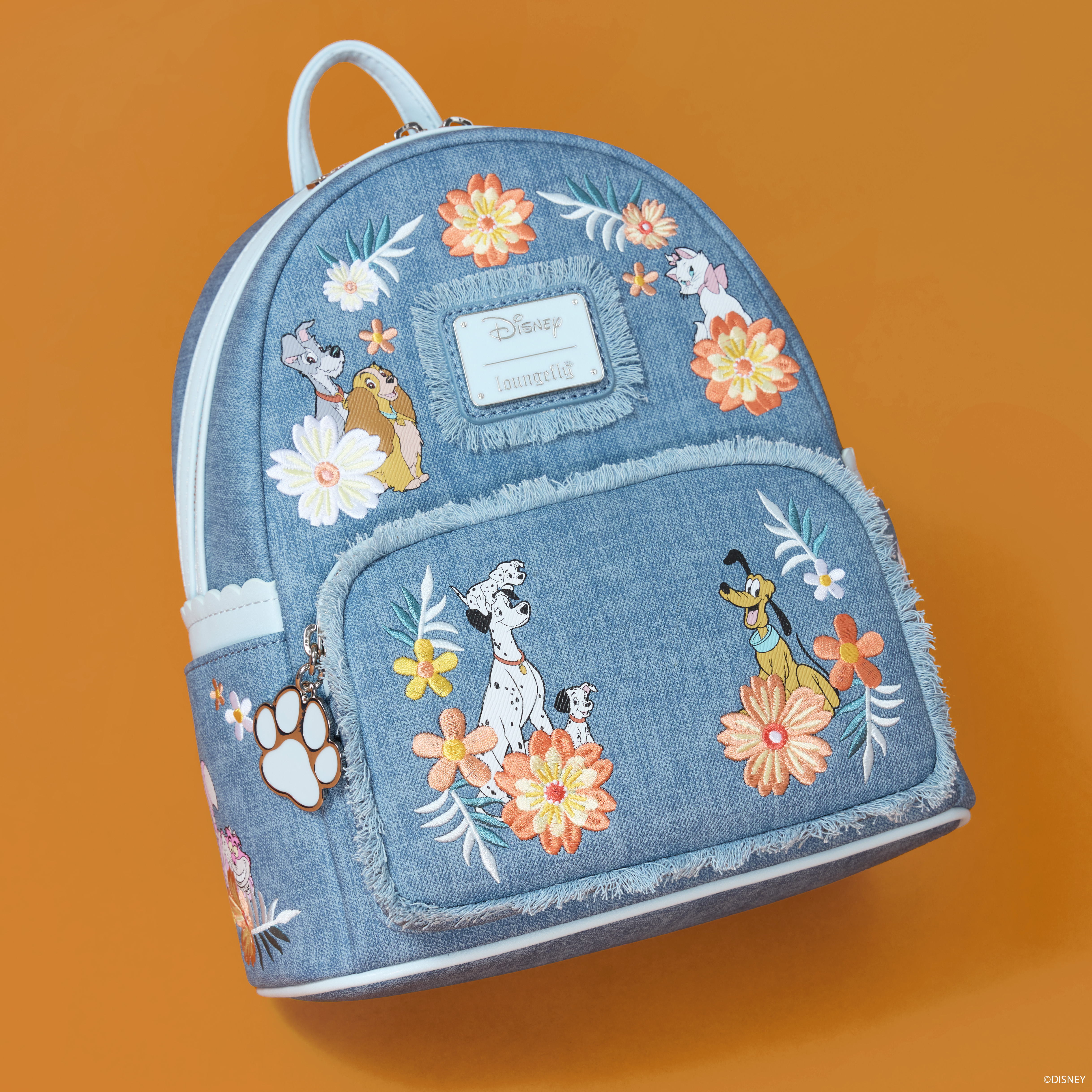 This denim mini backpack is covered in embroidered floral details – amongst them you'll find images of your favorite Disney dogs and cats!