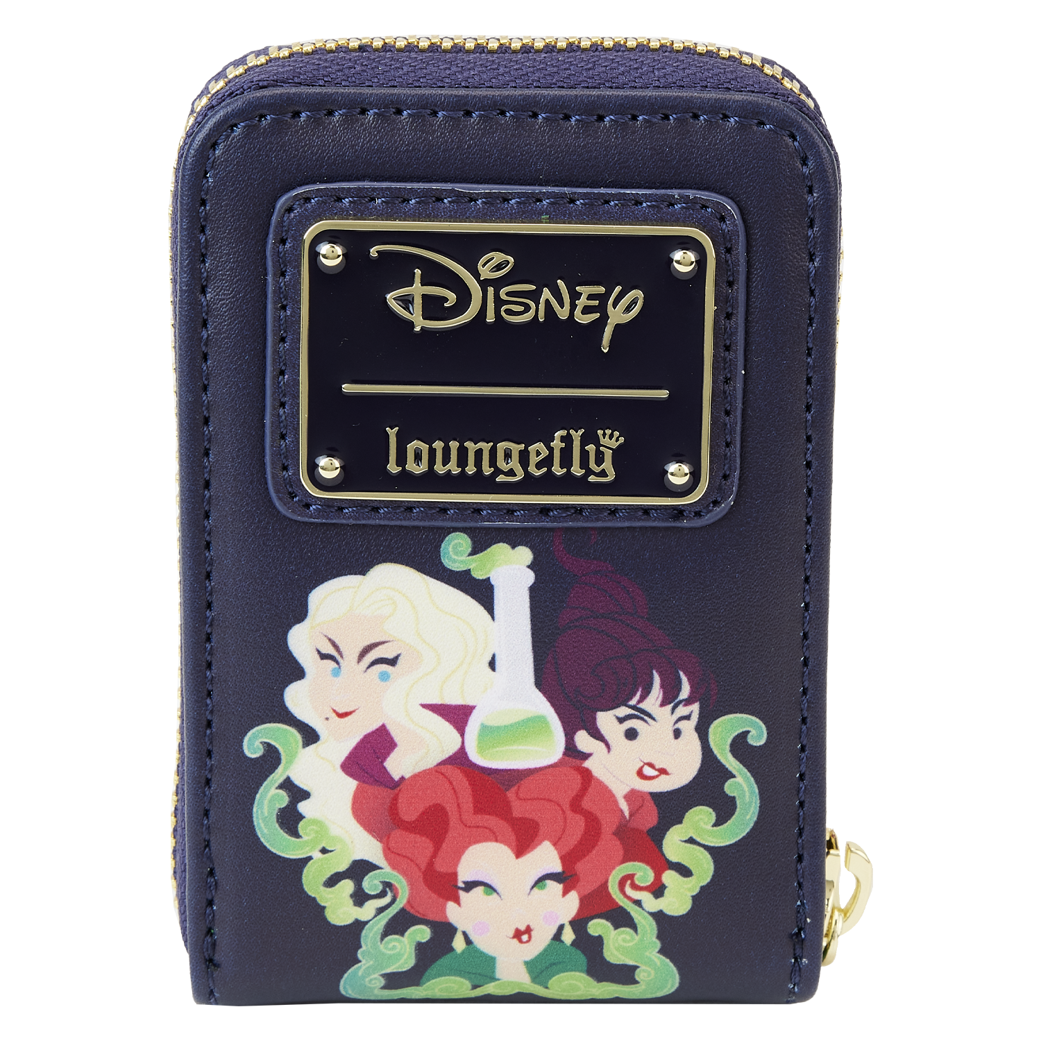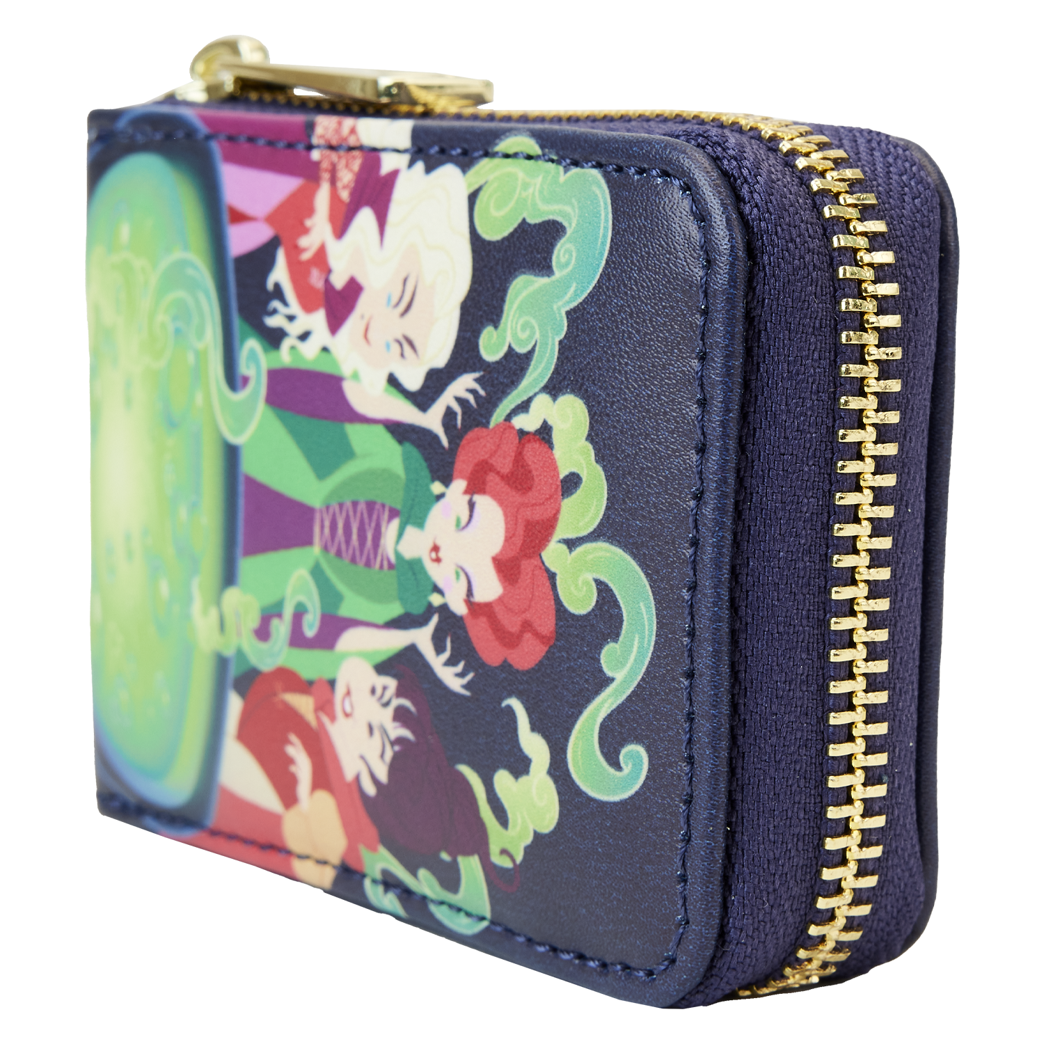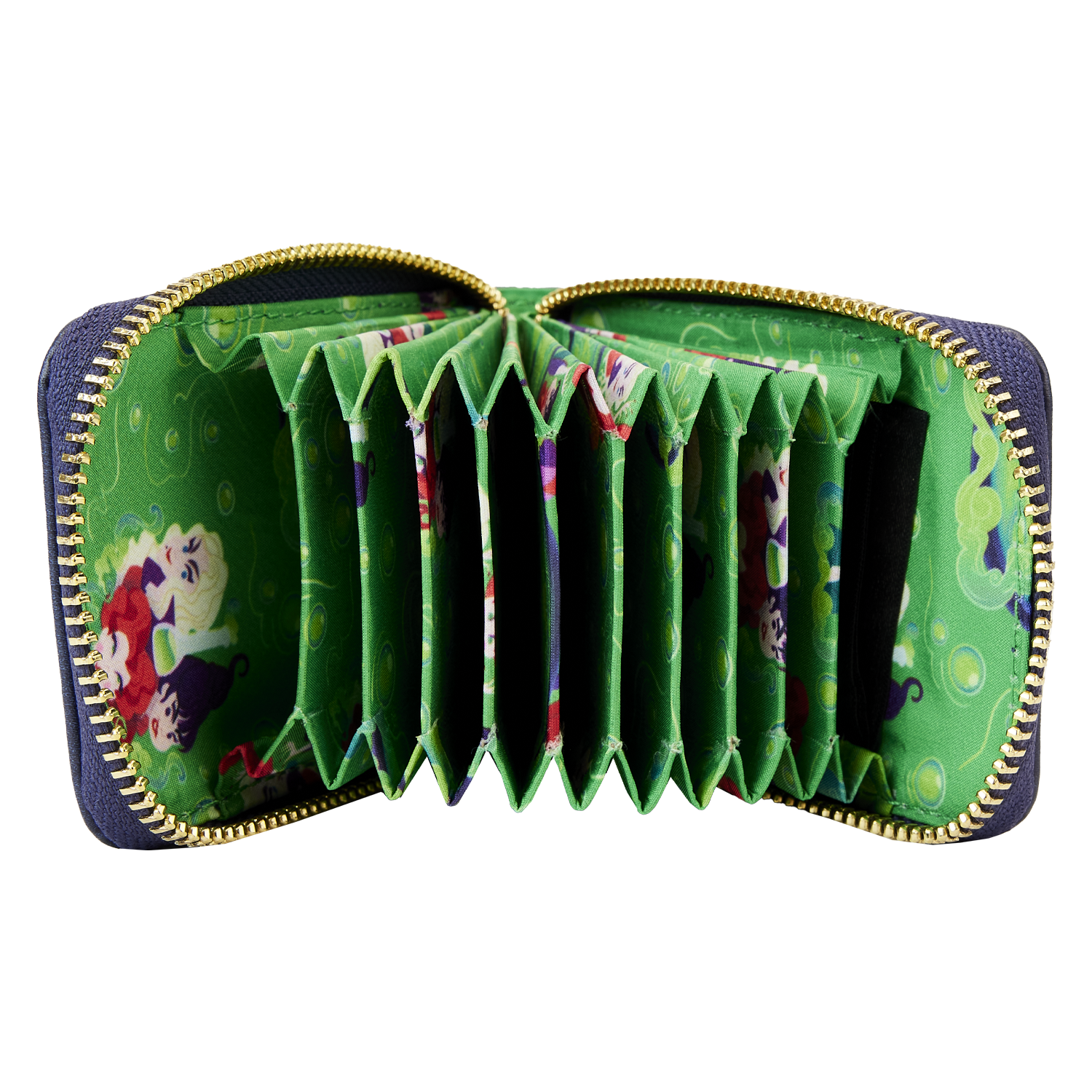 The Loungefly Disney Hocus Pocus Sanderson Sisters Cauldron Accordion Wallet is made of vegan leather (polyurethane). Wallet zips closed and has gold-colored metal hardware. Additional features include printed, applique, debossed, and glow-in-the-dark details. Take note of the coordinating inside lining.