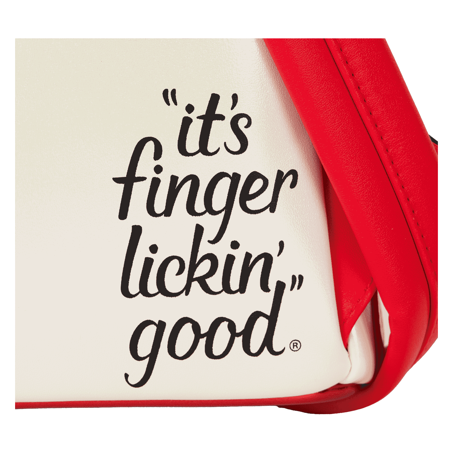 A deliciously stylish bag! This KFC mini backpack is truly iconic and ready to make a statement. The classic KFC bucket is portrayed on the bag in sherpa, embroidered, and pearlescent detail. You'll find plush wings sitting within the front pocket "bucket." Turn the bag around to find the tagline, "It's finger lickin' good" written on the back. Take your KFC love to next level – every KFC fan needs a statement bag like this!