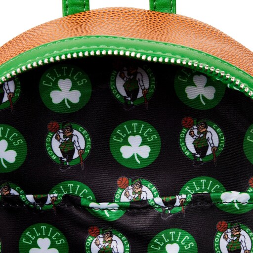 Score a slam dunk with the NBA Boston Celtics Basketball Logo Mini Backpack. On the front, the embroidered Lucky leprechaun logo patch prominently appears just above the zipped front compartment. A pebble vegan leather (polyurethane) material adds texture, recalling the look and feel of a basketball, and green trim adds contrast in team uniform color. Note the coordinating inside lining, which carries a green-and-white motif of Lucky, spinning a basketball, alternating with Celtics shamrock logo.