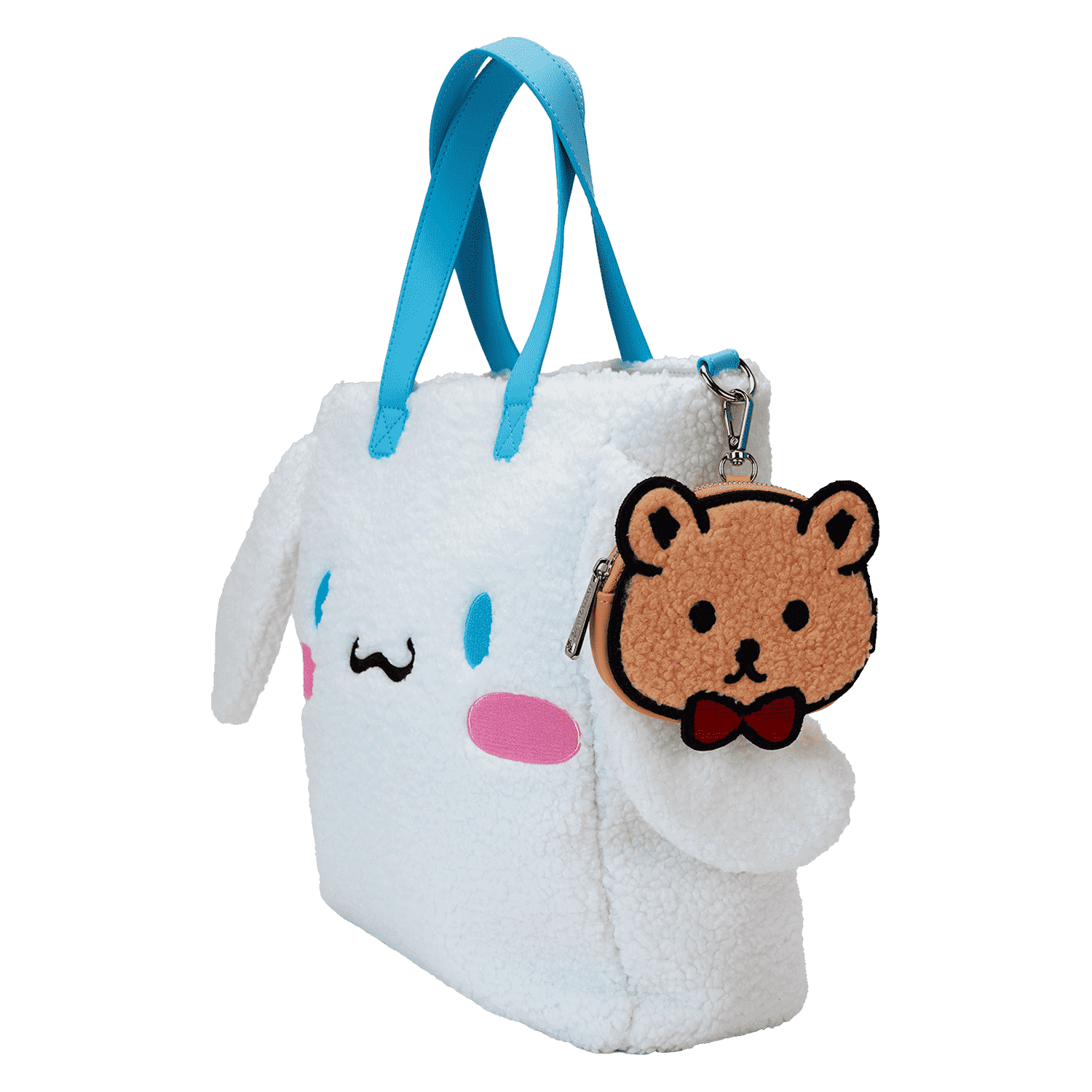Up for a bakery run? Head to Café Cinnamon in style with our Cinnamoroll tote bag, which is covered in soft white sherpa material. Cinnamoroll takes shape on the bag in applique and embroidered detail. Even his adorable ears stick out on the sides. On the strap, you’ll find a detachable coin bag with Bear’s applique face placed on top. Cuddly brown sherpa material covers his face as well. Pack your daily essentials in this roomy tote and share smiles wherever you go.