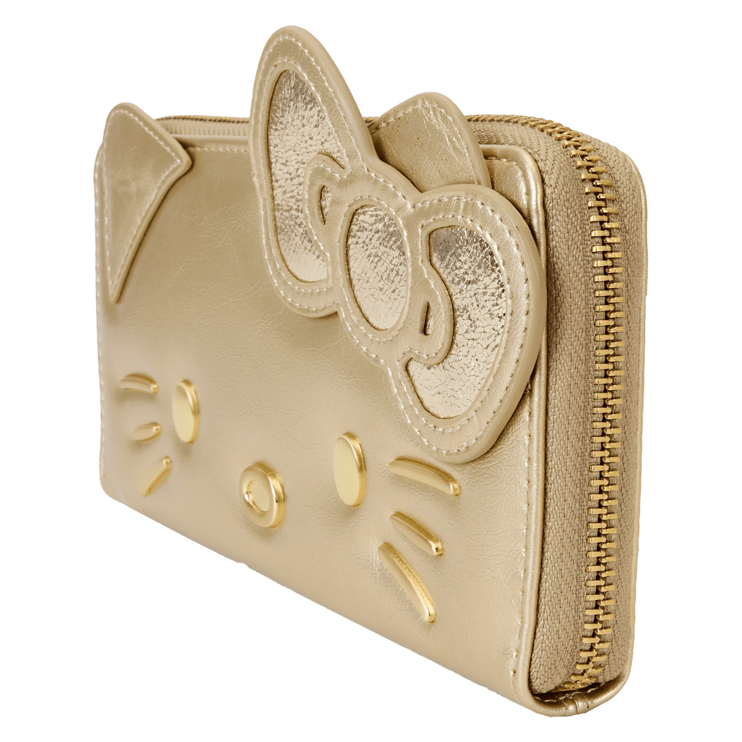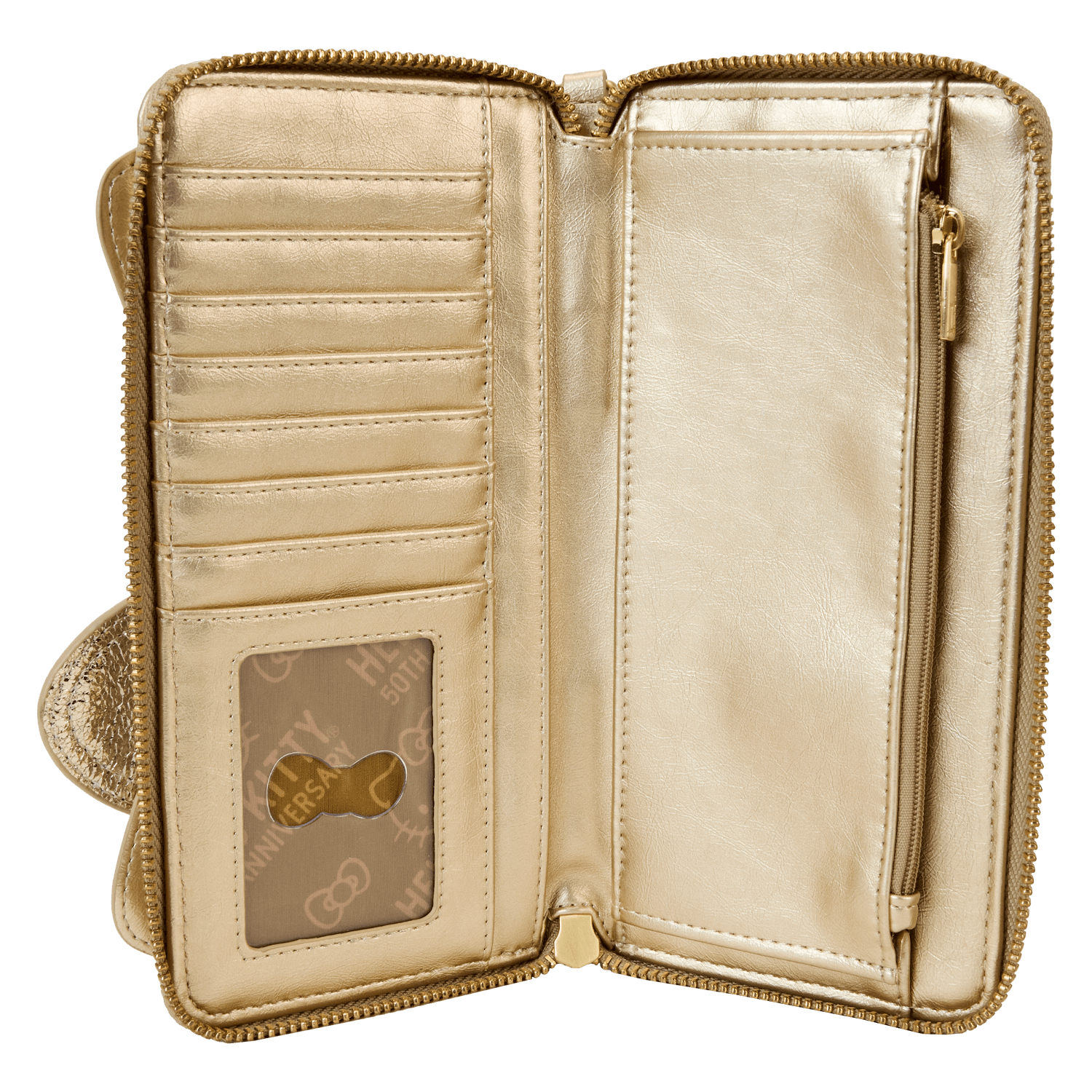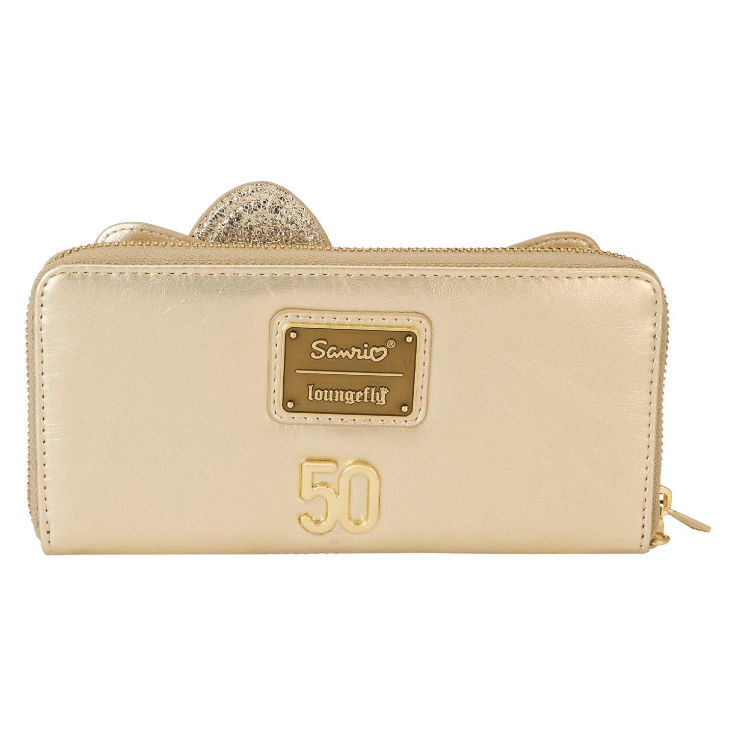 This pop icon is celebrating 50 years of timeless style! Look to the future with Hello Kitty as she commemorates her golden anniversary. With molded metal details and a metallic shine, this wallet makes an elevated statement piece for any outing.