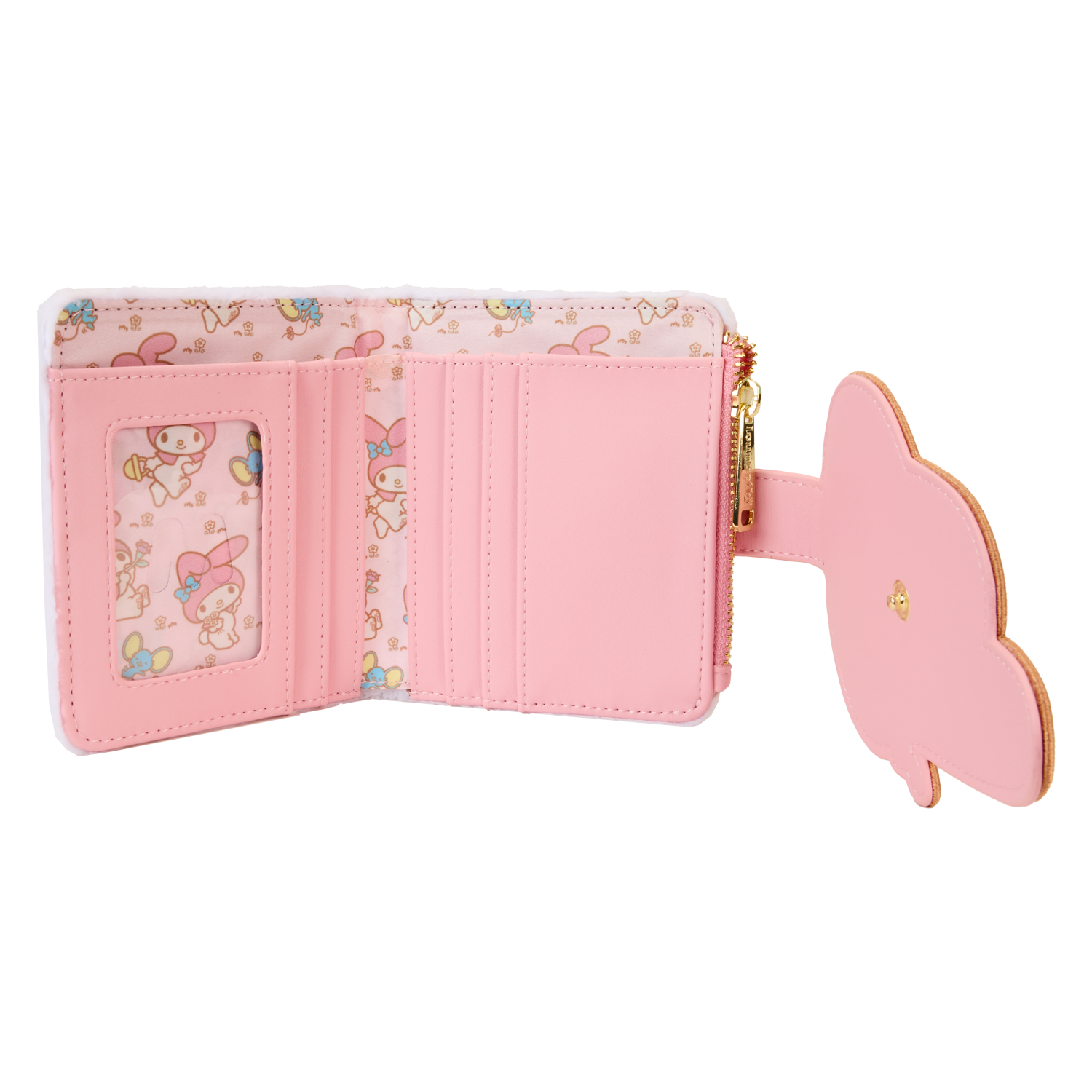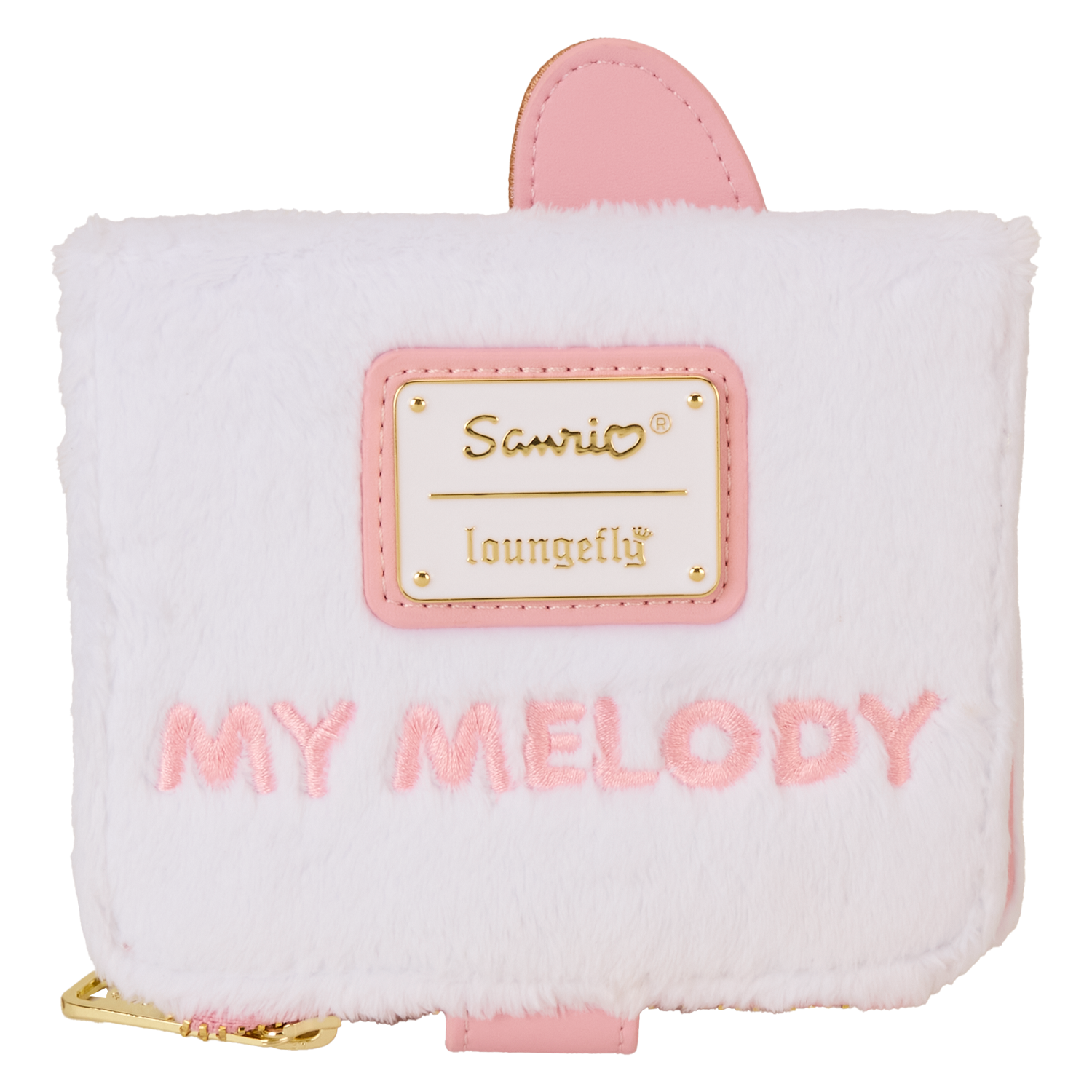 Browse the cookie and almond pound cake shops in style! Take along this exclusive My Melody bifold wallet. The sweetest of details come to life in white plush and pink embroidery. On the front of this wallet, My Melody’s sweet face takes shape as an applique button flap with embroidered facial features. Her signature hat and ears rise up over the top. White plush appears behind her and carries over to the back of the wallet. Flip this accessory around, and you’ll find the words “My Melody” embroidered in pink. Secure your valuables for the day and share smiles wherever you go.