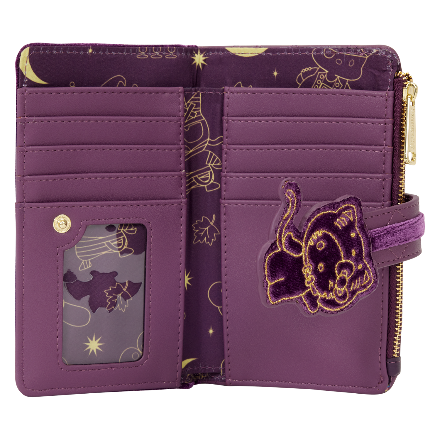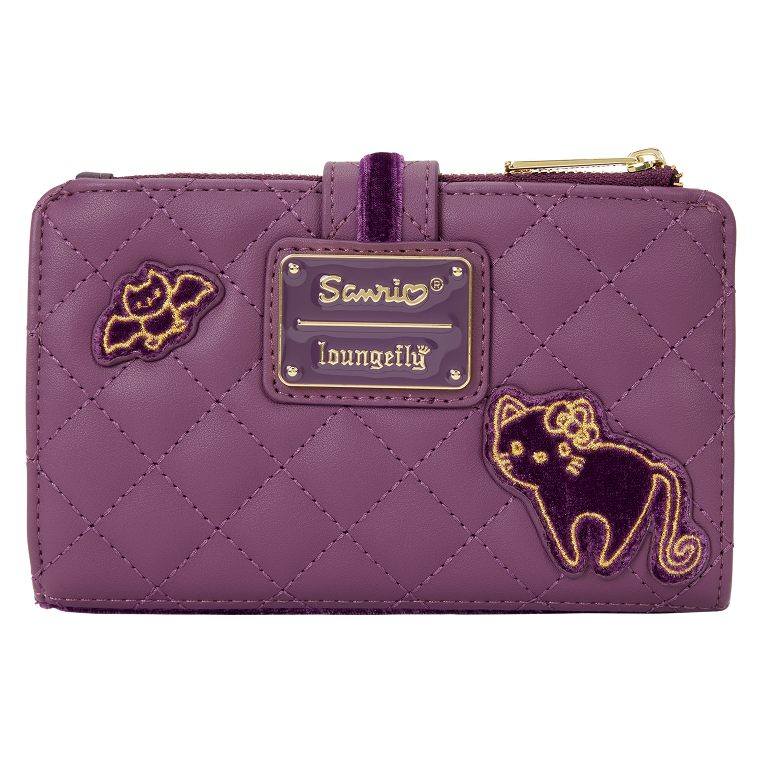 This flap wallet features faux leather and faux velvet trim with quilted details. You'll find Hello Kitty dressed as a cat for Halloween on the front. She's embroidered in gold thread, along with jack-o'-lanterns, candles, and bats. Turn the wallet around to find another image of a bat and a Hello Kitty cat! Inside, there are seven card slots and one clear slot for an ID.