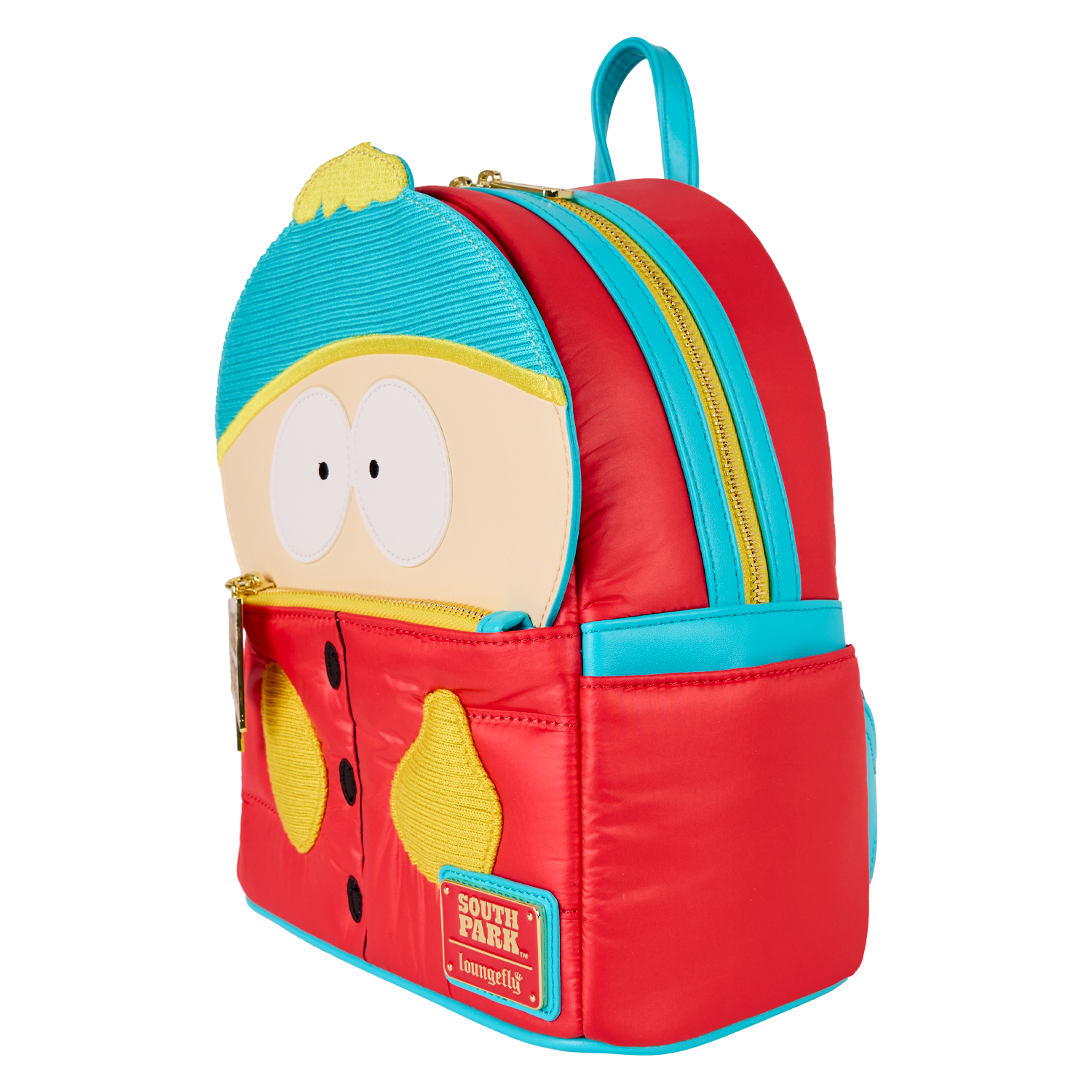 You'll find sherpa, embroidery, wool, and puffed nylon details to bring Cartman to life on a Loungefly bag. His hands hug the front pocket as he looks out from the top of the bag. The zipper pull is in the shape of the South Park sign!
