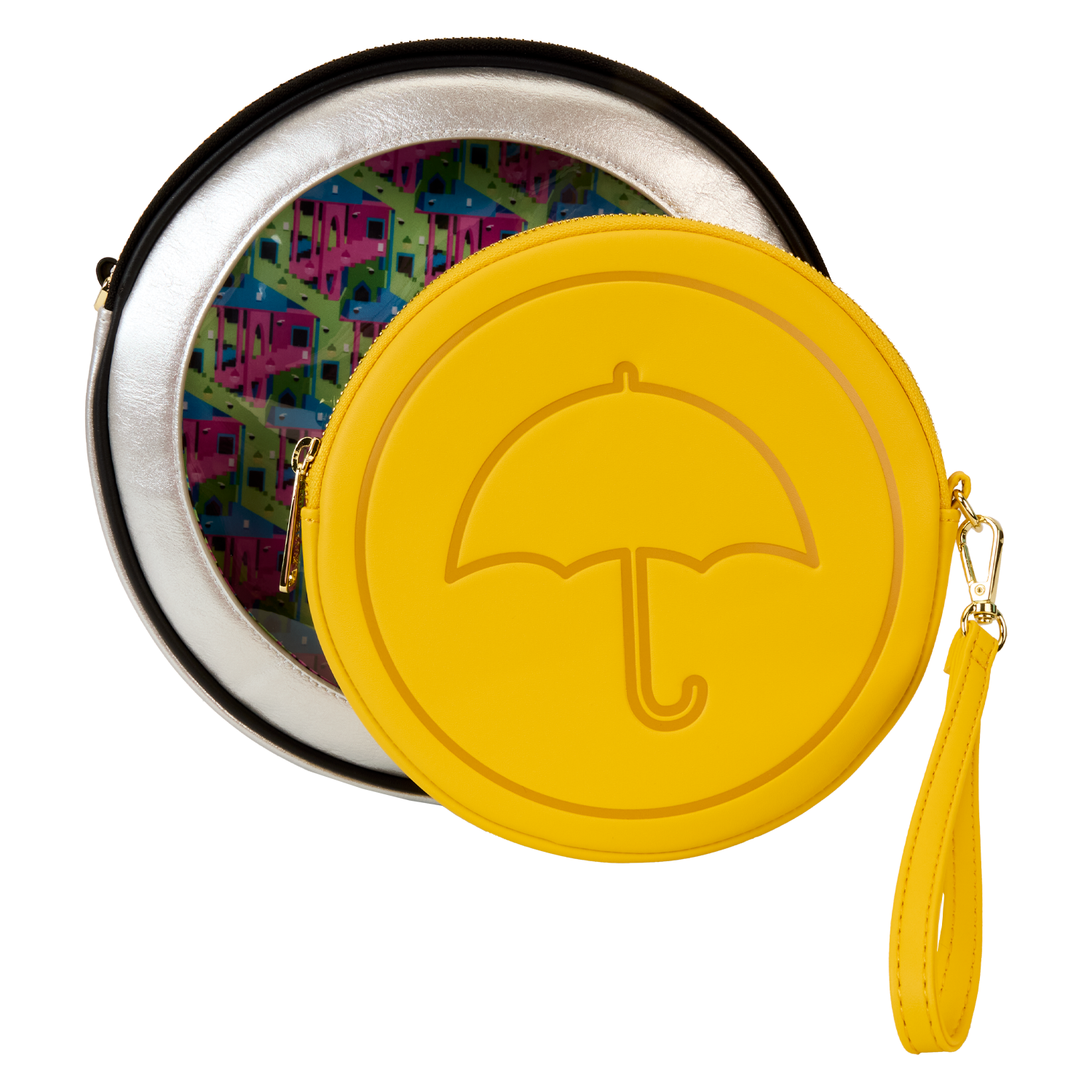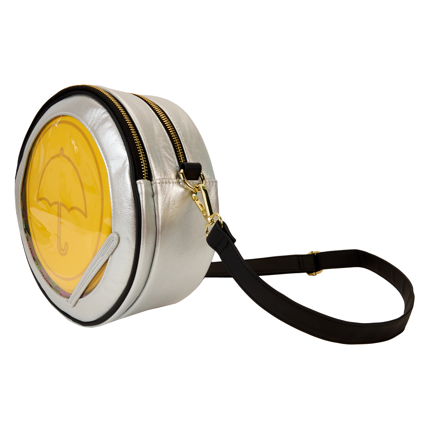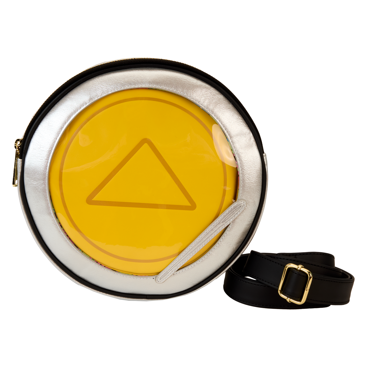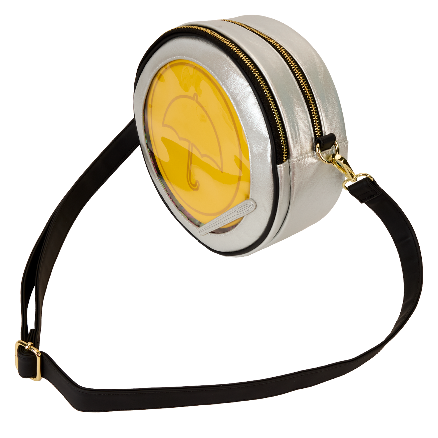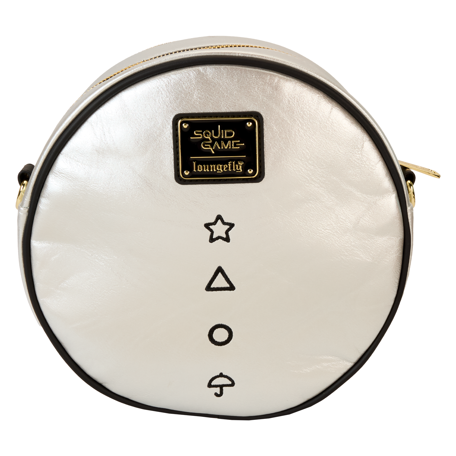 A winning look takes shape on this Squid Game crossbody bag. Relive iconic moments from the Netflix series with this accessory, which showcases the Dalgana challenge. This fully figural bag, in the circular shape of a candy tin, holds a reversible and detachable yellow coin bag. The coin bag displays the umbrella shape on one side, and a triangle on the other. Silver metallic faux leather adds extra sparkle, along with clear PVC material on the front. A die-cut applique of the cutting utensil for this game adds a realistic detail. Pack your daily essentials and take on any challenge in style.