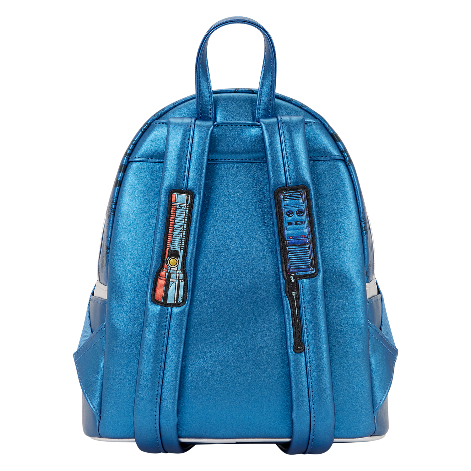 This Stranger Things mini backpack features a van on the front that says “WSQK” on the hood and “Hawkins’ Hitmaker” on the front windshield. Clear PVC, debossed, and embroidered details bring the van to life. Plus, the headlights light up! All over the body of the bag, you’ll find debossed images of various things from Stranger Things, like vinyl records, headphones, Hellfire Club symbols, and more! For an extra fun detail, you can find appliques of a flashlight and a walkie talkie on the straps!