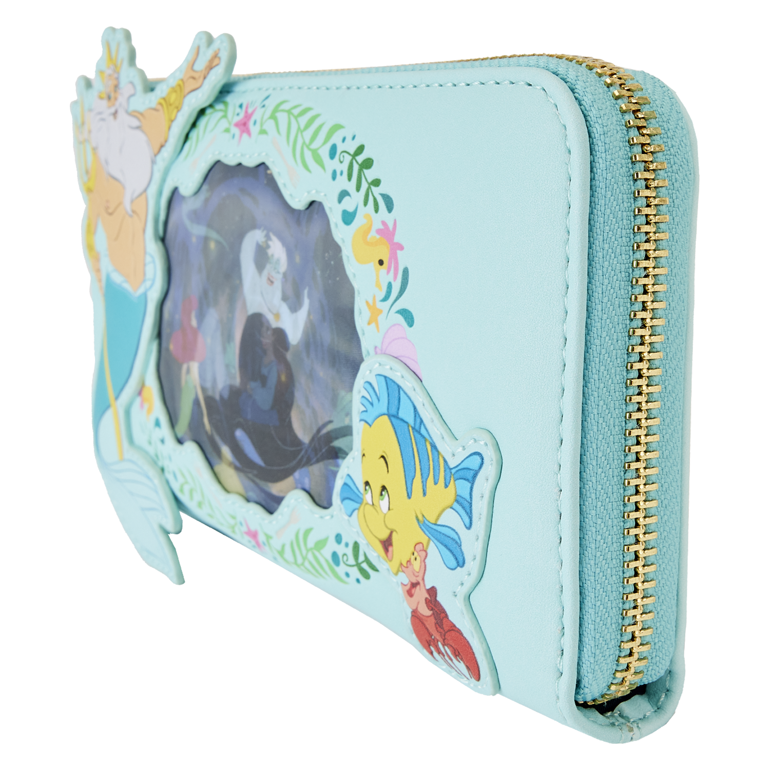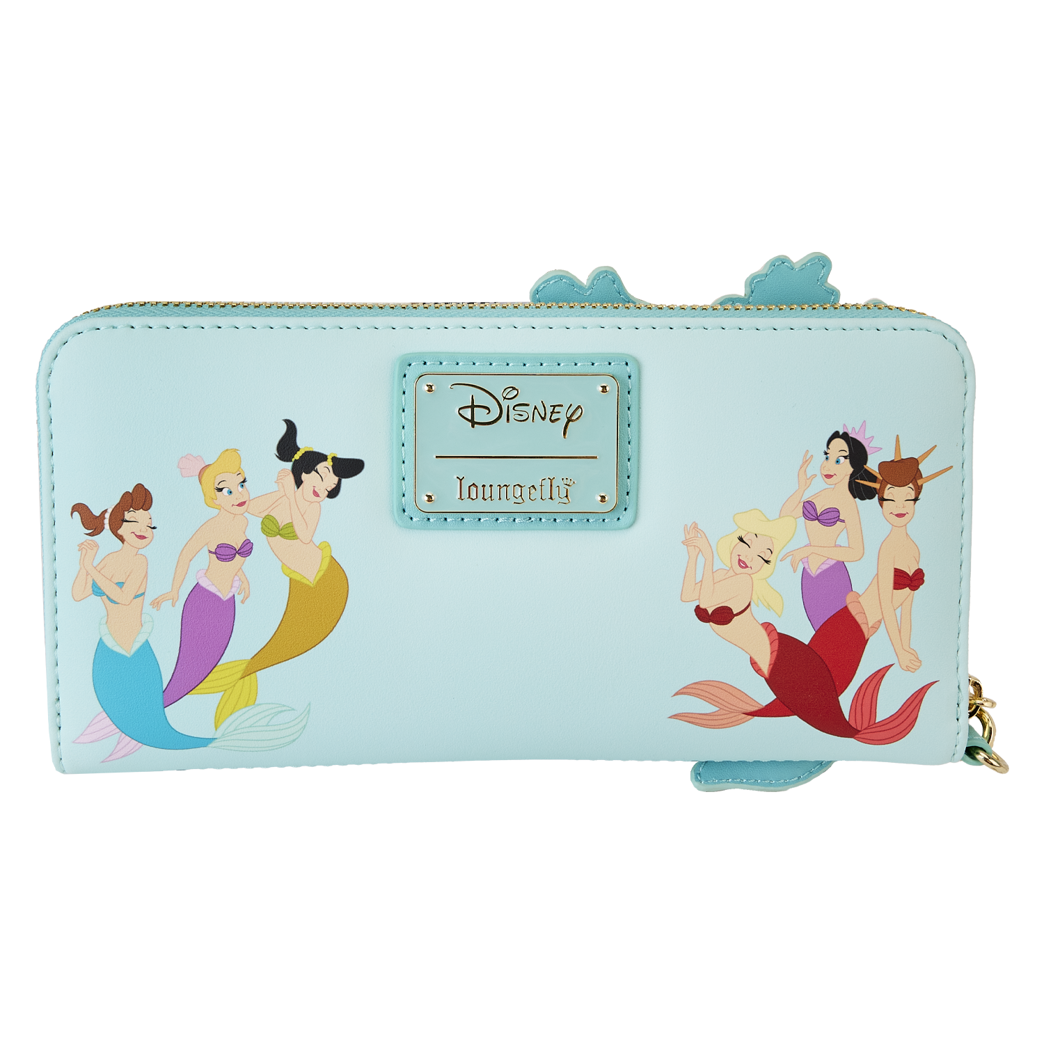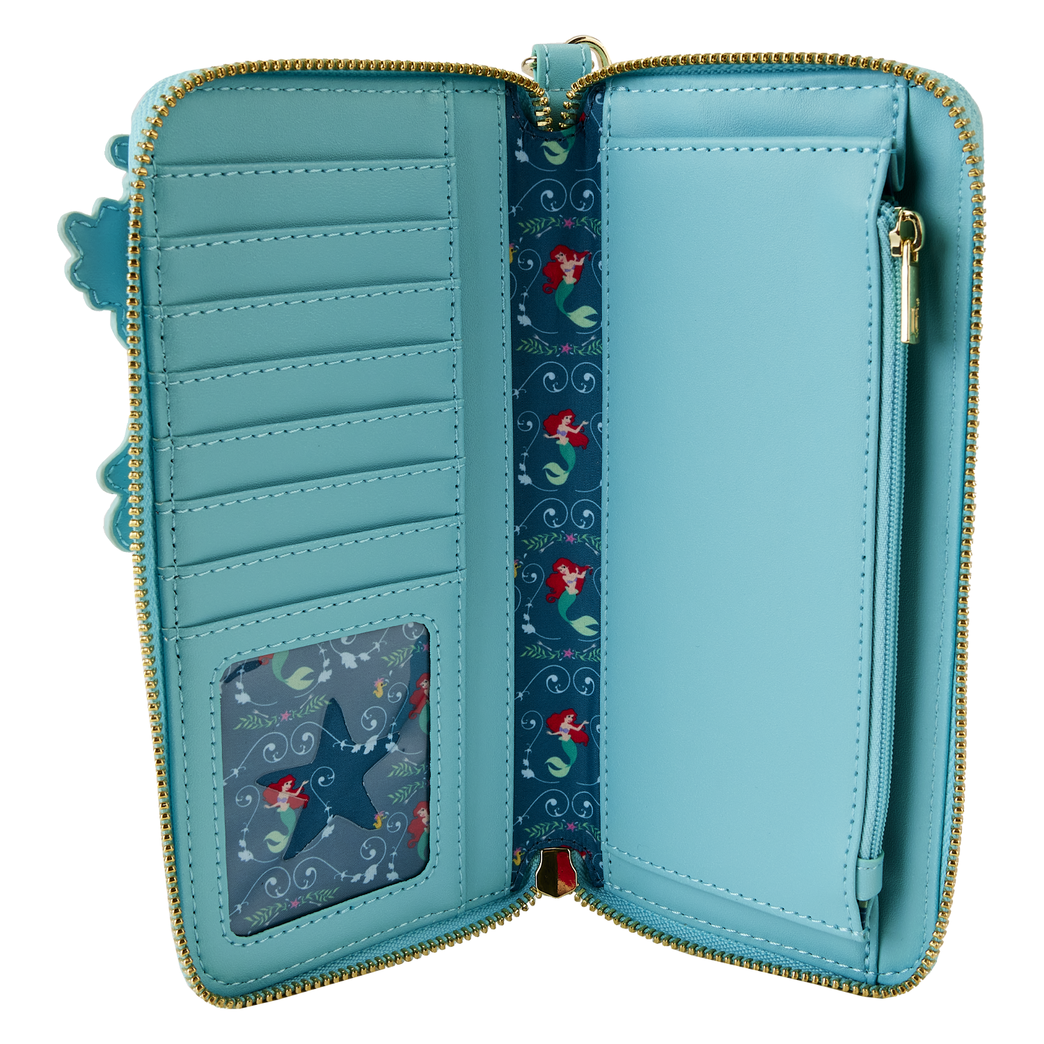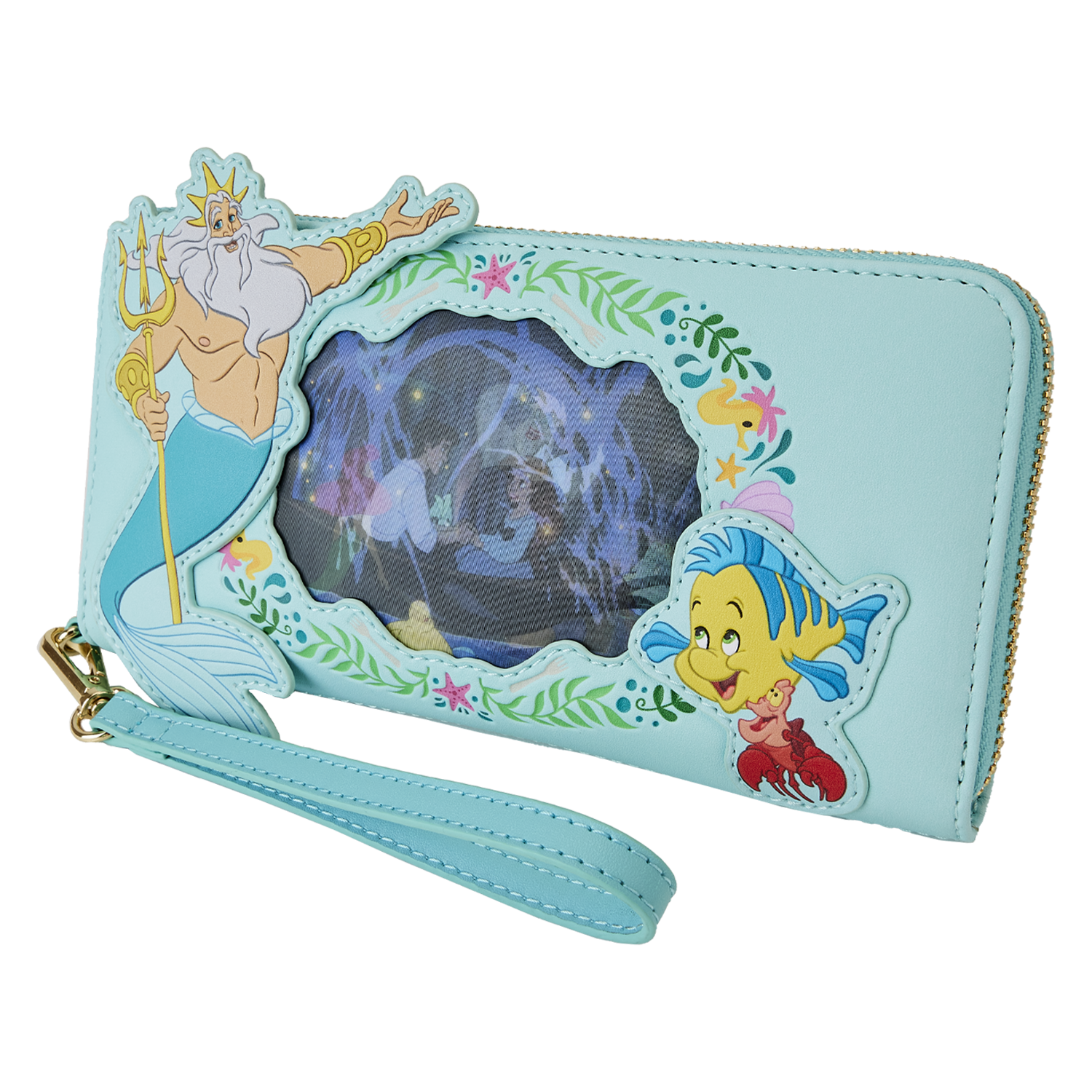 The Loungefly Disney The Little Mermaid Princess Lenticular Wristlet Wallet is made of vegan leather (polyurethane). Wallet zips closed with shiny gold-colored metal hardware, and the wristlet strap is detachable. Additional features include applique, debossed, lenticular, and printed details. Take note of the coordinating inside lining.