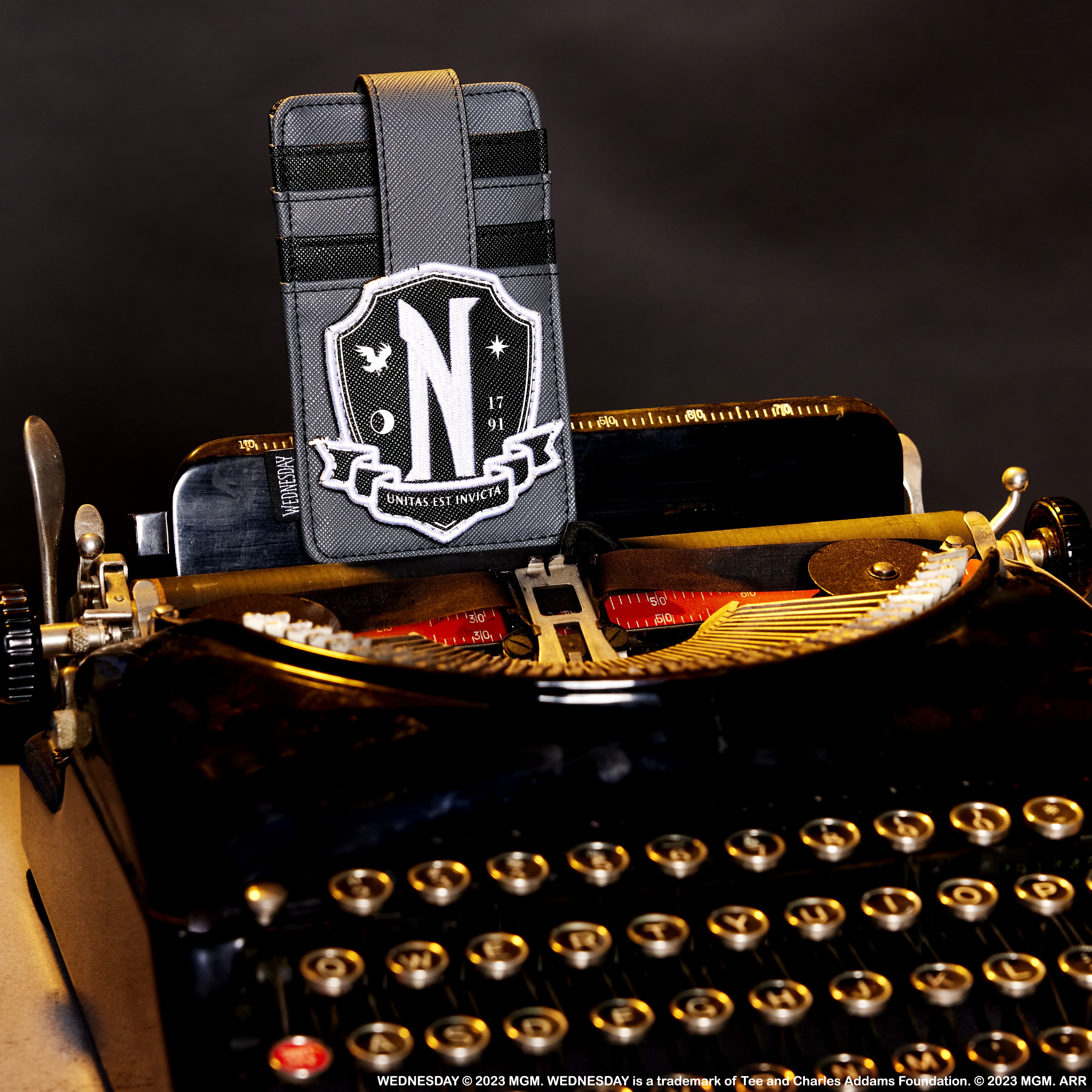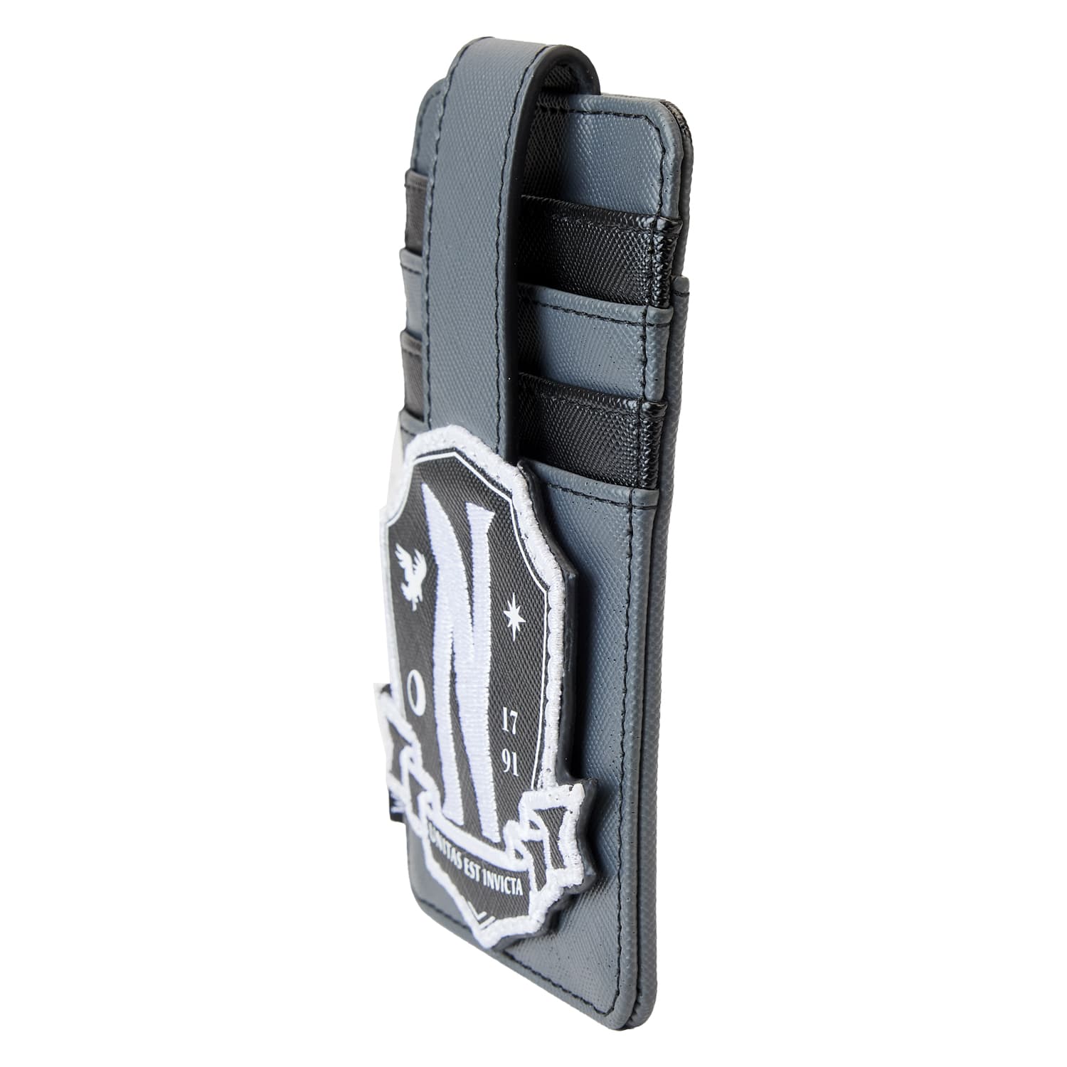 Torture looks good on you. Make every day a living nightmare with the exclusive Loungefly Wednesday Nevermore Cosplay Card Holder. Commemorating Wednesday Addams’ allergy to color, this accessory uses a greyscale color palette to execute the Nevermore Academy uniform. Snap your fingers twice to reveal four card slots hidden underneath an embroidered Nevermore Crest, which buttons into place to keep your secrets secure. Wave to Thing on the reverse side of the card holder as he perches within the clear slot for ID. Dressed to kill, this accessory will keep your belongings safe as you hunt down answers to any mystery. Act fast to collect this Loungefly exclusive; supplies are limited.