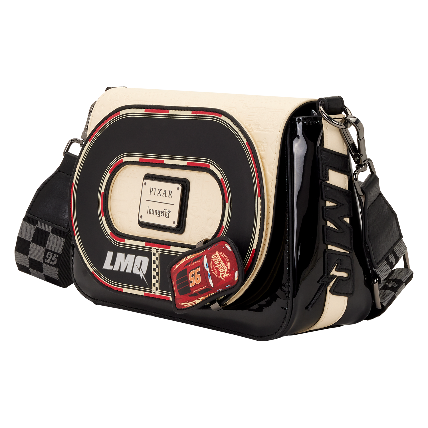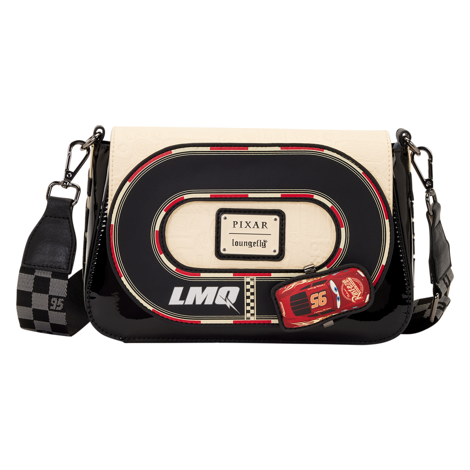 This crossbody features a racetrack on the front flap. An applique of Lightning McQueen actually moves around the track! Pretty epic, right?! The body of the bag is made of glossy patent faux leather for an elevated feel. You'll find "95" written on the back of the bag and a checkered pattern on the crossbody strap.