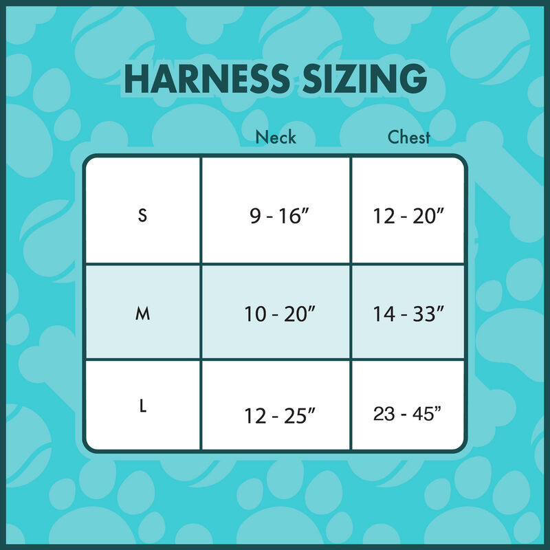 - (Small) Neck: 9”-16” X Chest: 12”-20”; (Medium) Neck: 10”-20” X Chest: 14”-33”; (Large) Neck: 13”-25” X Chest: 23”-45”