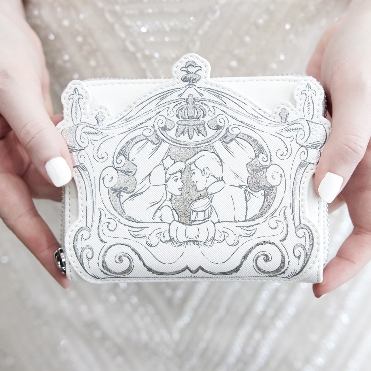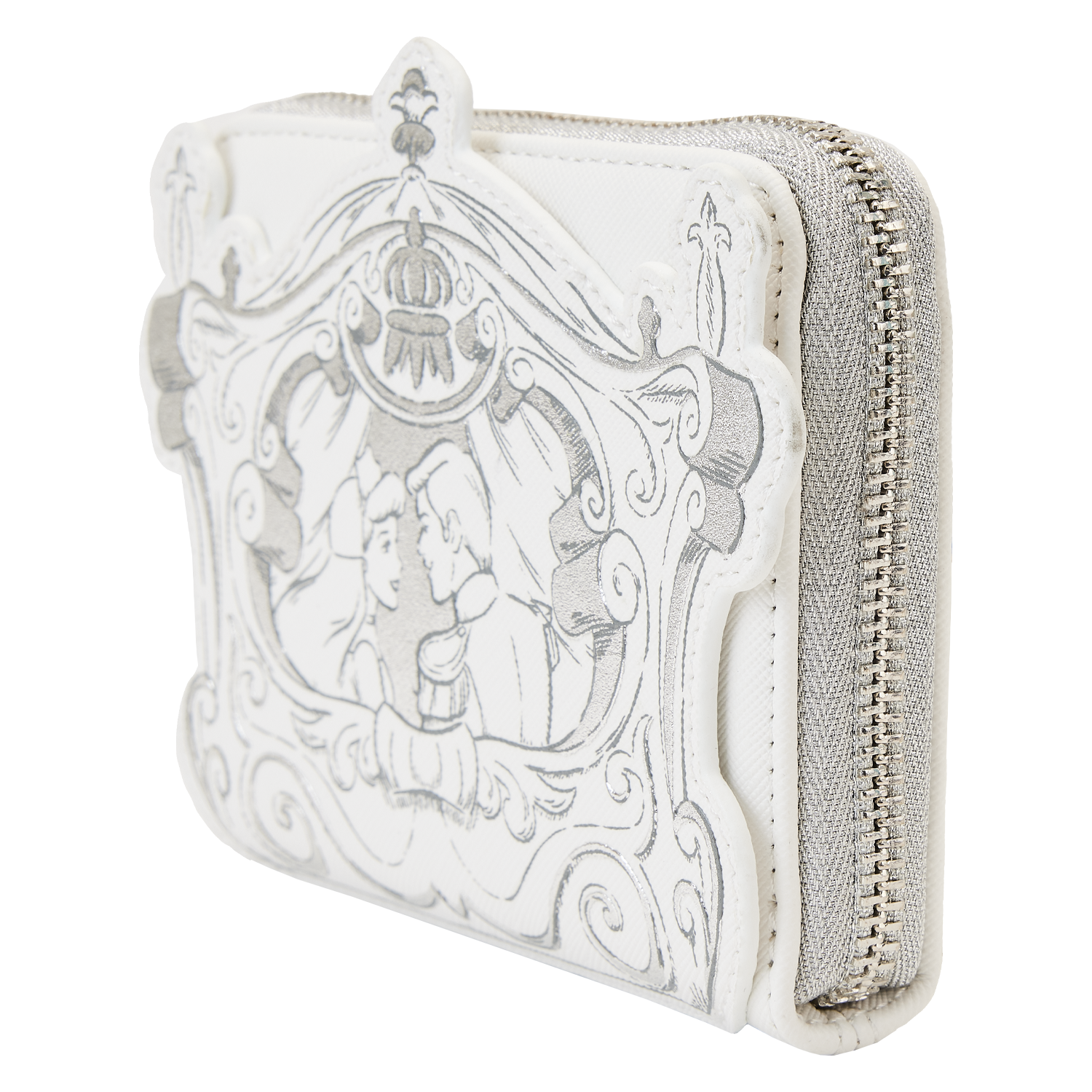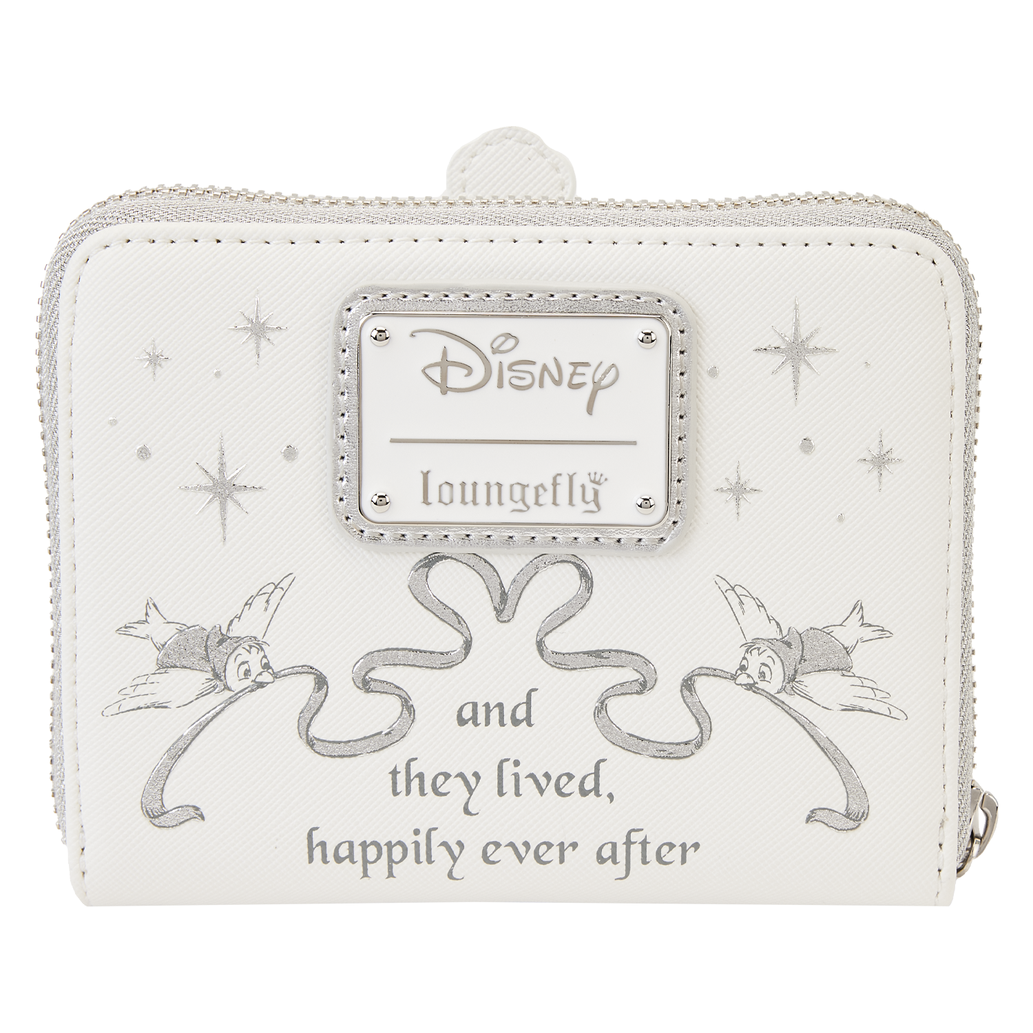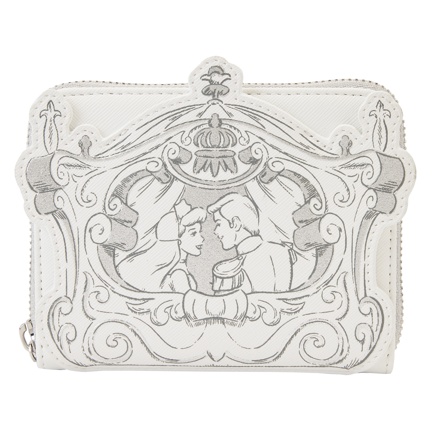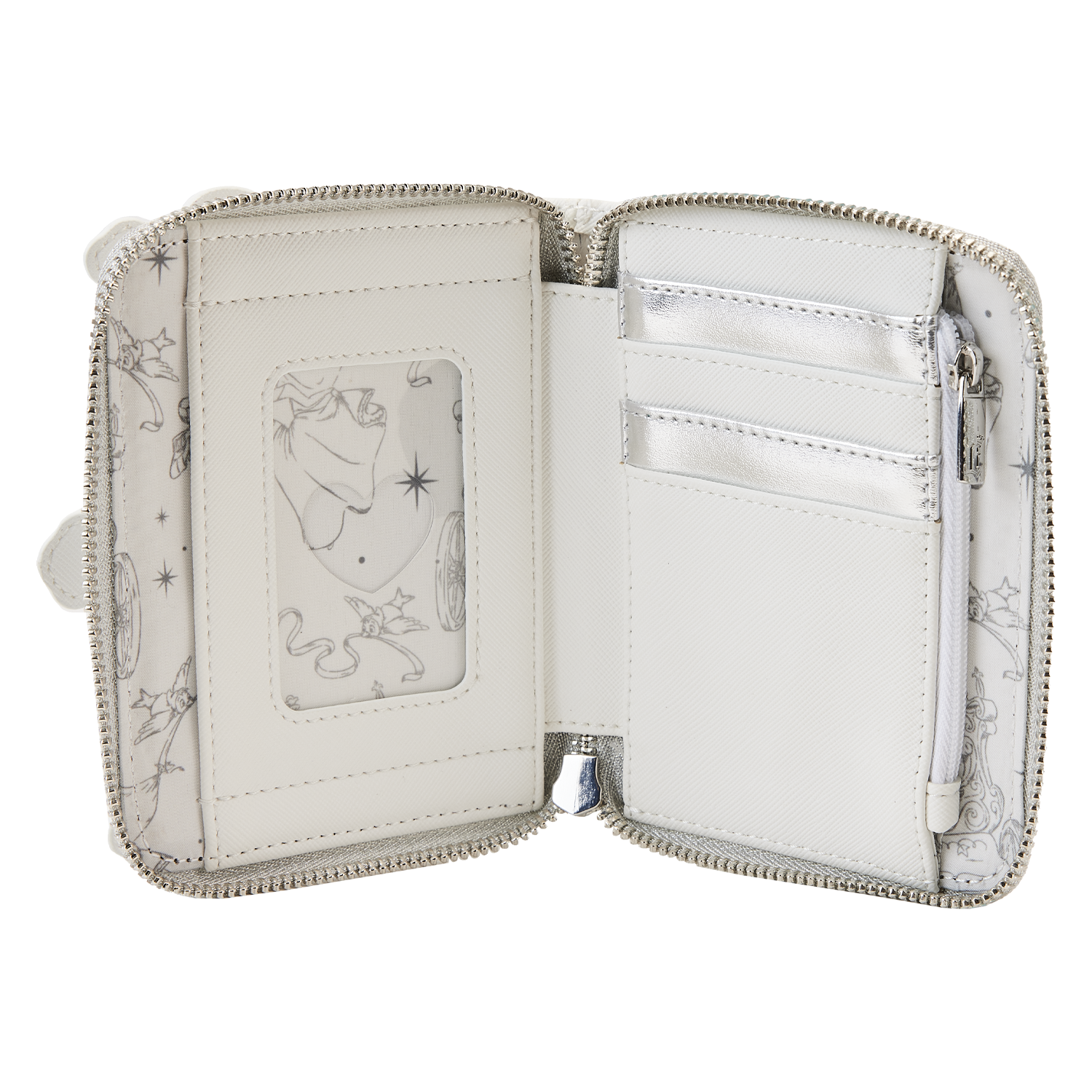 Your carriage awaits! Fairytale dreams do come true with our Loungefly Disney Cinderella Happily Ever After Zip Around Wallet. Silver foil details make this accessory shine. In the foreground, Cinderella and Prince Charming, settled in their carriage, are whisked away to a happy life. The applique carriage details rise up over the top of the wallet. The words “and they lived happily ever after” appear on the back, beneath the silver-foil banner of two adorable birds. An all-over print of silver twinkles adds an elegant touch. Inside, you’ll find 4 slots for holding cards and 1 clear slot for displaying your ID. A die-cut shape of a heart, on the clear ID slot, adds a charming touch. Make a grand entrance wherever you go while keeping favorite Disney memories close.