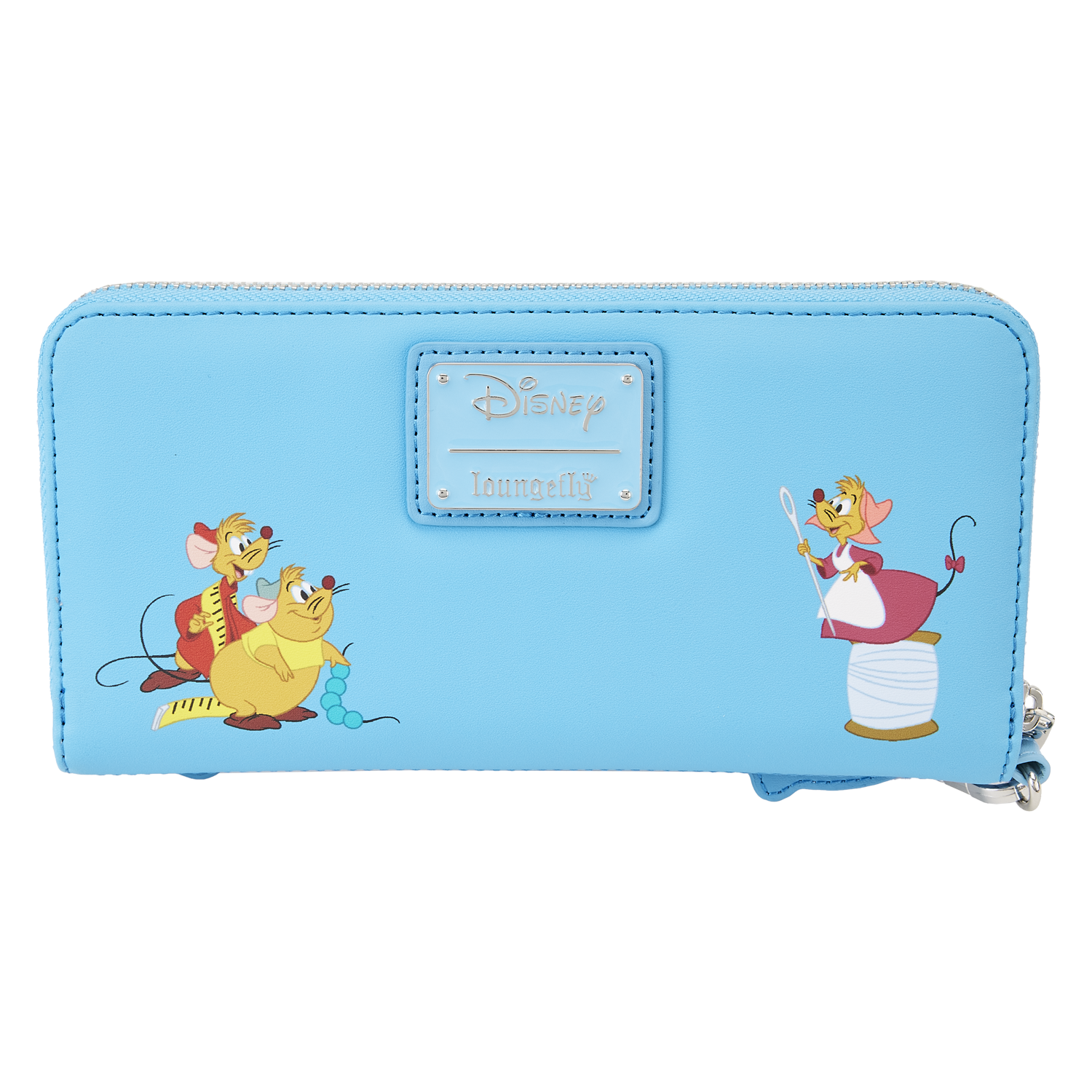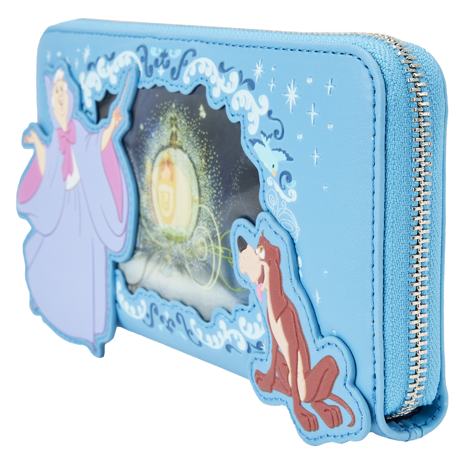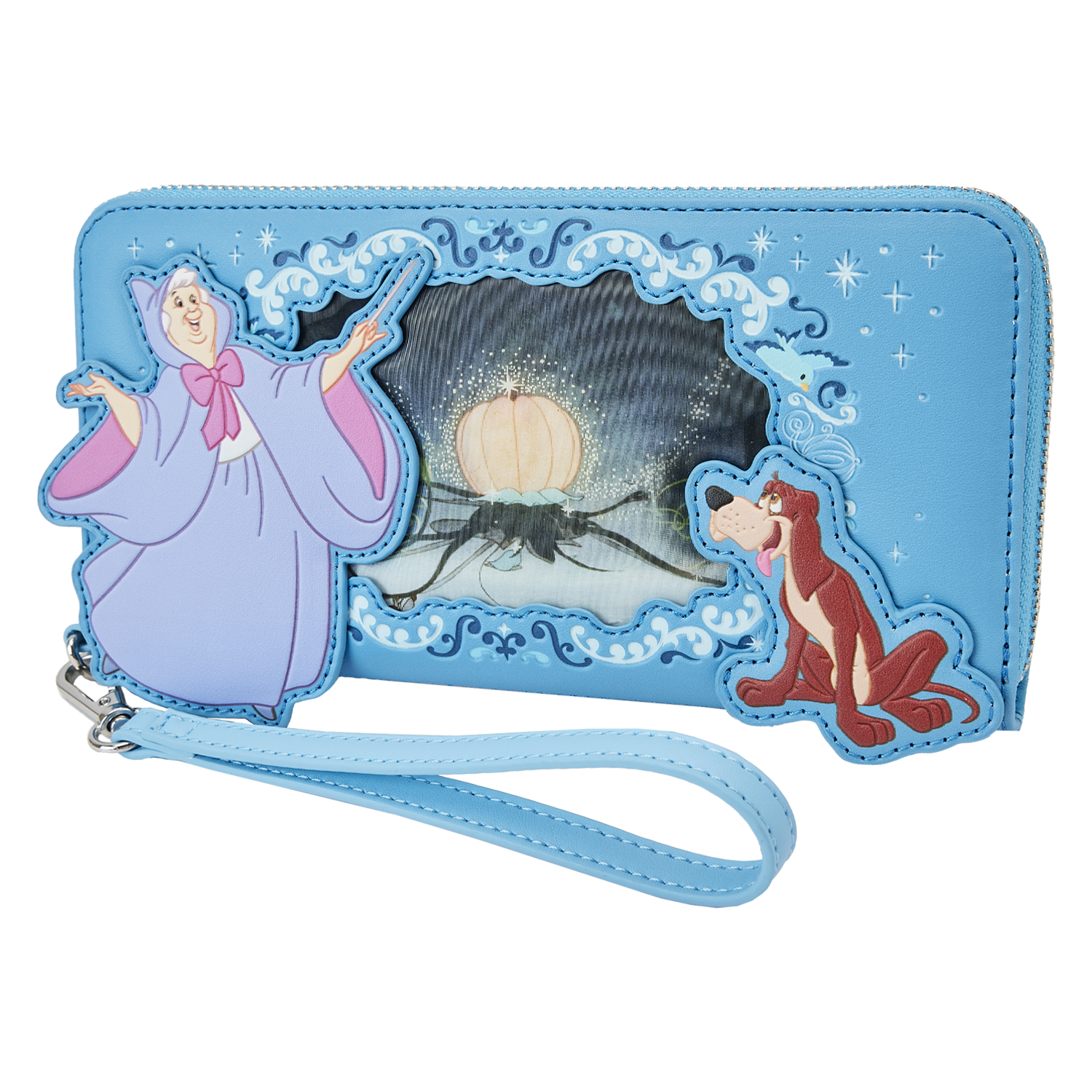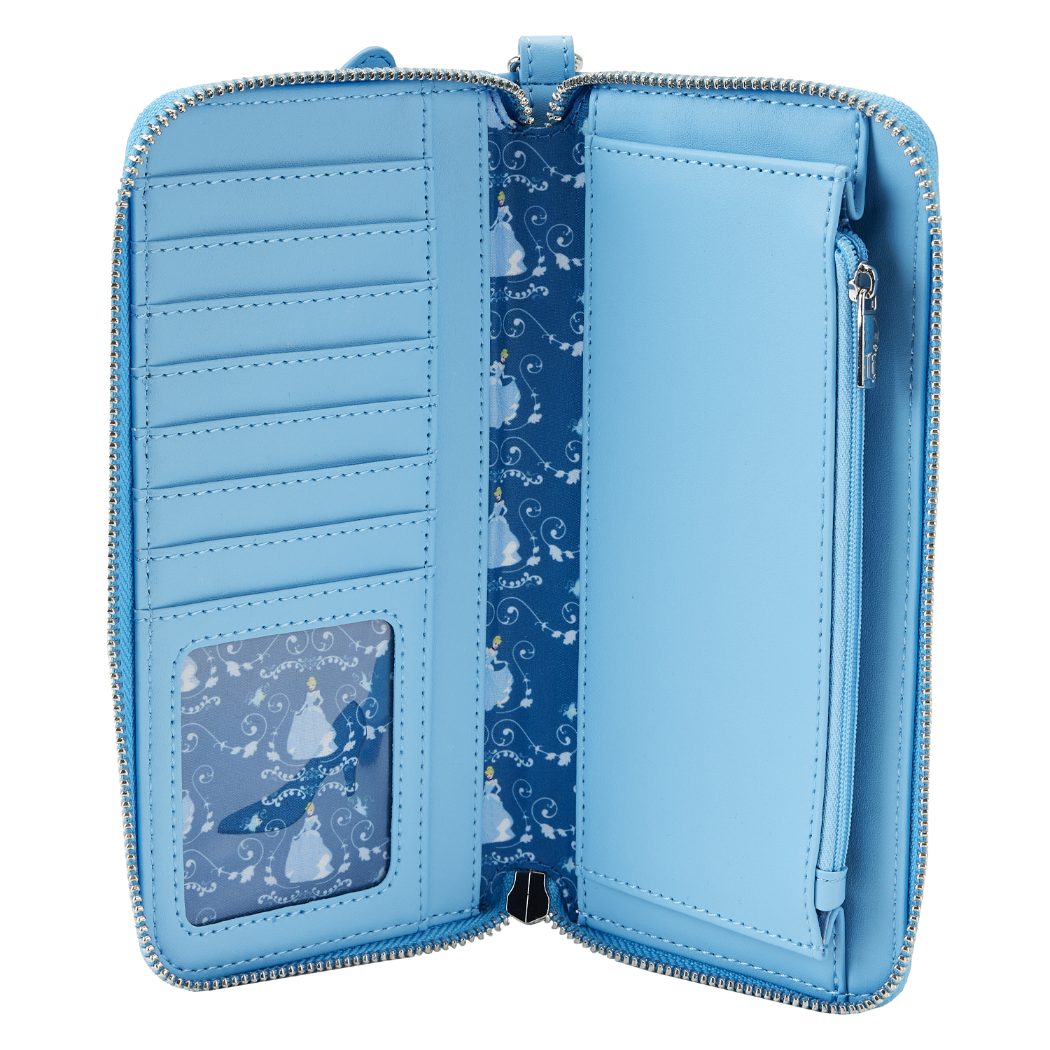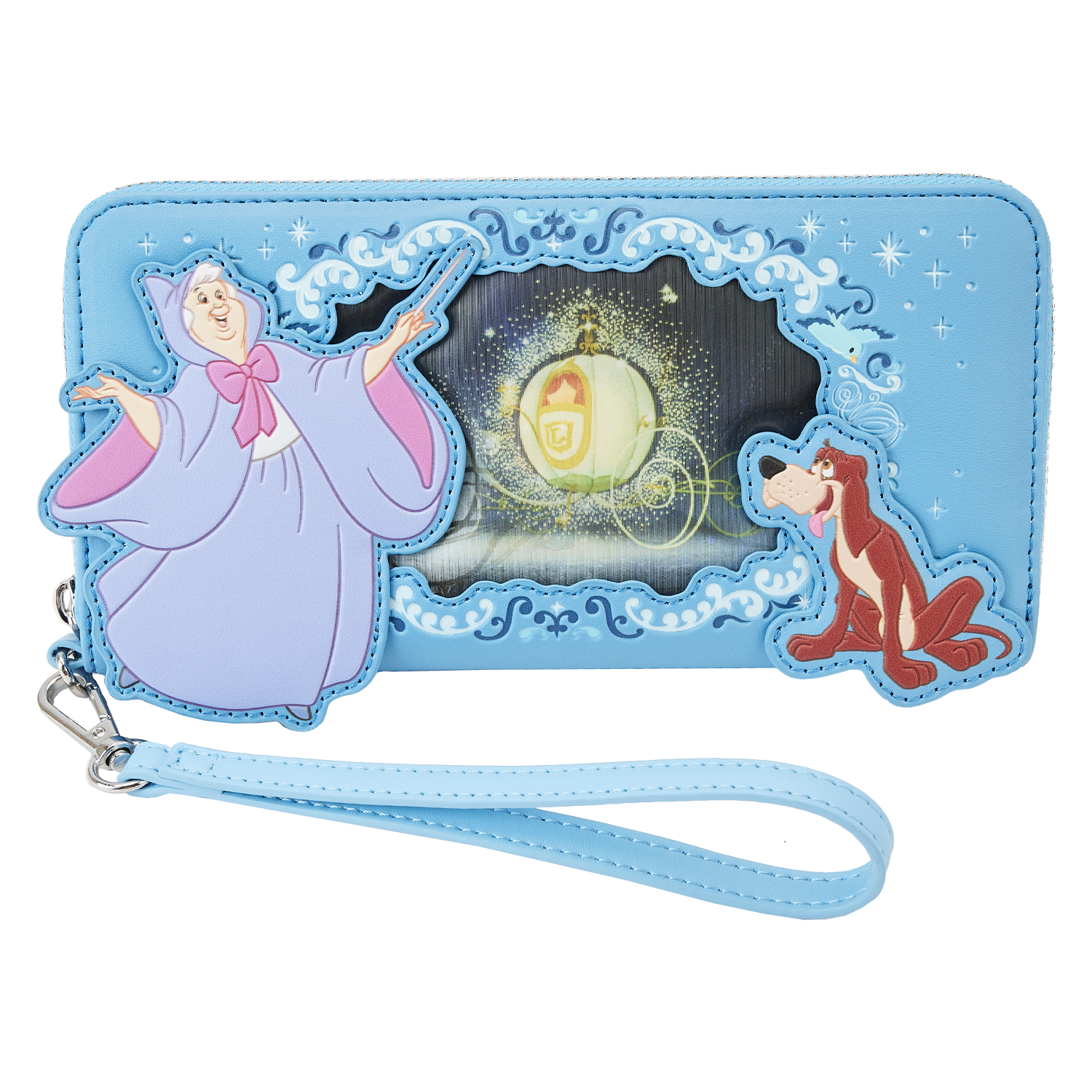 “Bibbidi-Bobbidi-Boo,” our Loungefly Disney Cinderella Princess Lenticular Zip-Around Wallet Wristlet, is a royal dream come true! On the front, in the foreground, the Fairy Godmother and Bruno look into a window as the Fairy Godmother begins to transform a pumpkin. Lenticular details offer an alternate view in which the transformation is complete: A carriage awaits to whisk Cinderella away. On the back, you’ll find Jaq and Gus, as well as Perla on a spool of thread. Inside, this wristlet wallet offers plenty of room to secure your valuables. The larger size even accommodates most cell phones. There are 8 slots for holding cards and 1 slot for displaying your ID. A die-cut shape of a glass slipper adds a magical touch. Dance the night away—or simply turn all your outings into royally fun adventures.