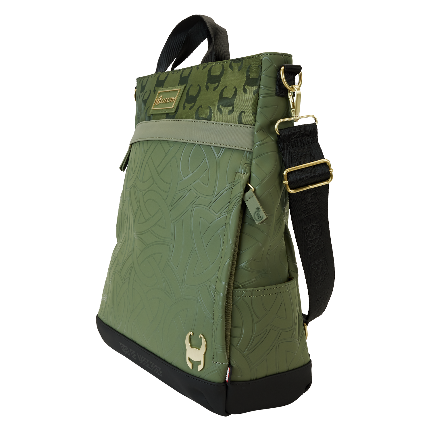 The Loungefly COLLECTIV Marvel Loki The CREATIV Convertible Tote Bag features an adjustable, detachable strap, shiny gold-colored metal hardware, vegan leather (polyurethane), nylon, and debossed and printed details. Note the coordinating inside lining.