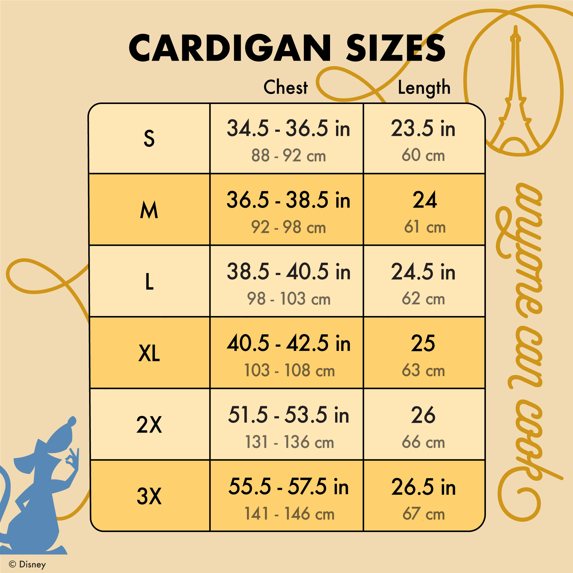 Jacquard art and embroidery bring the design to life. Remy's silhouette is in the lower corner. A swirling design connects him to the rest of the art on the cardigan: an outline of the Eiffel Tower and the embroidery on the sleeve that reads, "Anyone can cook."
