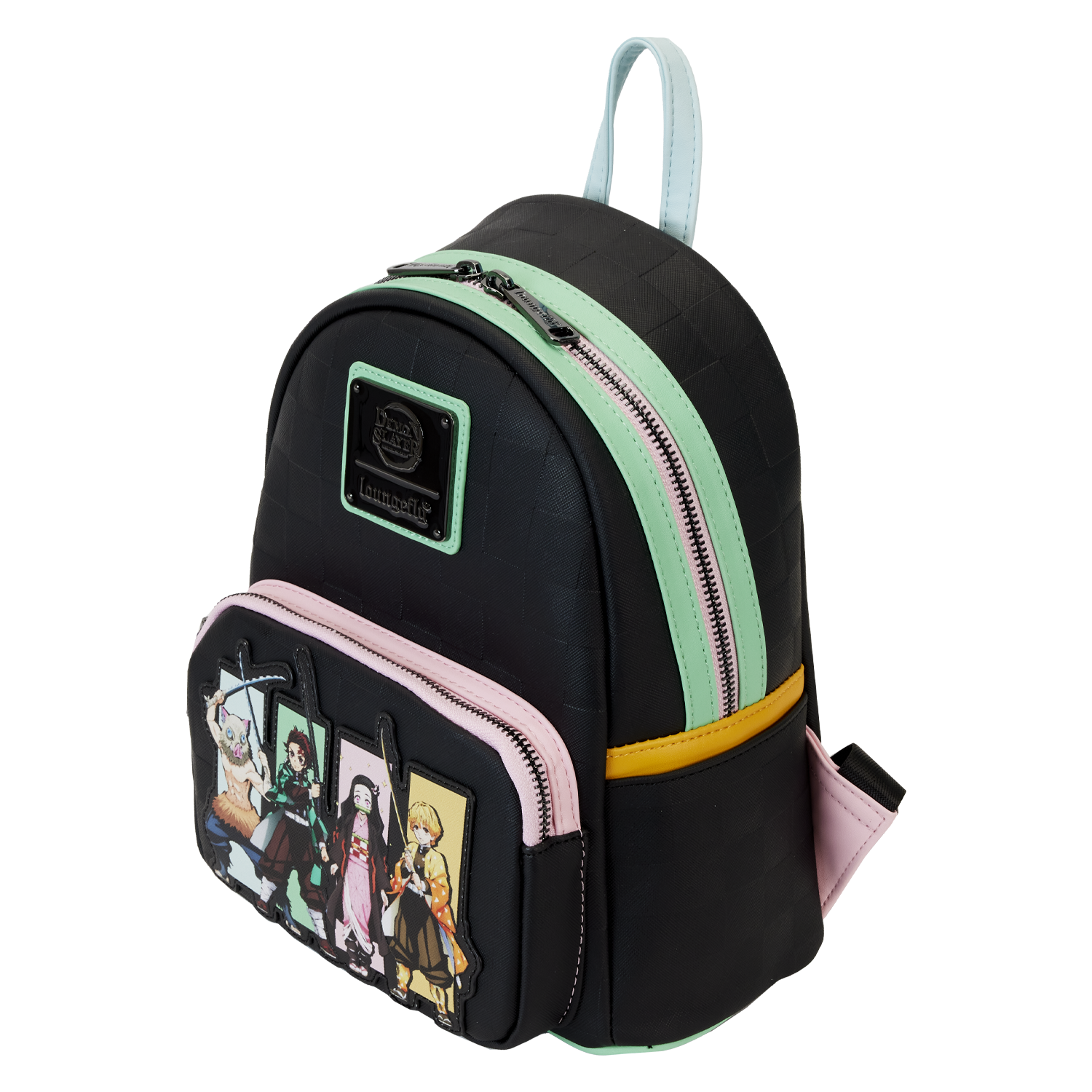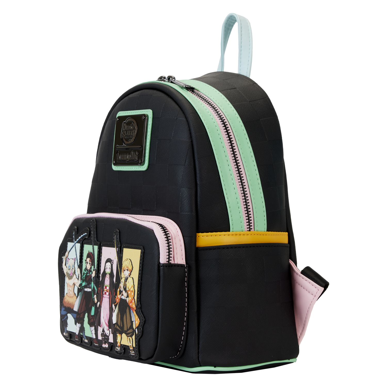 The Loungefly Demon Slayer Group Mini Backpack is made of vegan leather (polyurethane). Backpack has adjustable shoulder straps, side pockets, and shiny gunmetal-colored hardware. Additional features include applique, printed, and debossed details. Take note of the coordinating inside lining.