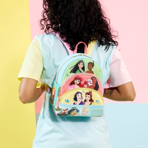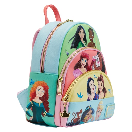 Grab your tiara and prepare for some royal fun, Disney Princess style! Our Loungefly Disney Princess Triple Pocket Mini Backpack is full of character and ready for adventure. Blocks of color pop in shades of blue, pink, and green—and you’ll find plenty of Disney Princesses to keep you company on any journey. The triple pocket design on the front features Jasmine with Abu and Cinderella; Snow White and Belle, surrounded by birds; Ariel and Moana and Pua; and Mulan with Cri-Kee and Tiana with Ray. A shiny gold crown zipper charm tops off the look. On the side pockets, Rapunzel and Pascal make an appearance on one side, while Merida and a Will-o’-the Wisp appear on the other side. On the back, Pocahontas, Aurora, and Flit team up to say hello. It’s the perfect accessory for making a stylish entrance—or for turning everyday trips into magical outings.