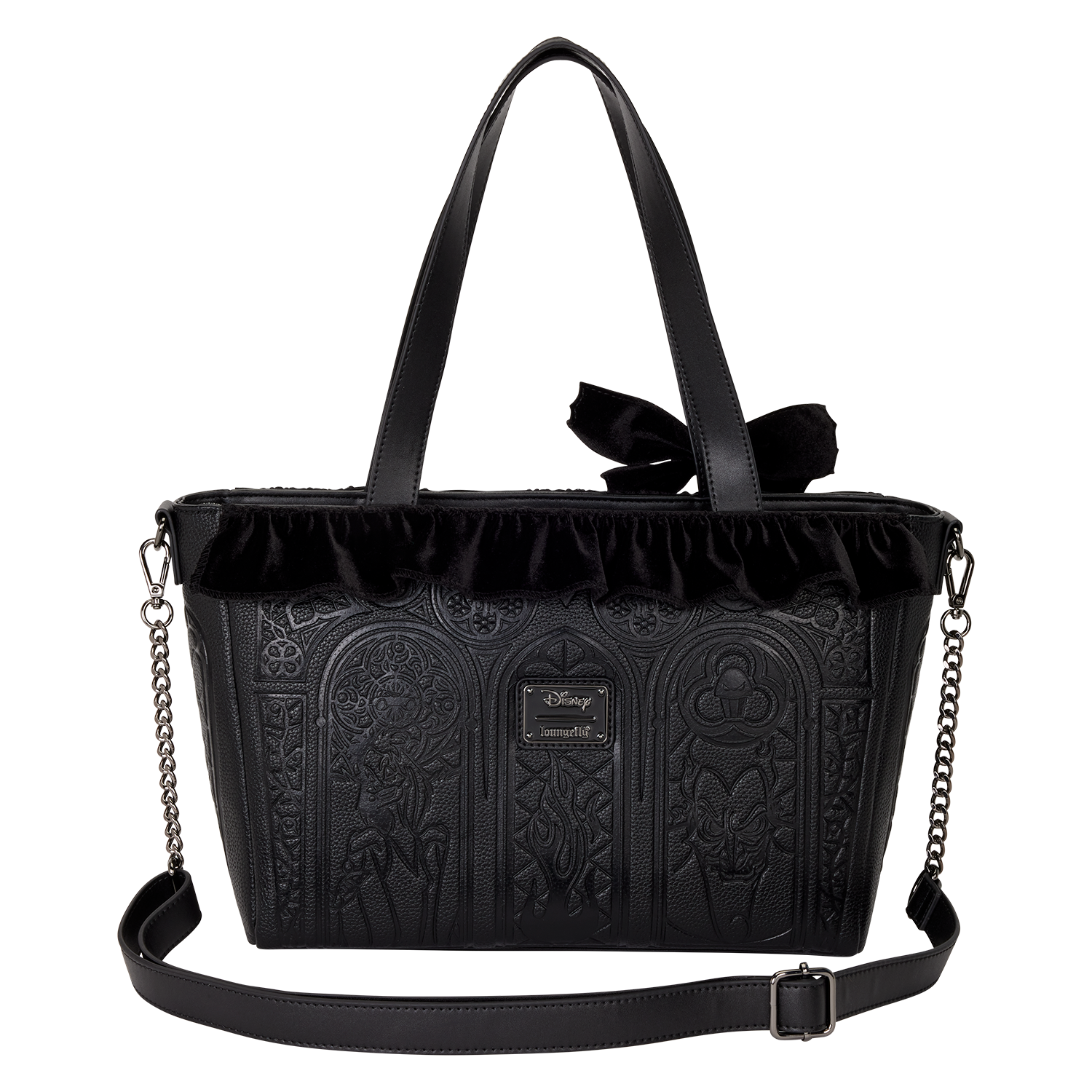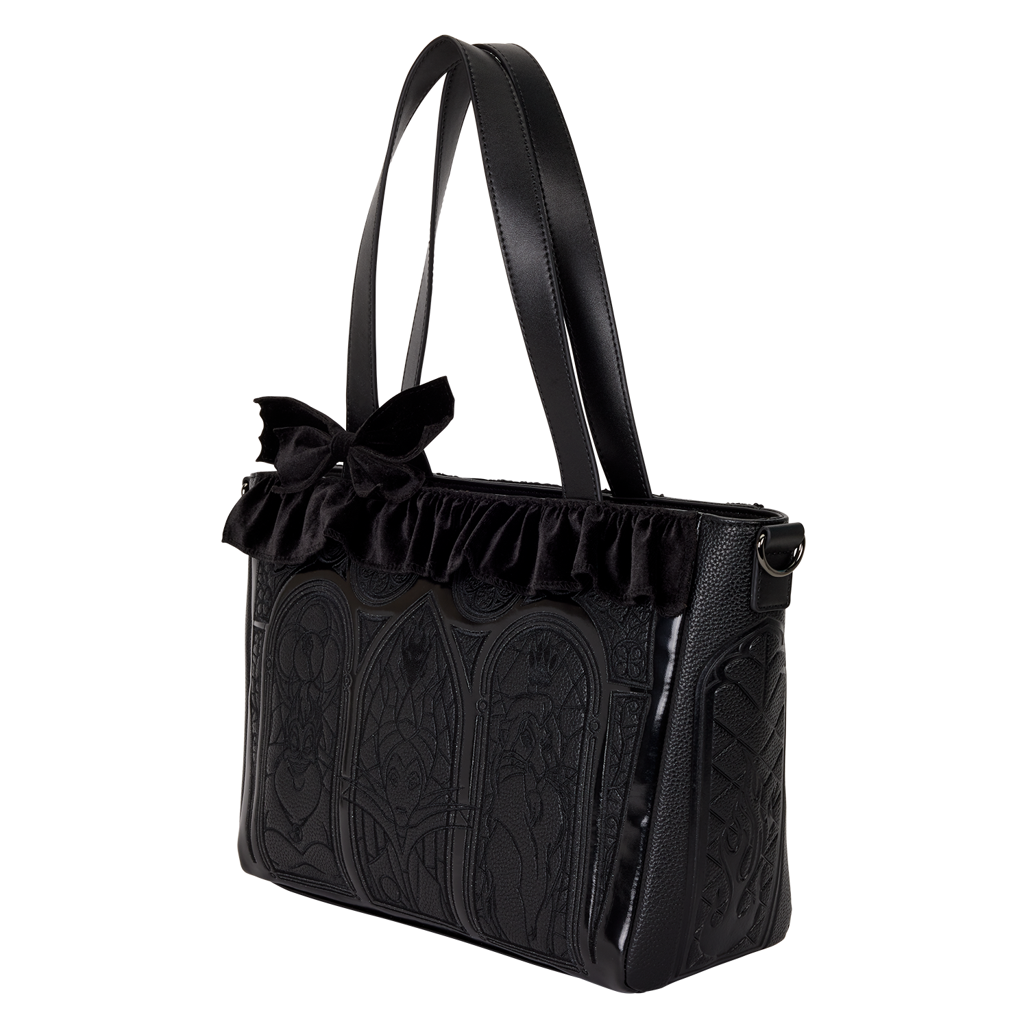 This tote bag is the Disney Villain fashion statement you've been looking for. This bag features a velvet ruffle along the top. Below, you'll find stained-glass-style windows with 3D embroidery that depicts your fav Disney Villains. Metallic faux leather and a velvet bow bring the whole look together.