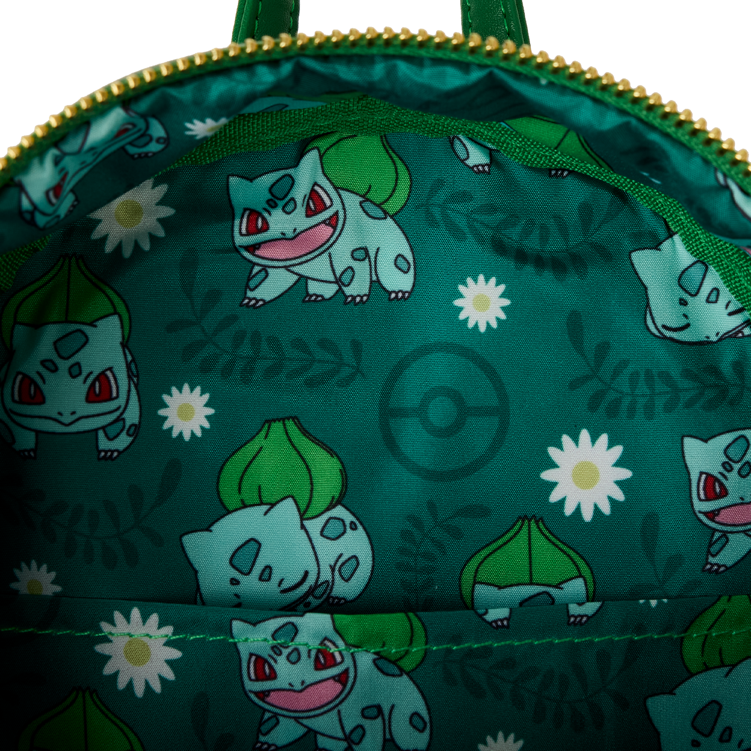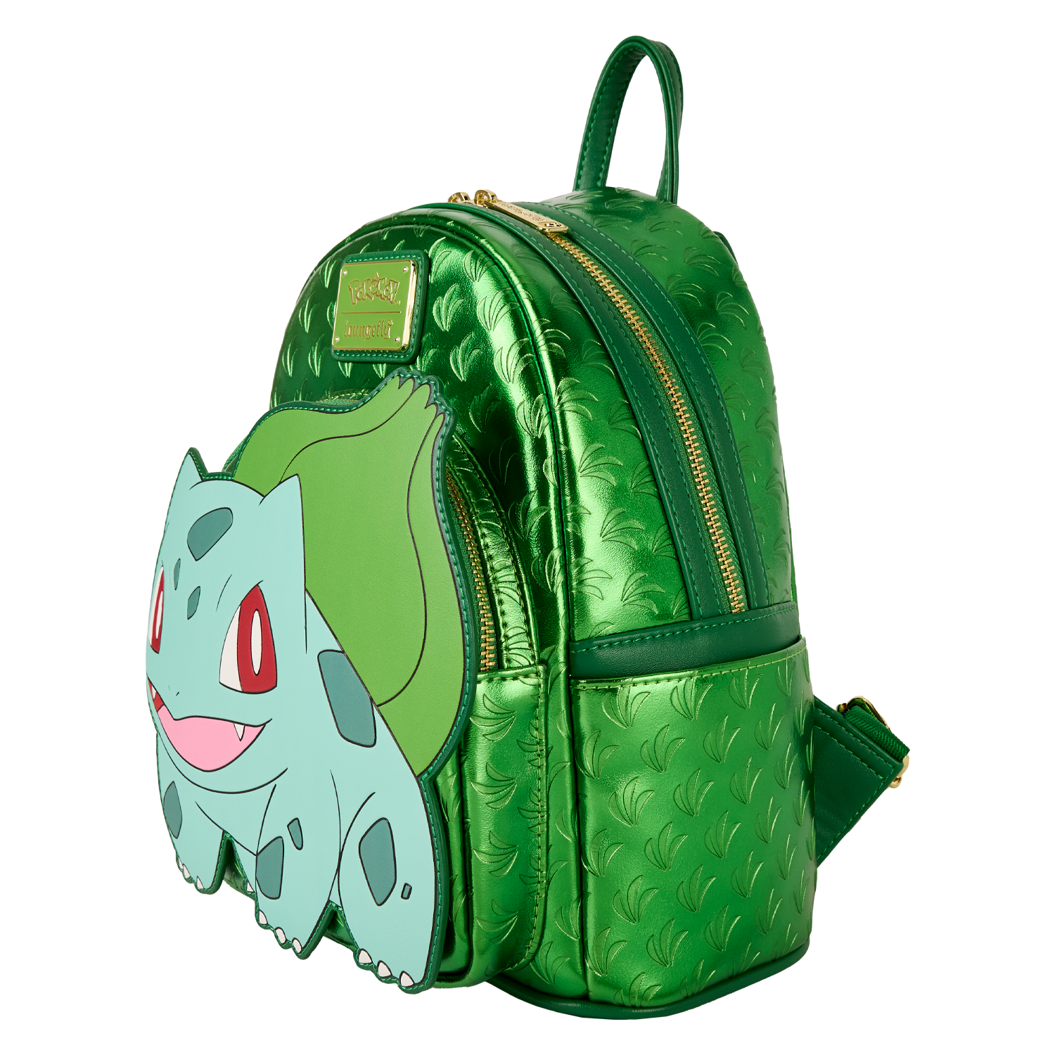 This mini backpack features Bulbasaur on the front pocket. The rest of the bag is made from a metallic green faux leather and features a debossed pattern of grass all over.