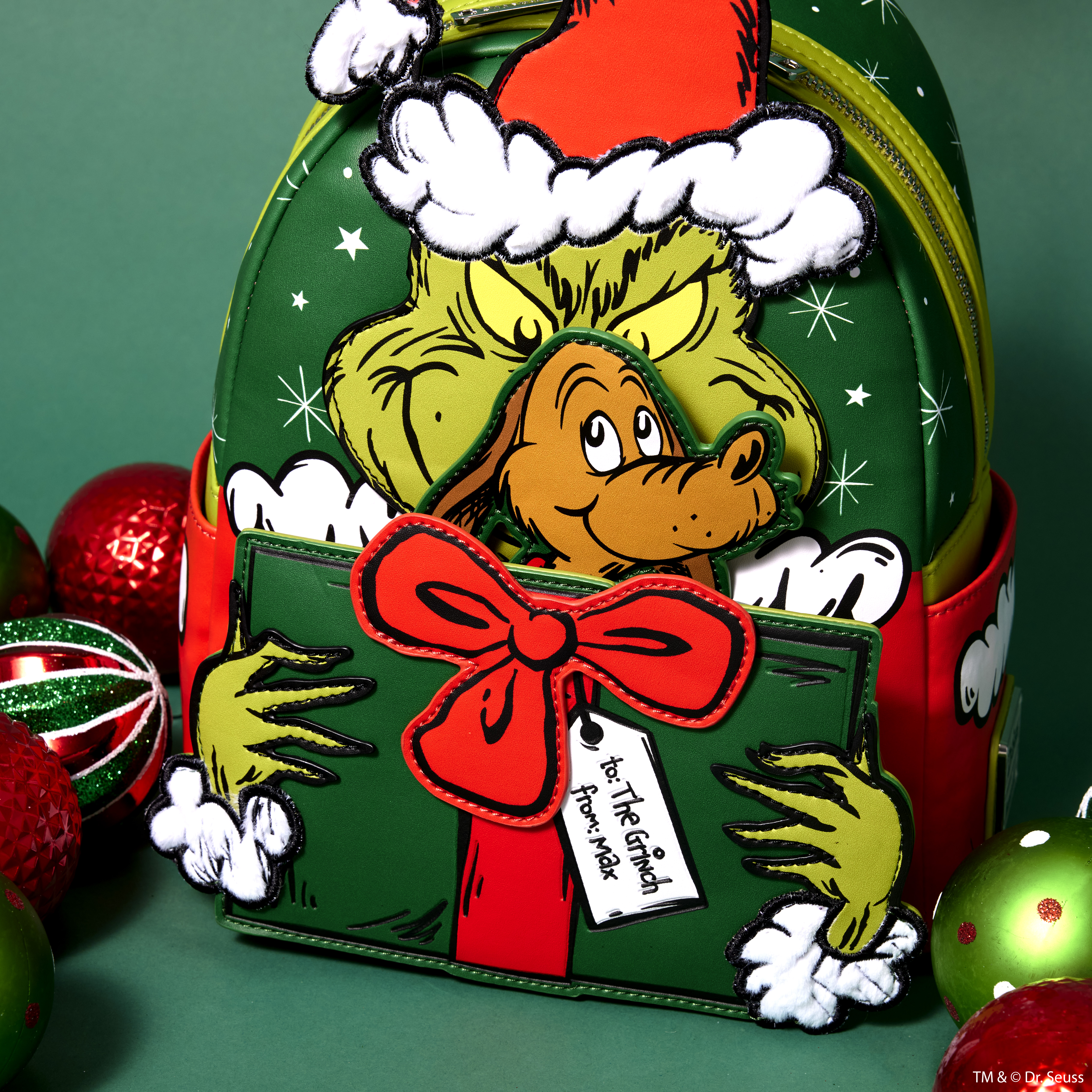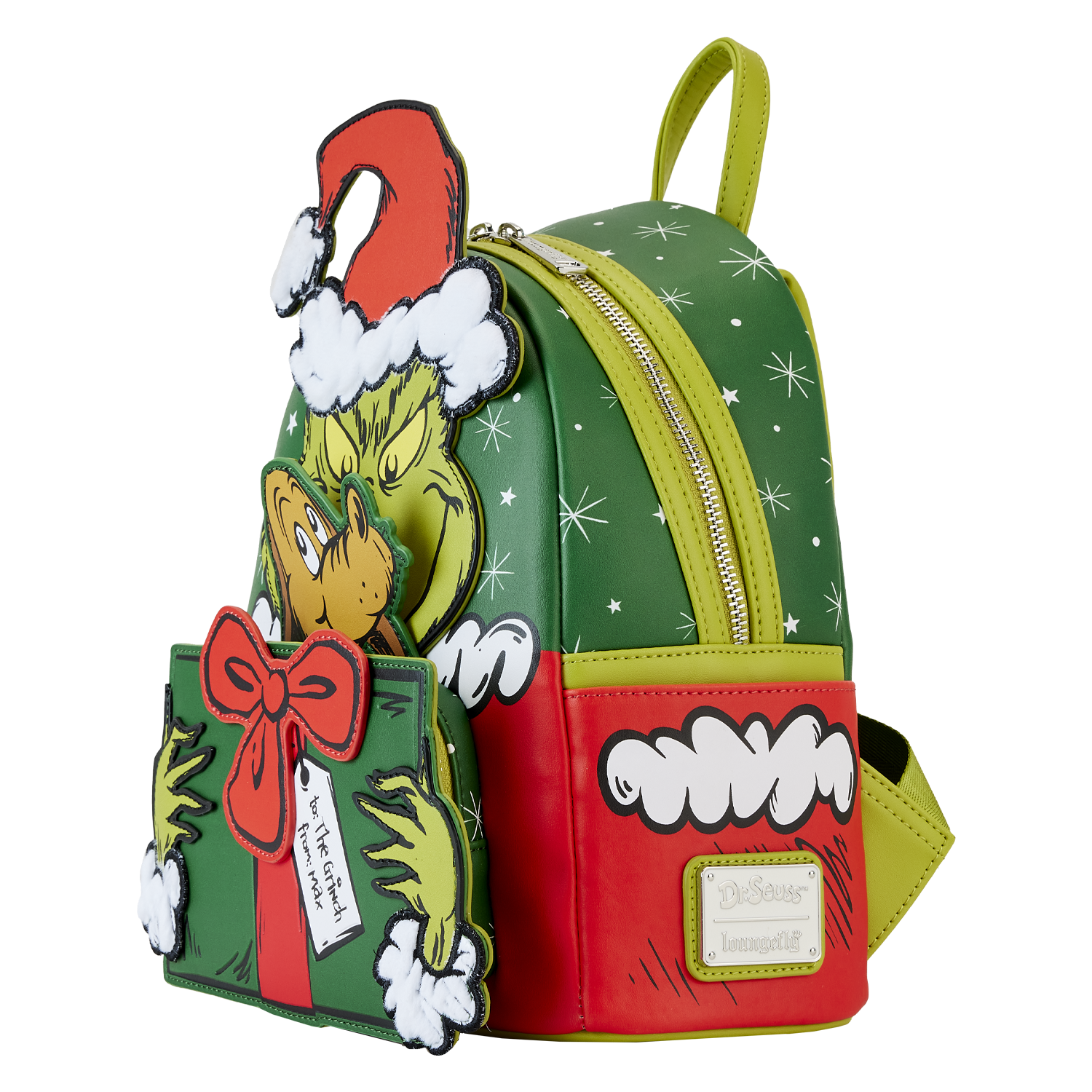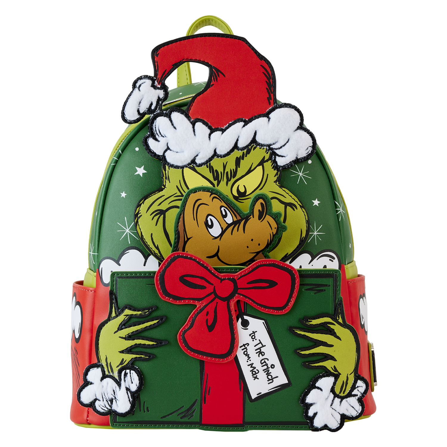 Hitch up your sleigh and slide into Whoville in style. Our Loungefly Dr. Seuss Santa Grinch Cosplay Mini Backpack will steal your heart. On the front, The Grinch comes to life in applique detail, his red Santa hat poking up over the top of the backpack. On the front zipped compartment, he wraps his arms around a present. An interactive pop-up feature allows Max to peek up out of the top of the present. Faux fur accents on the trim of The Grinch's hat add an authentic touch. And, a sentimental story unfolds upon closer inspection of the tag that accompanies the present. It seems that Max has remembered to give even The Grinch a gift. Applique fur details continue on the side pockets, and on the back, Max makes an encore appearance surrounded by presents. Transform even the chilliest of days into warmhearted adventures with this festive backpack.